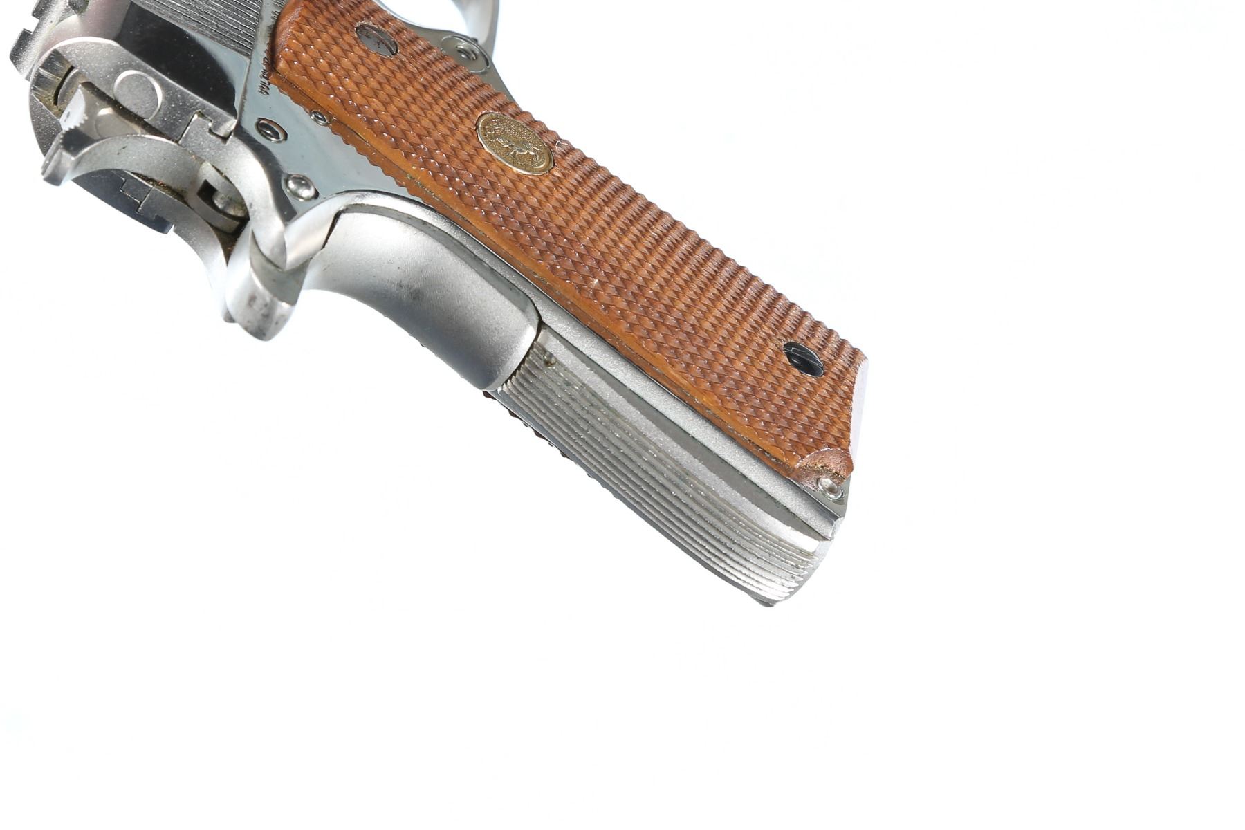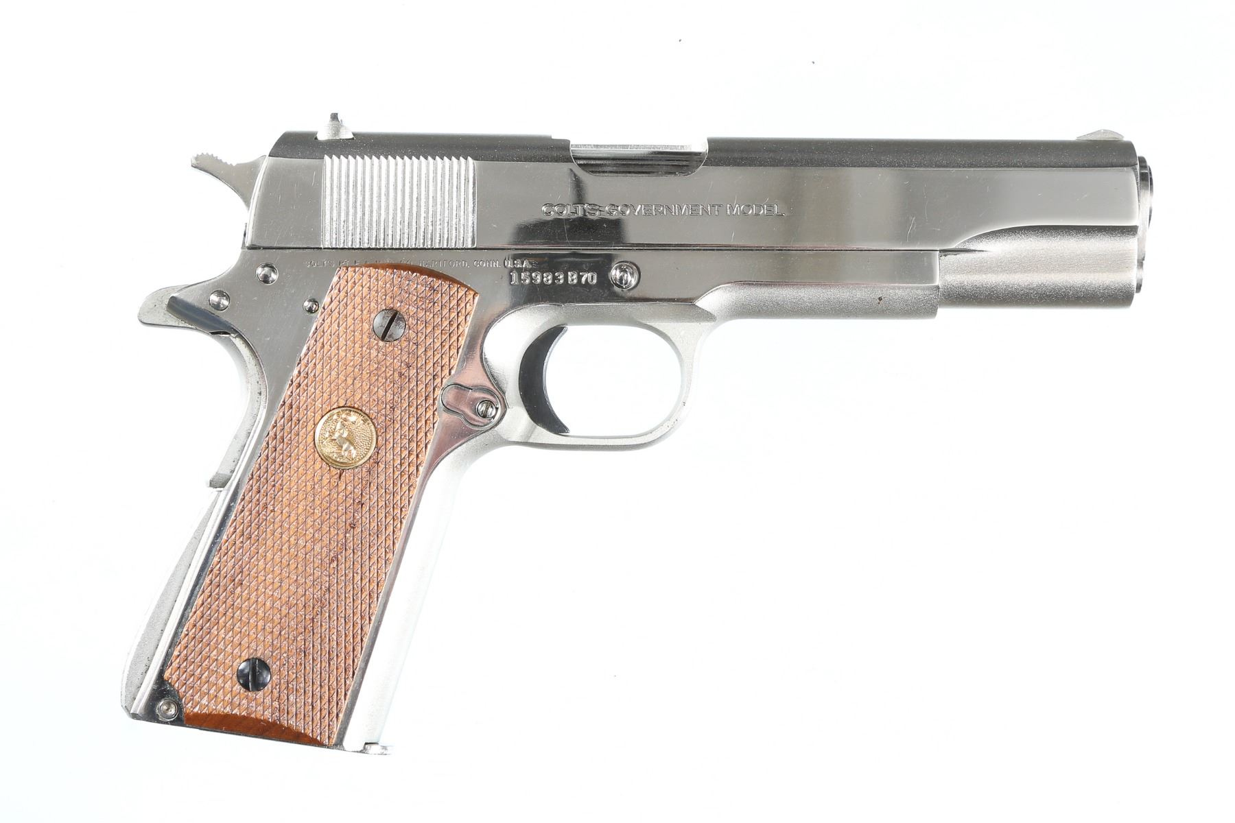 .45 ACP Serial # 15983B70 Colt Series 70 MK IV Government Model 45 with factory nickel finish. Checkered walnut grips with gold Rampant Colt medallions. 5" Bbl, Nickel 7 round Colt magazine. Mfg 1979. Condition, Very fine with excellent bright bore and mechanically excellent. Some light tarnish and scratches in finish from storage. Barrel 5" Modern