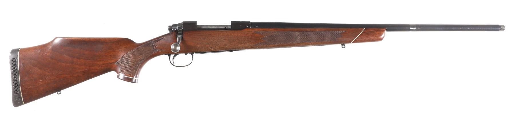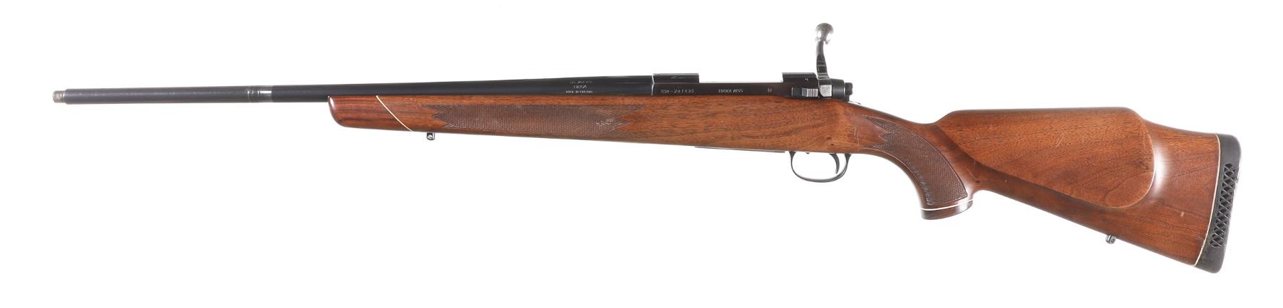 .243 Win Serial # 550-201435 Finnish Tikka Model M55 bolt action sporting rifle with 23" threaded muzzle Bbl chambered for 243. 5 round box magazine with Sako pattern bolt. Walnut monte Carlo stock with recoil pad, `14" LOP. Condition. Very fine with excellent bore. Metal retain over 80% blue with loss on Bbl from Supressor use and edge wear Stock is very good with some handling marks. Barrel 23" 1988 Modern