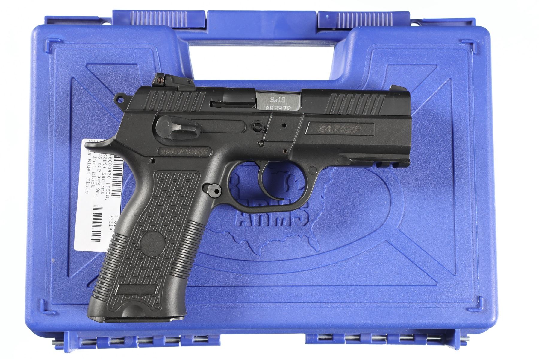 9mm Serial # T1102-13CA03970 SAR Arms polymer pistol 9mm 17 round magazine with single / double action 3 dot sights with manual safety. In factory box. Condition as new in factory box. Barrel 3.8" Modern