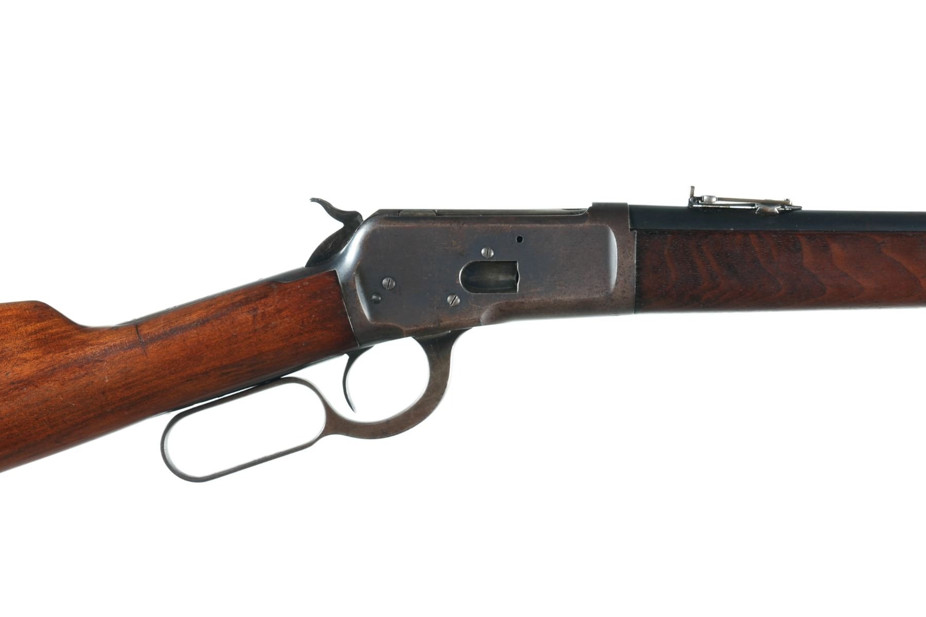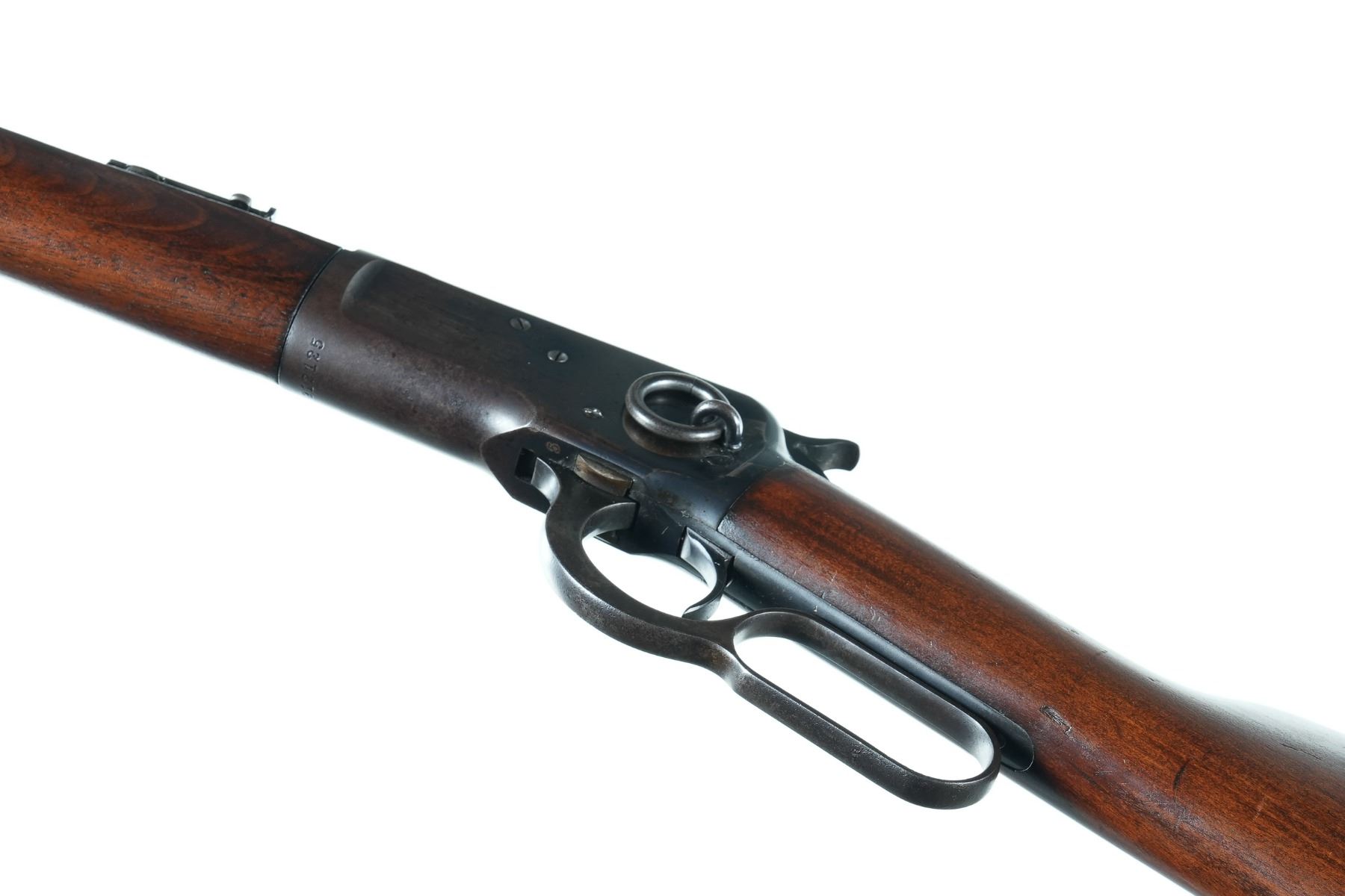 .38 wcf Serial # 912125 Winchester model 1892 Saddle Ring carbine Cal, 38-40 WCF Factory Gum wood stocks with ladder adjustable rear sight and post mounted blade front sight. Condition,. Very fine with 60% actual factory blue and brilliant bright bore. Excellent stocks. Mechanically fine. Mfg 1922 Barrel 20" C&R
