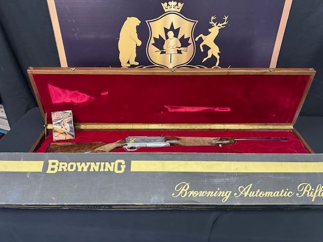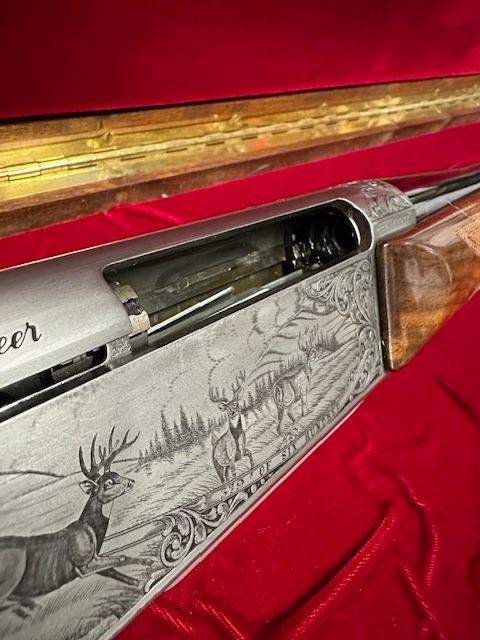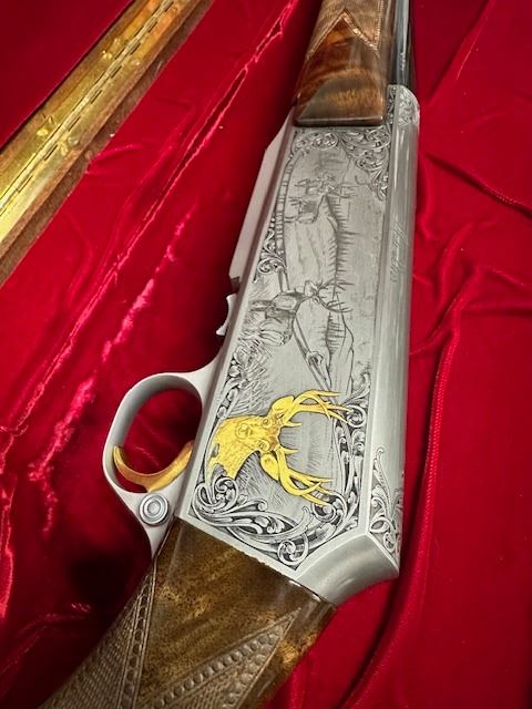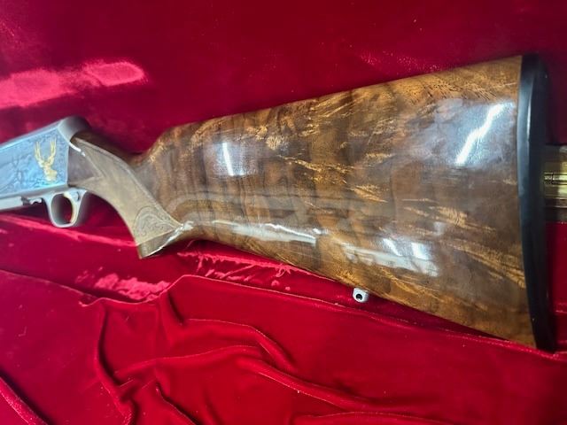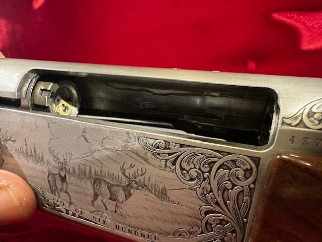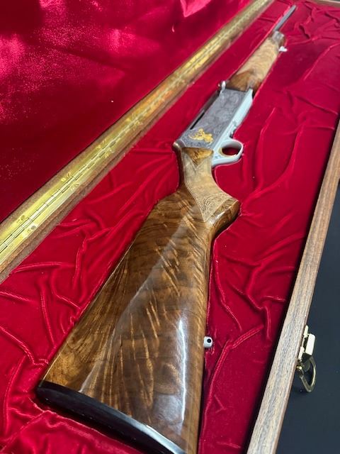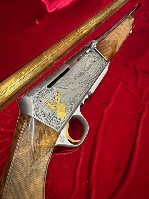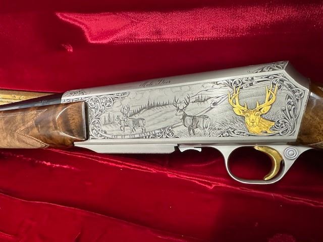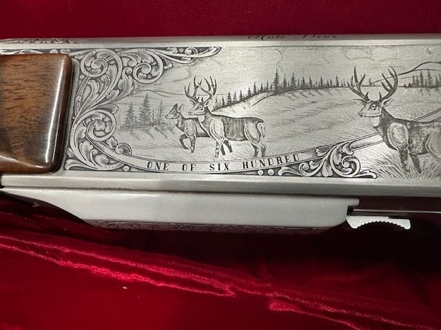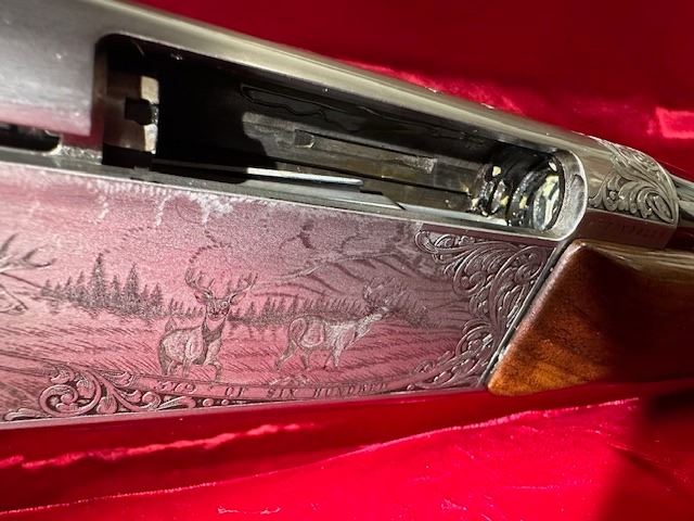 There were only 600 of these rifles manufactured in a limited edition run. This rifle is number 379 of 600. The left side of the receiver is signed "J.DUJARDIN" and has floral scroll designs around the outside edge with detailed engraving of three mule deer in a field and there is a gold inlaid bust of a mule deer at the rear. The right side of the receiver is signed "R.COENEN" and has three whitetail deer in a field with a ribbon at the bottom engraved "379 OF SIX HUNDRED" and a gold inlaid bust of a whitetail deer at the rear. The top of the receiver, floor plate and trigger guard also have floral scroll designs. Mounted on a beautifully figured multi-point checkered walnut forearm with carved floral scroll at the front of the checkering and carved circles around the other edges of the checkering. The pistol grip stock also has carved circles around the outside edges of the checkering with carved floral scroll at the bottom. There is a plastic Browning buttplate. With a red velvet lined walnut case.