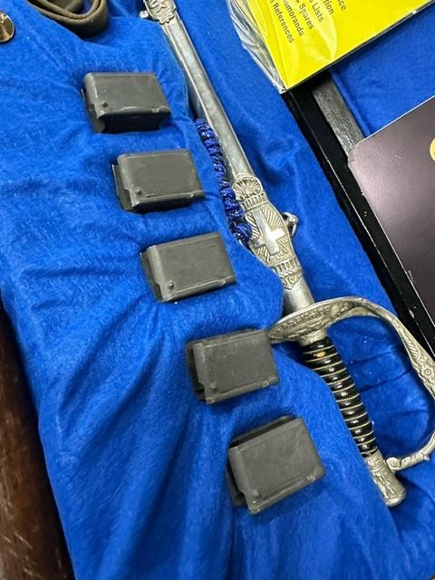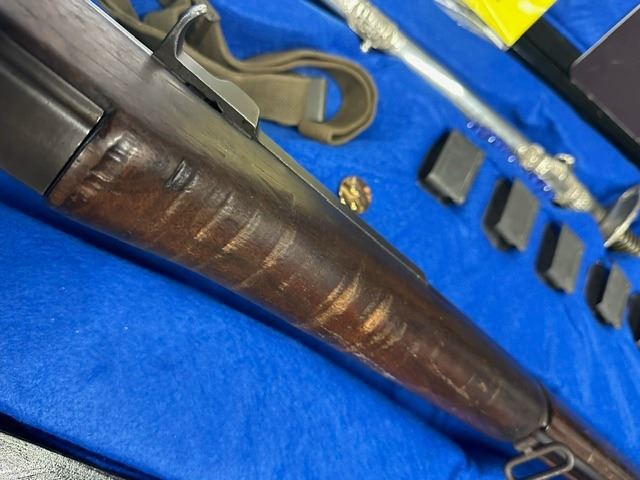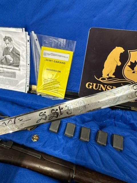 COMES WITH CASE, SWORD SOCIÉTÉ ST-JEAN-BAPTISTE, 5 CLIPS, M1 GARAND HANDBOOK, M1 GARAND CLEANING KIT, SLING AND 2 POUCH.