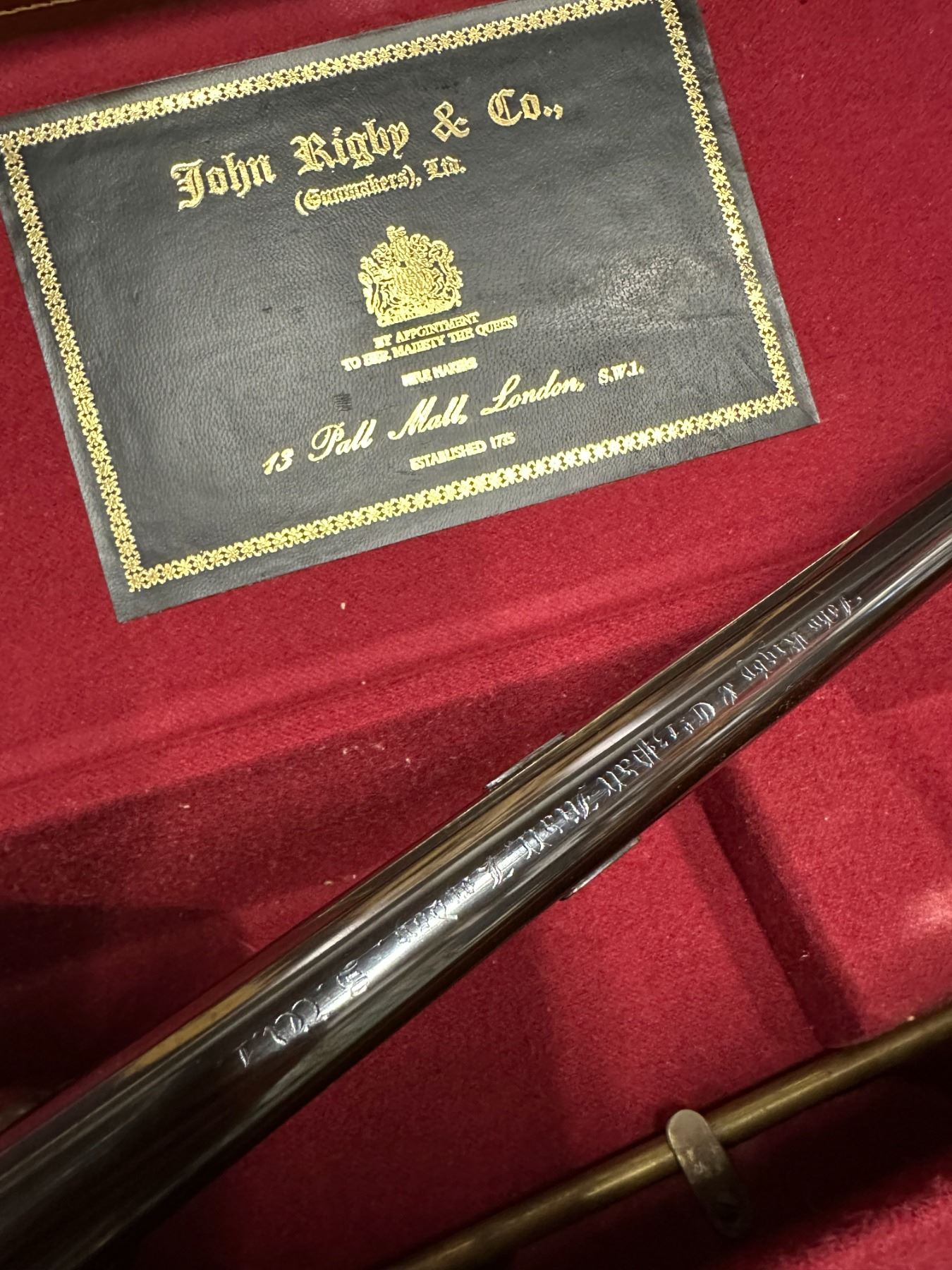 The barrel is engraved "John. Rigby & Co., 13 Pall Mall, London, SW1"