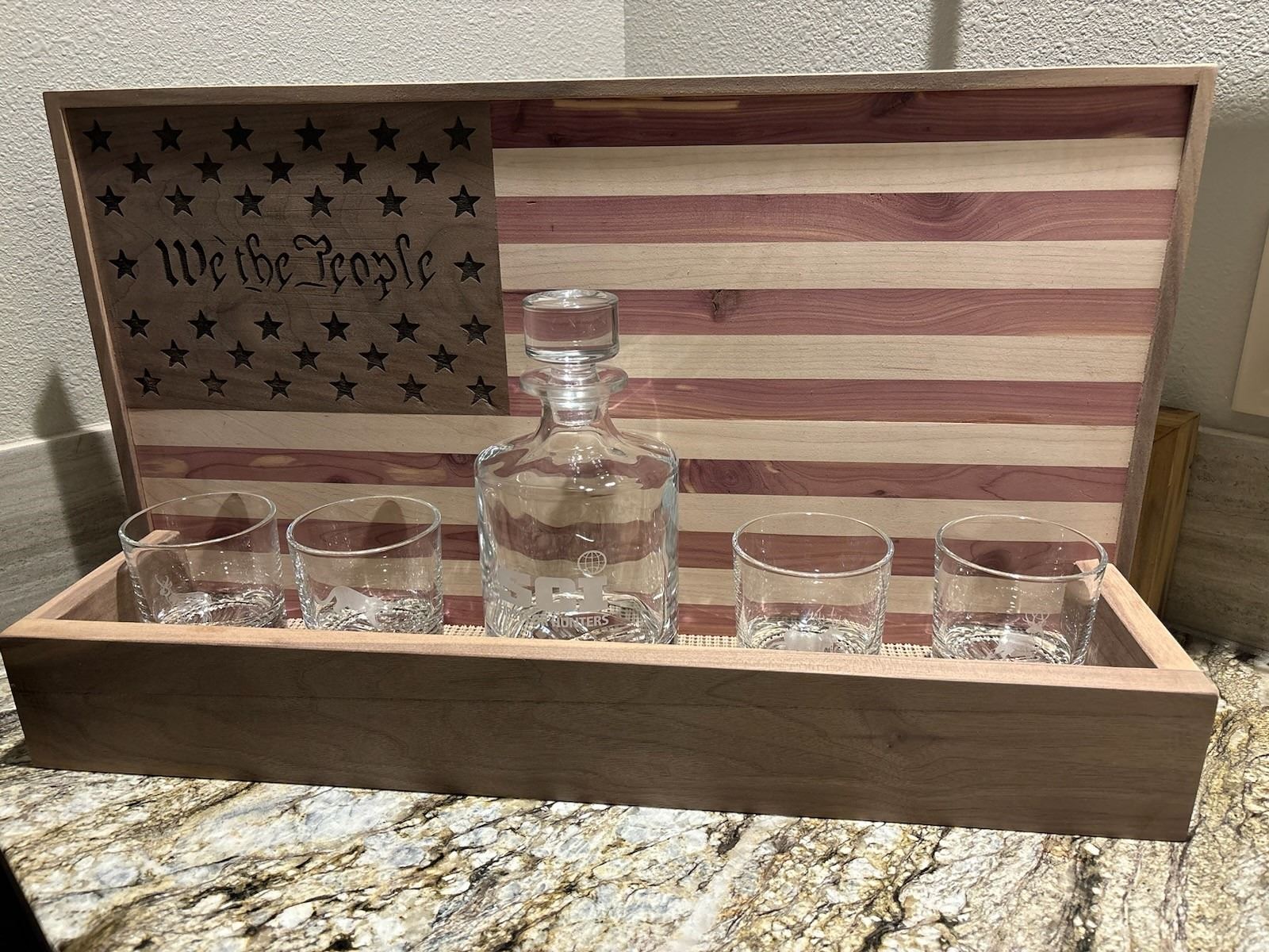 Includes a full sized decanter engraved with the GDC SCI logo and four scotch glasses engraved with an elk, mountain lion, antelope, and a mule deer.