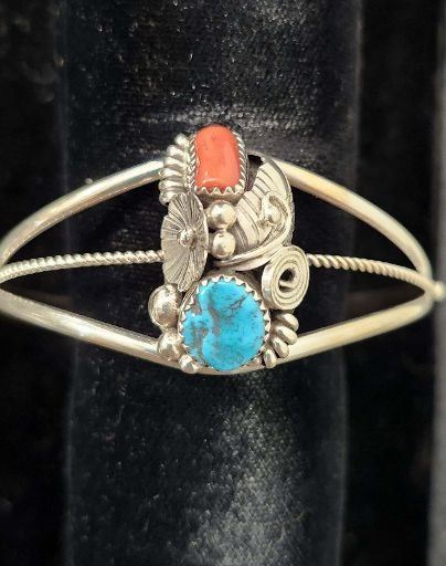 Sterling silver turquoise and coral bracelet handmade by Max Callidito, Navajo Silversmith, Continental Divide, NM