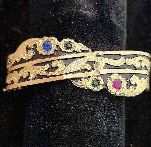 Black / Gold with semi precious stones bracelet handmade by Stacy Curly, Navajo Silversmith, Continental Divide, NM