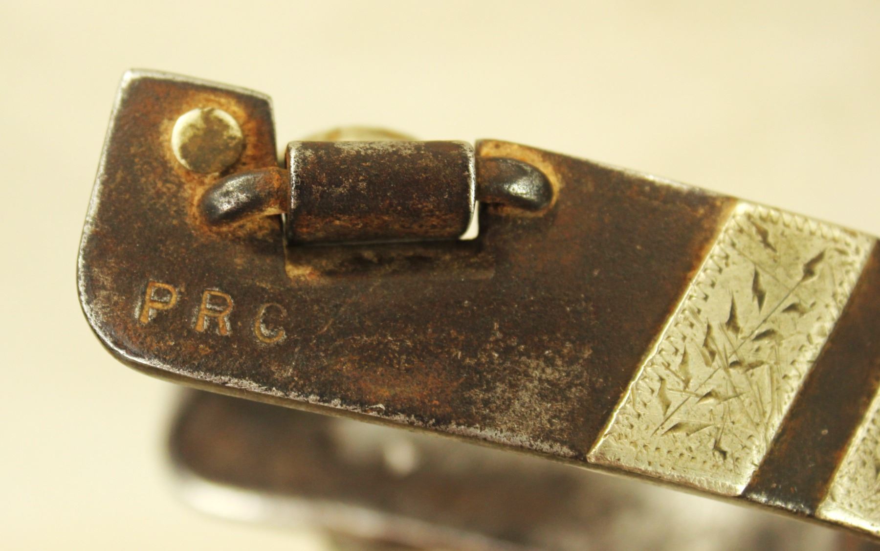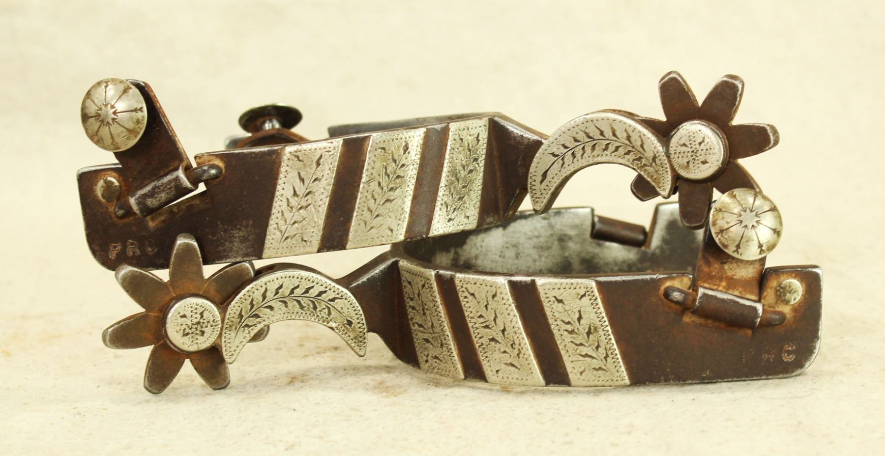 An intriguing pair of double mounted spurs with beautifully mounted two-tone heelbands, cresent moon shanks, and swinging buttons. Maker marked "PRC".