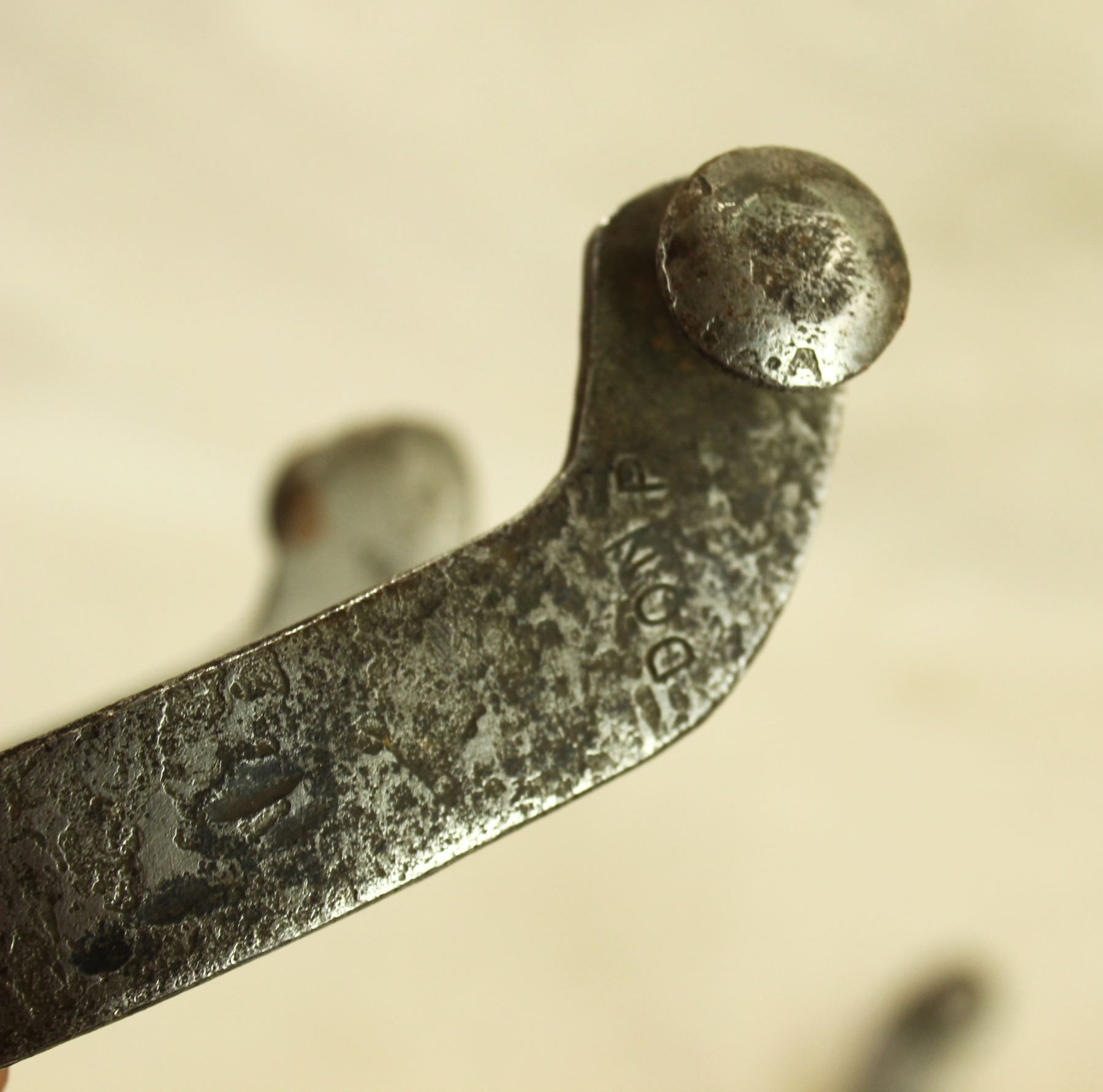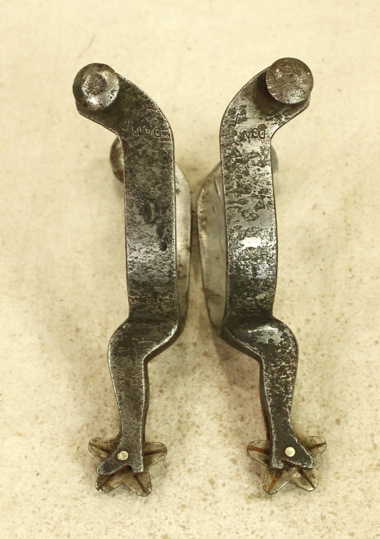 A Texas style pair of single mounted spurs with two-tone overlay and 5 point star rowels, finished by Don P maker markings.