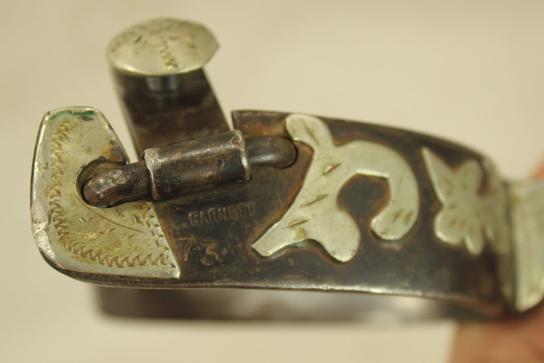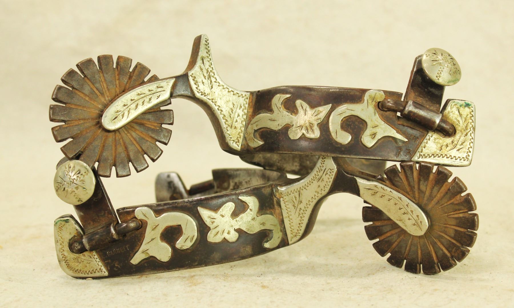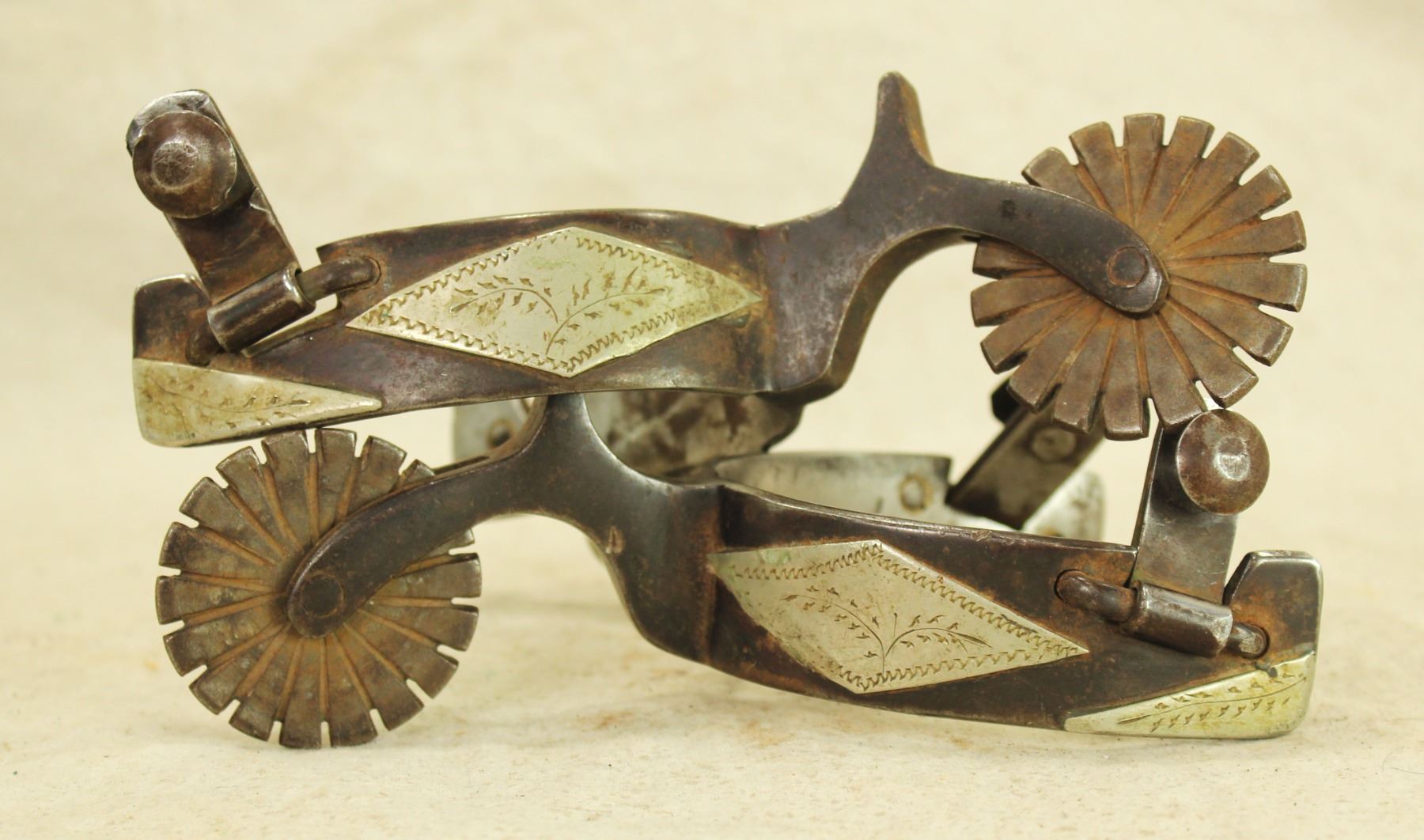 Interesting Texas style spurs, double mounted, with attractive Kelly Bro's Dakota style shanks and huge rowels. Nicely maker marked and numbered.
