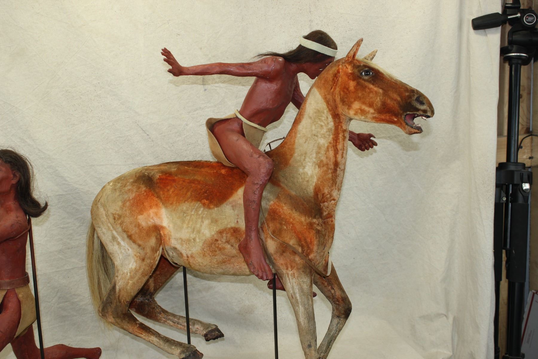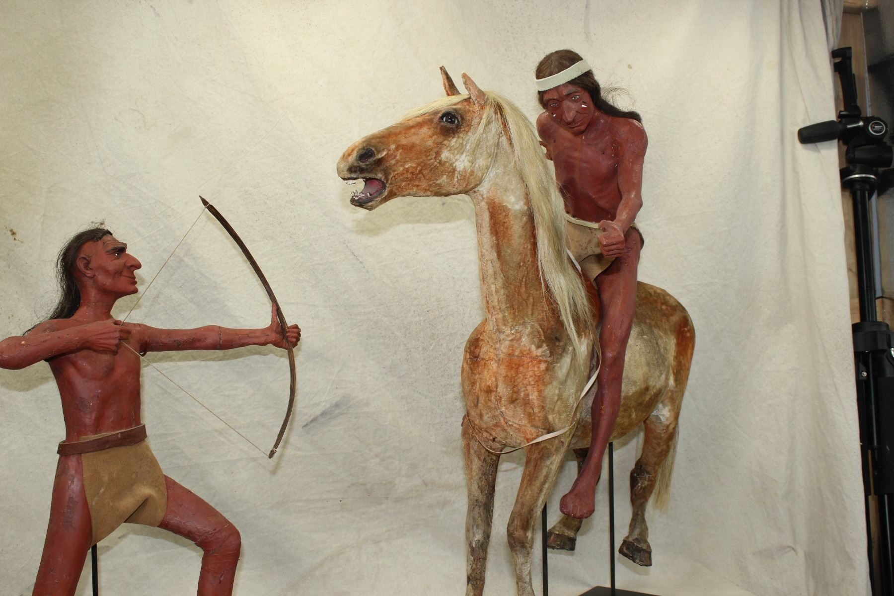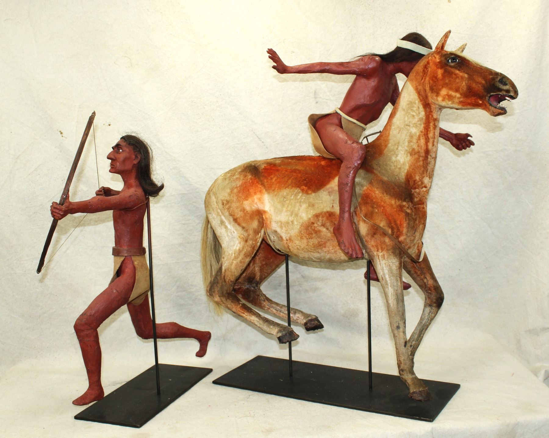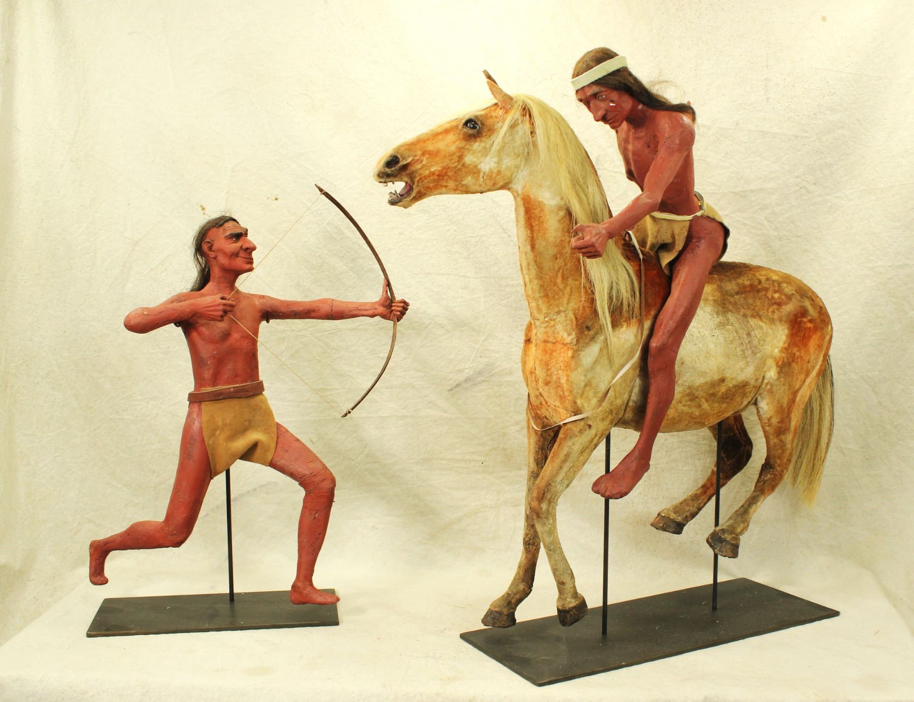 An interesting grouping of two hand crafted Indian models, used as display figures, one riding a horse, which is amazingly realisticly made, to include its paint horse hide. Dimensions of 26"x 28".