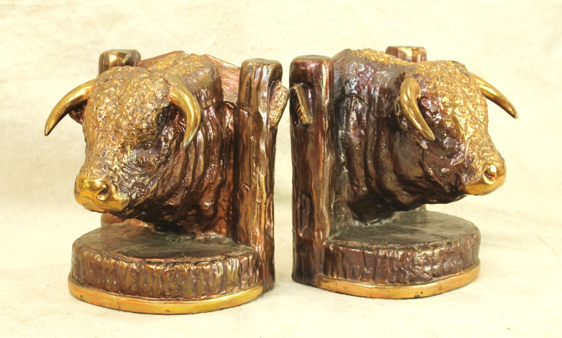 A very nice pair of antique bookends, of large hereford steer heads with an antiqued copper finish. Measuring 6"x 7".