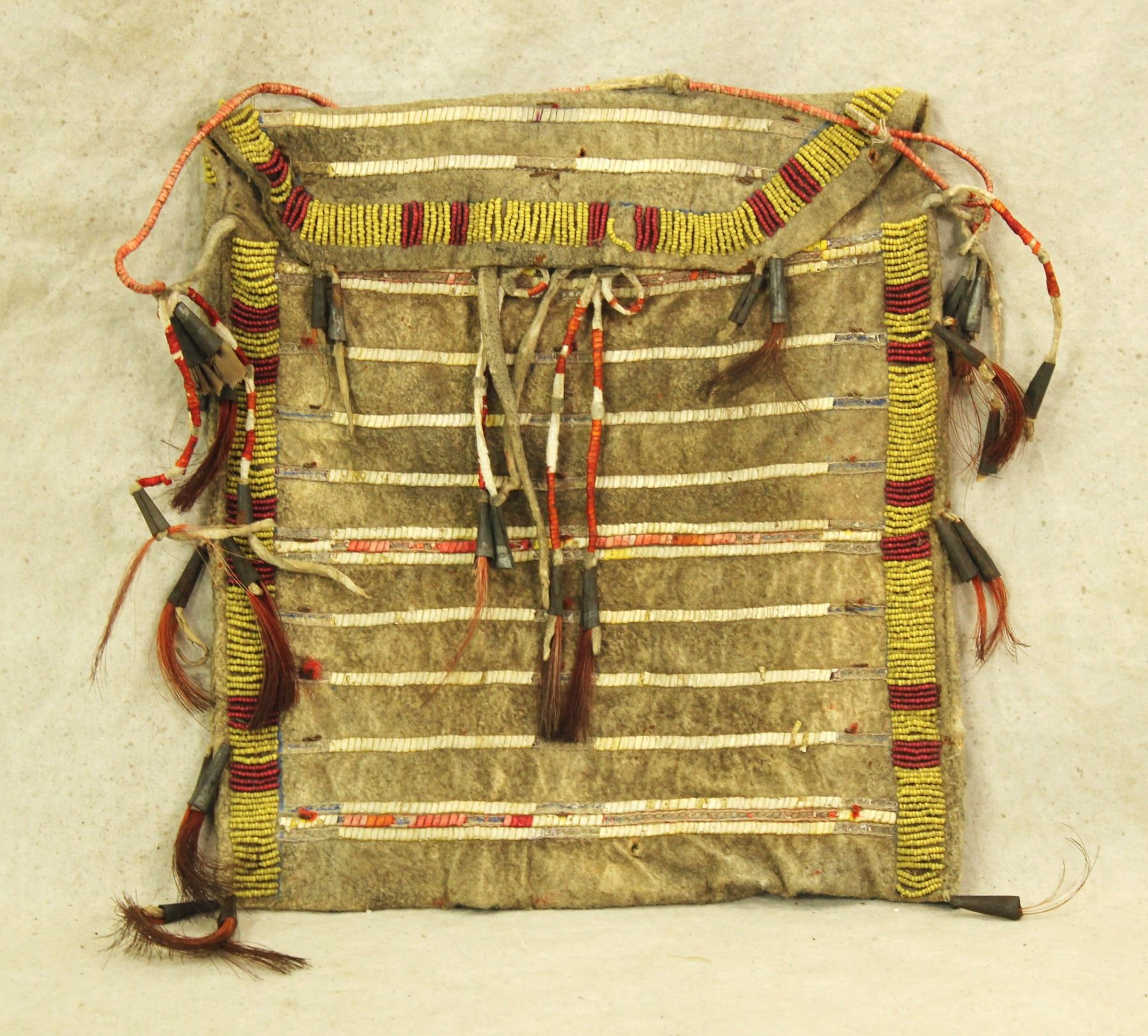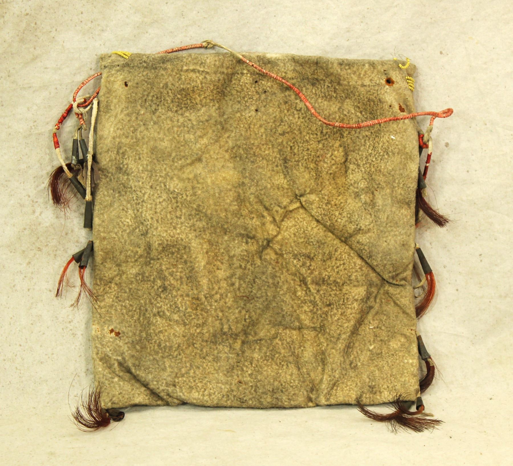 Showing great authenticity, this Northern Plains hide bag, nicely accented with bead and quillwork, using greasy yellow and white heart beads. Measuring 9"x 10".