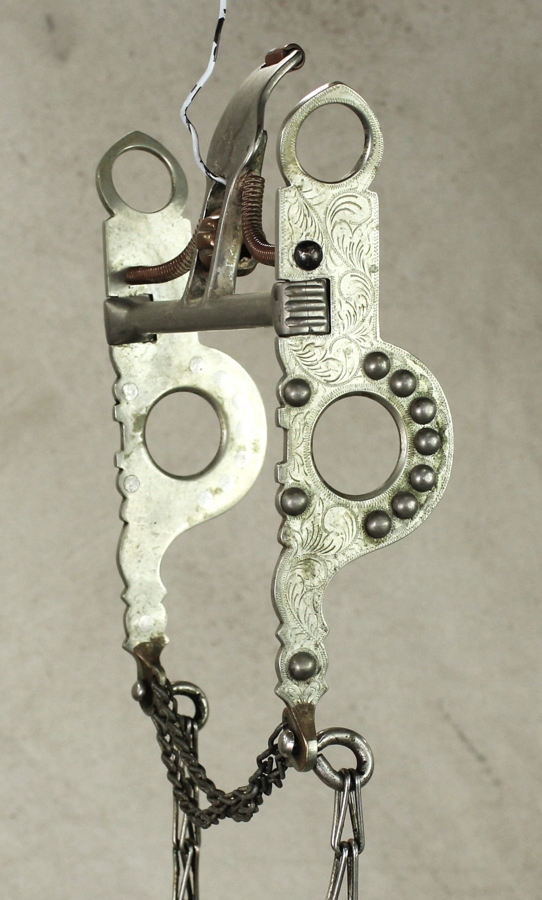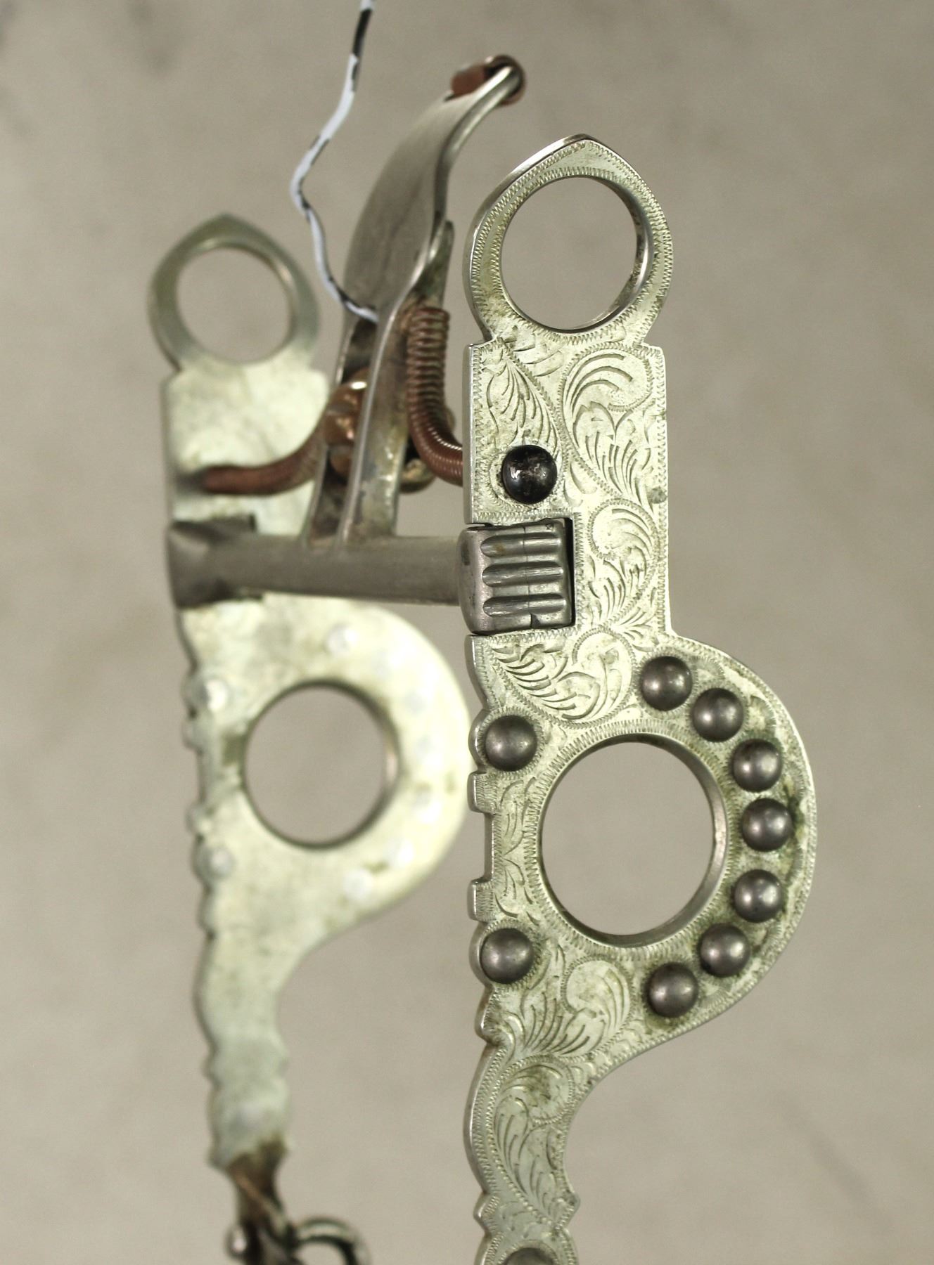 An attractive large California style monel spade bit with engraved cheeks complimented by small domes and a nice spade mouthpiece.