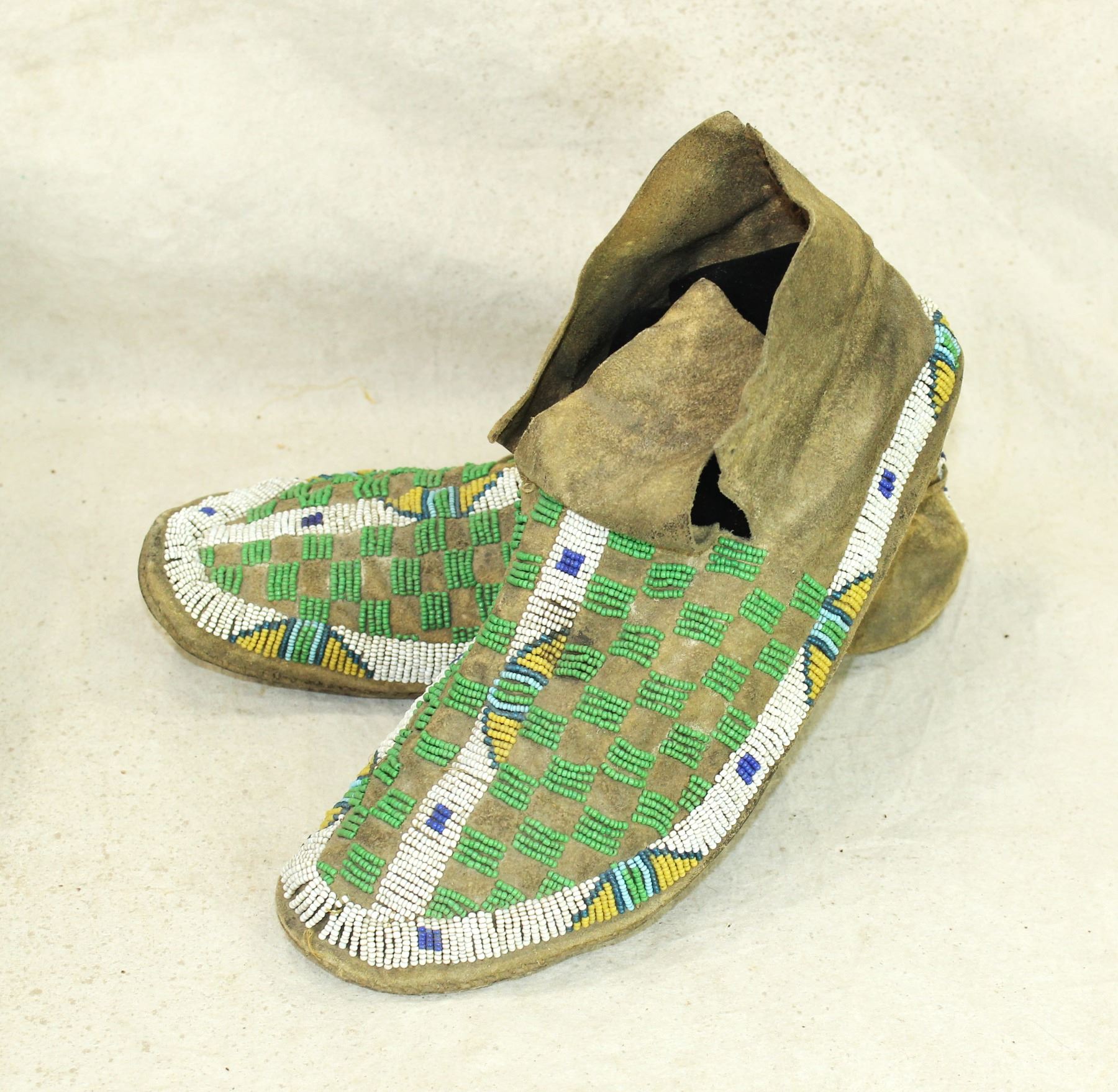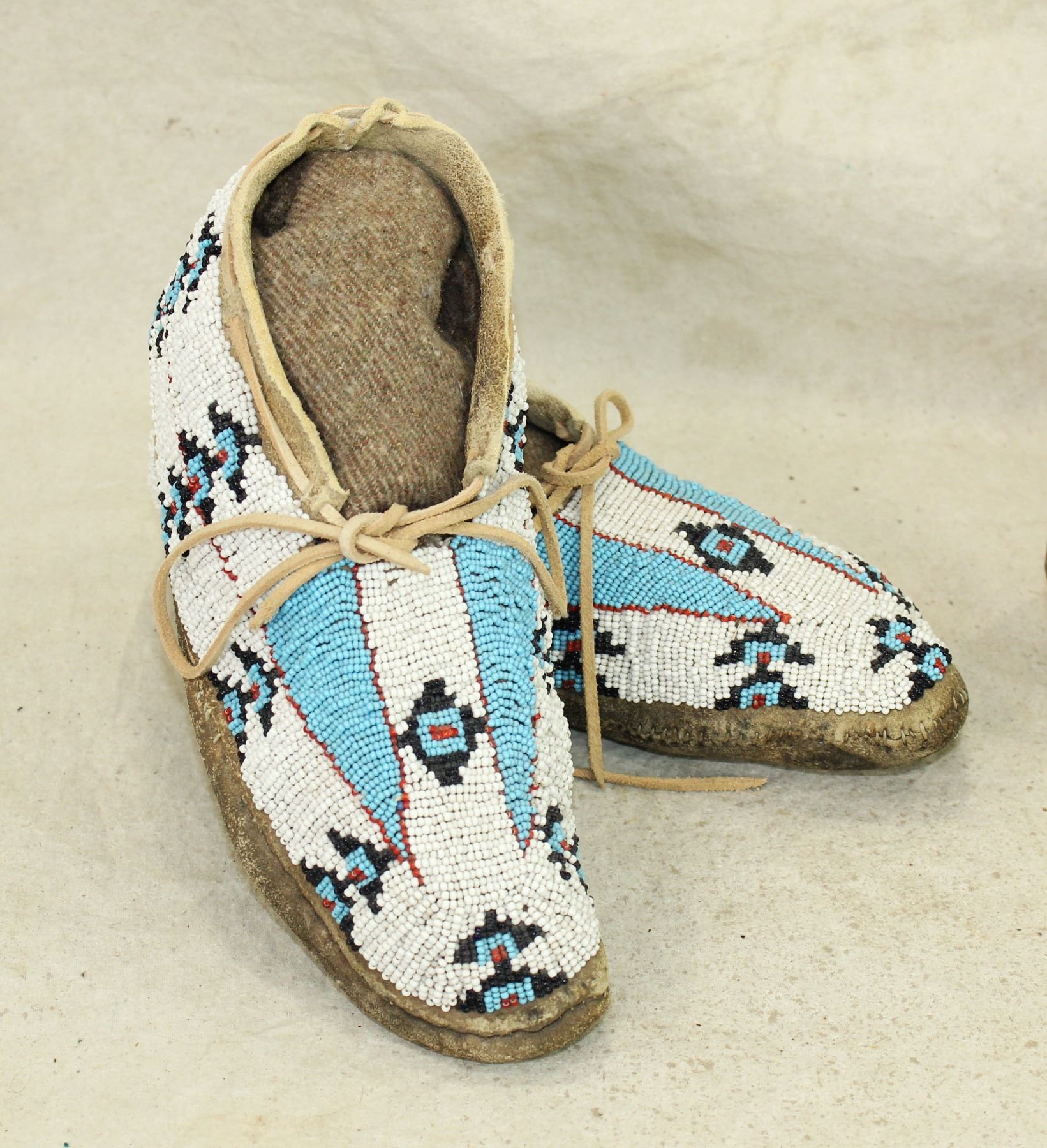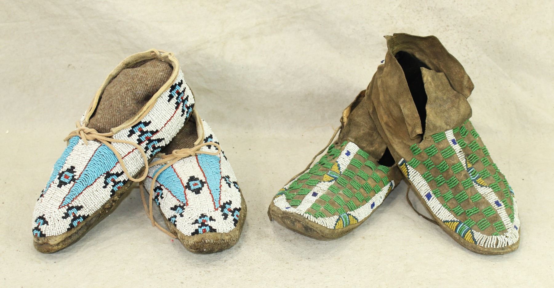A lot of two pair of appealing Northern Plains moccasins, circa 1890's, with desirable beaded patterns, and early beads. Both pair are adult sizes, showing moderate wear.