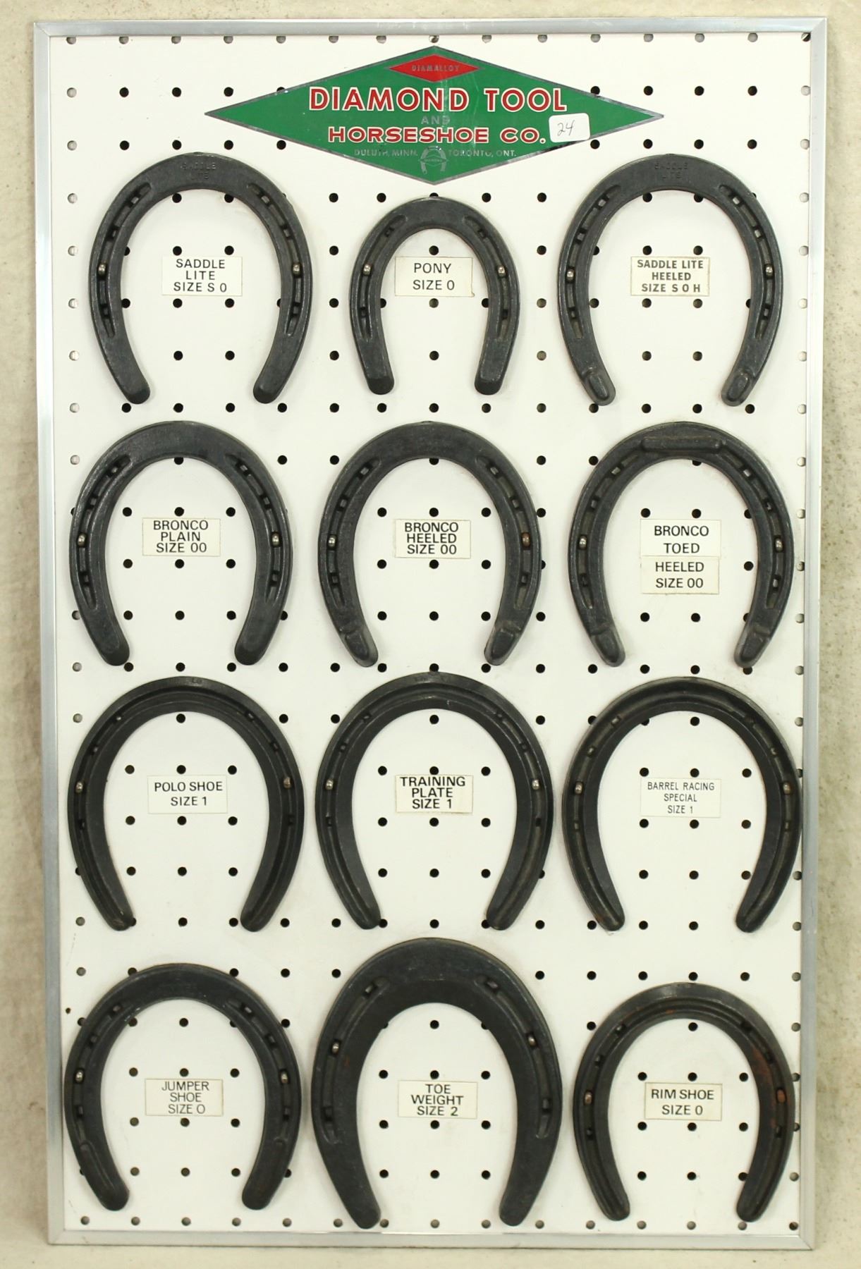 An appealing advertising display of the selection of 12 different horseshoes, in excellent condition, measuring 15"x 24".