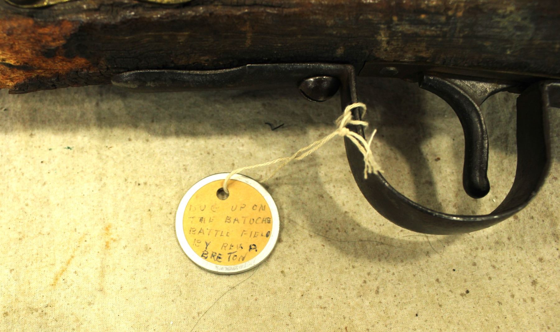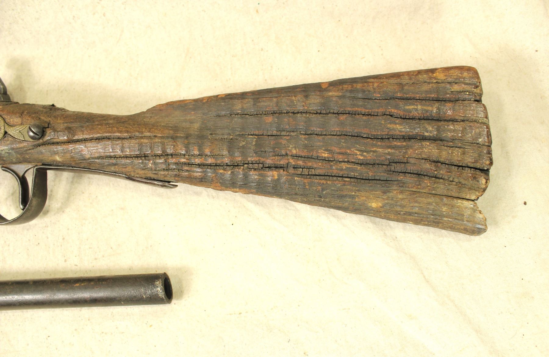 Interesting pair of Northwest Indian Trade guns with part octagon barrels and Flintlock ignition. Circa 1830-50. Traditional brass serpent decoration and blacksmith produced trigger guard. Period of use wood stocks are heavily weathered from exposure to the elements. Smoothbore for Buck & Ball and or solid projectiles. These are the earlier examples of the westward expansion period of trade guns. Not frequently found outside museum exhibition.