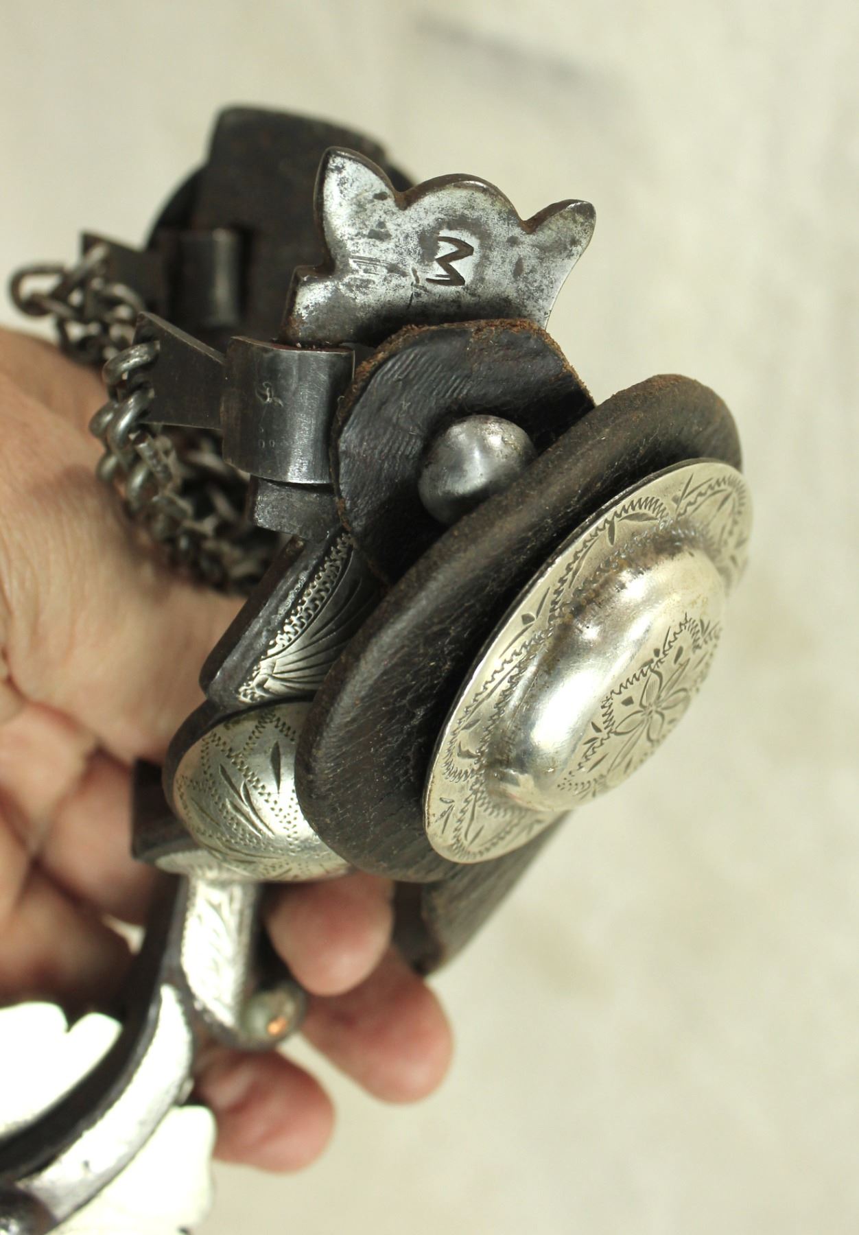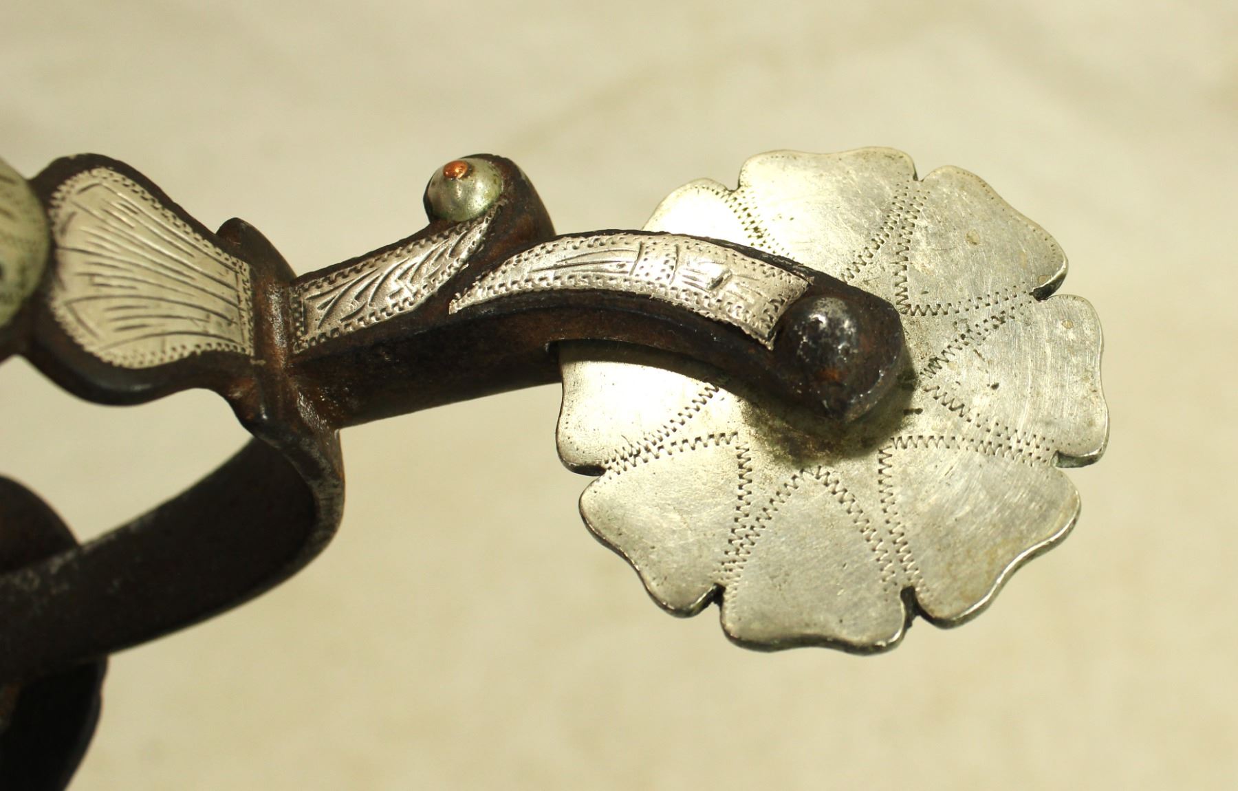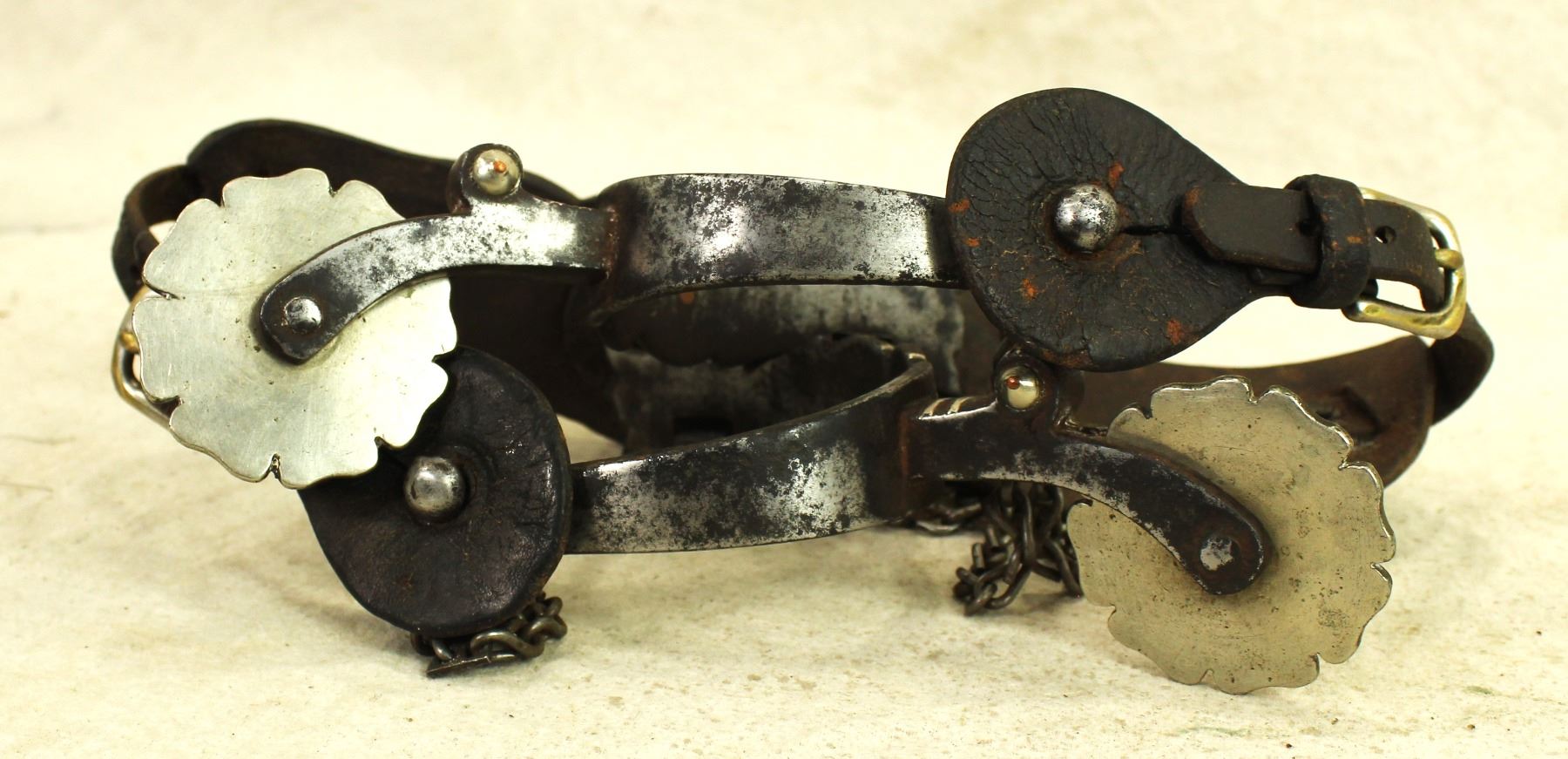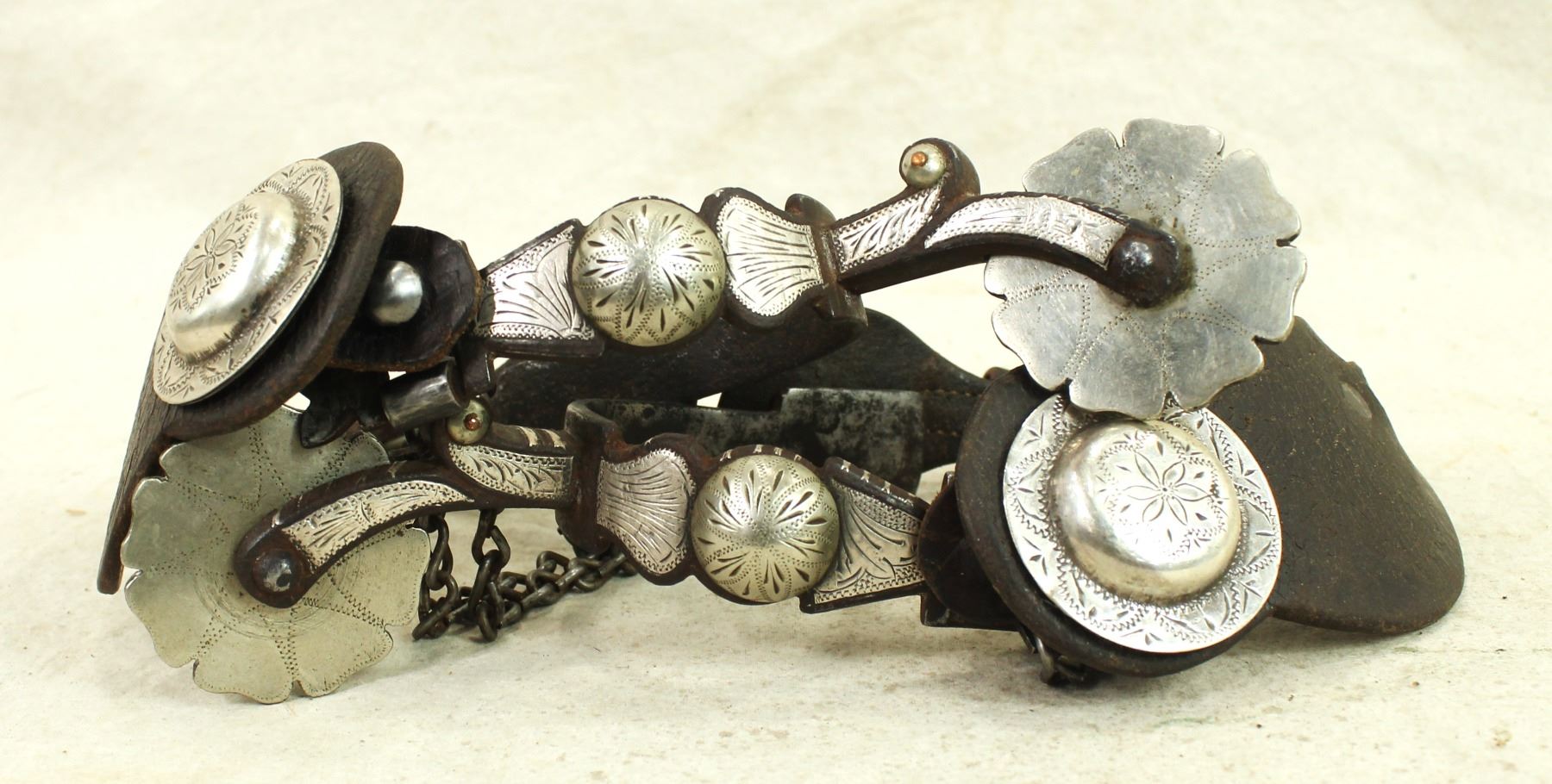 A fabulous pair of single inlaid California style spurs, with Morales squash "M's" on the buttonplates, displaying scalloped heelbands with large finely engraved domes, spectacular cloverleaf rowels and original concho straps.