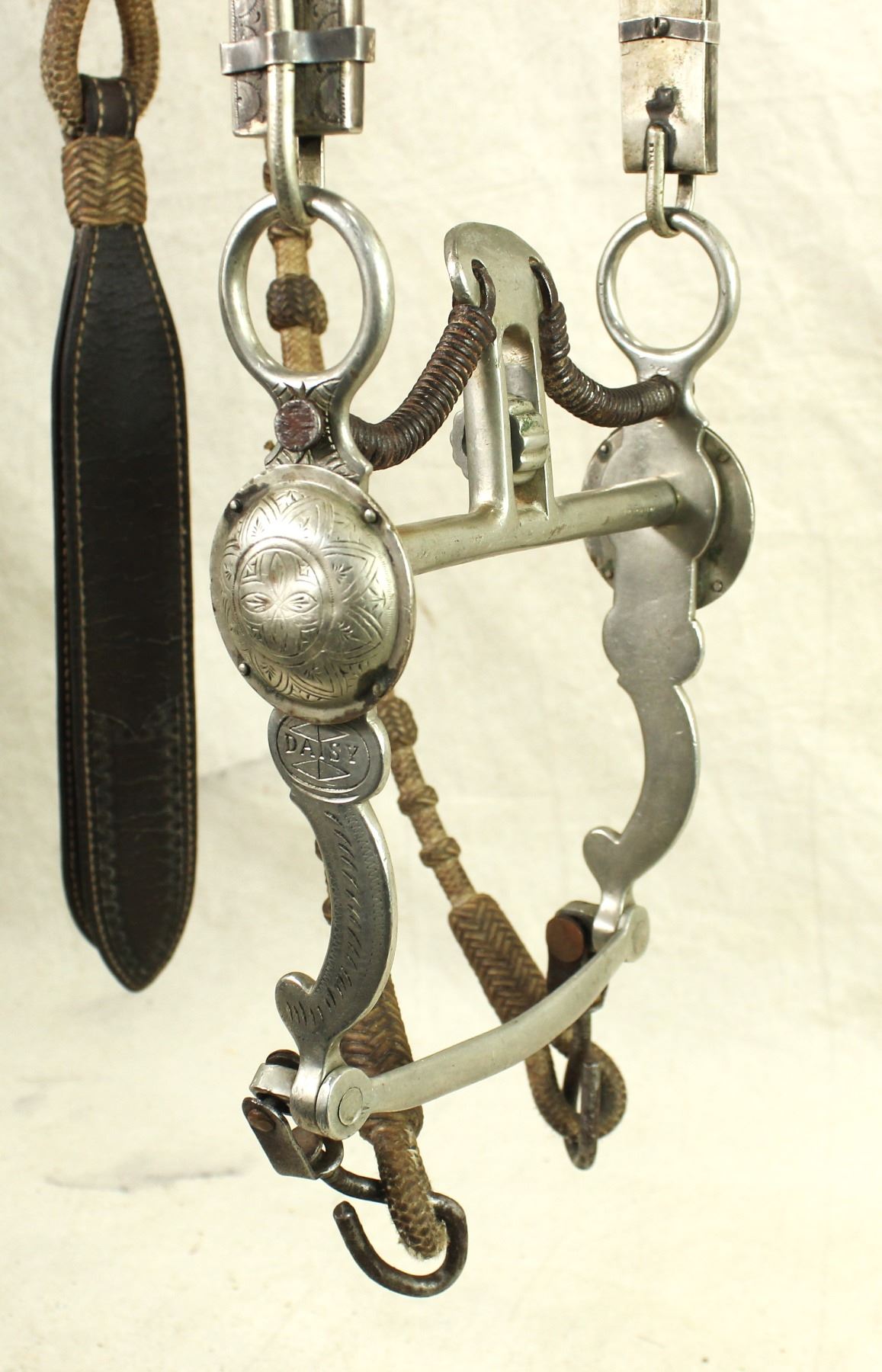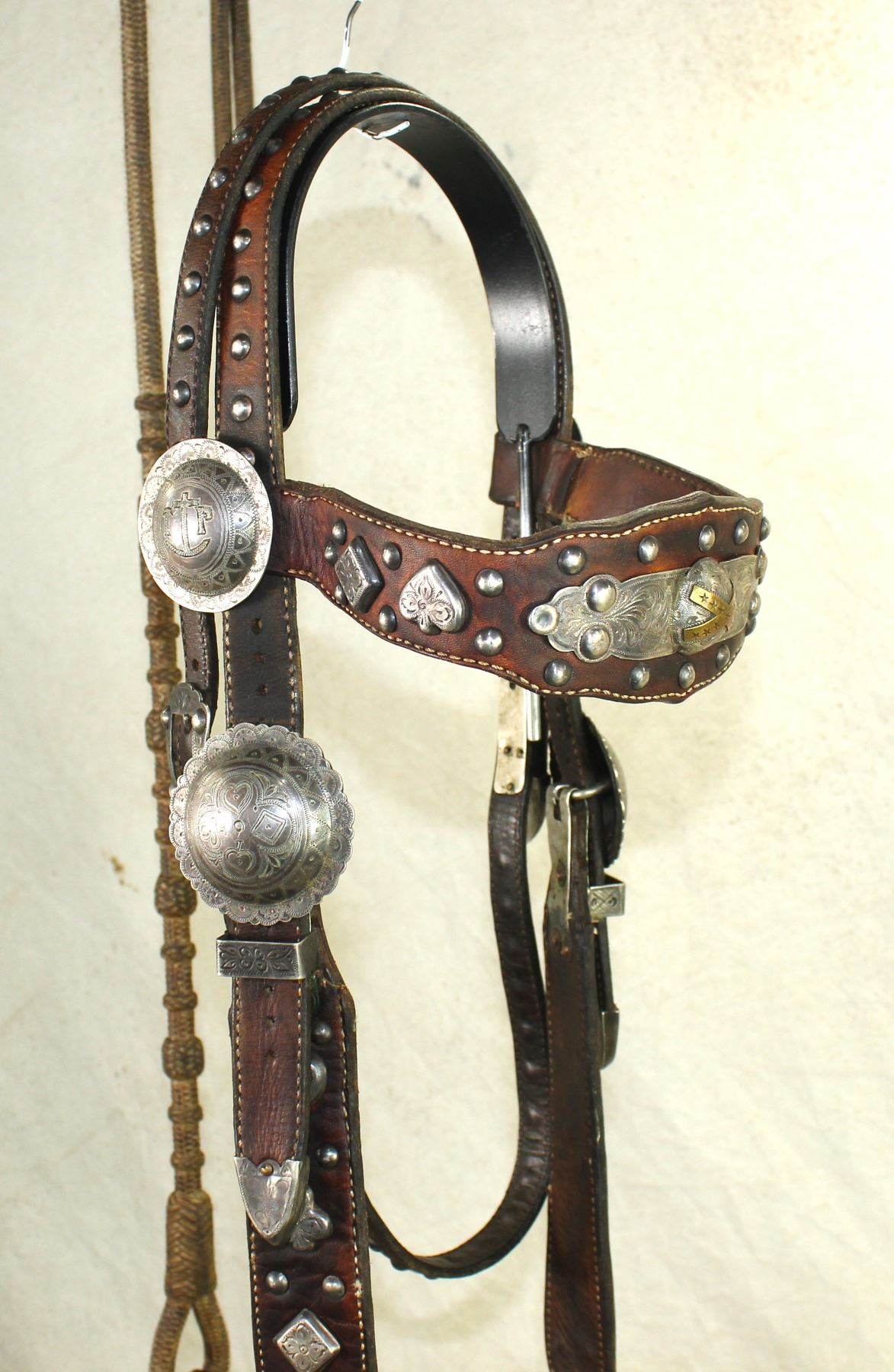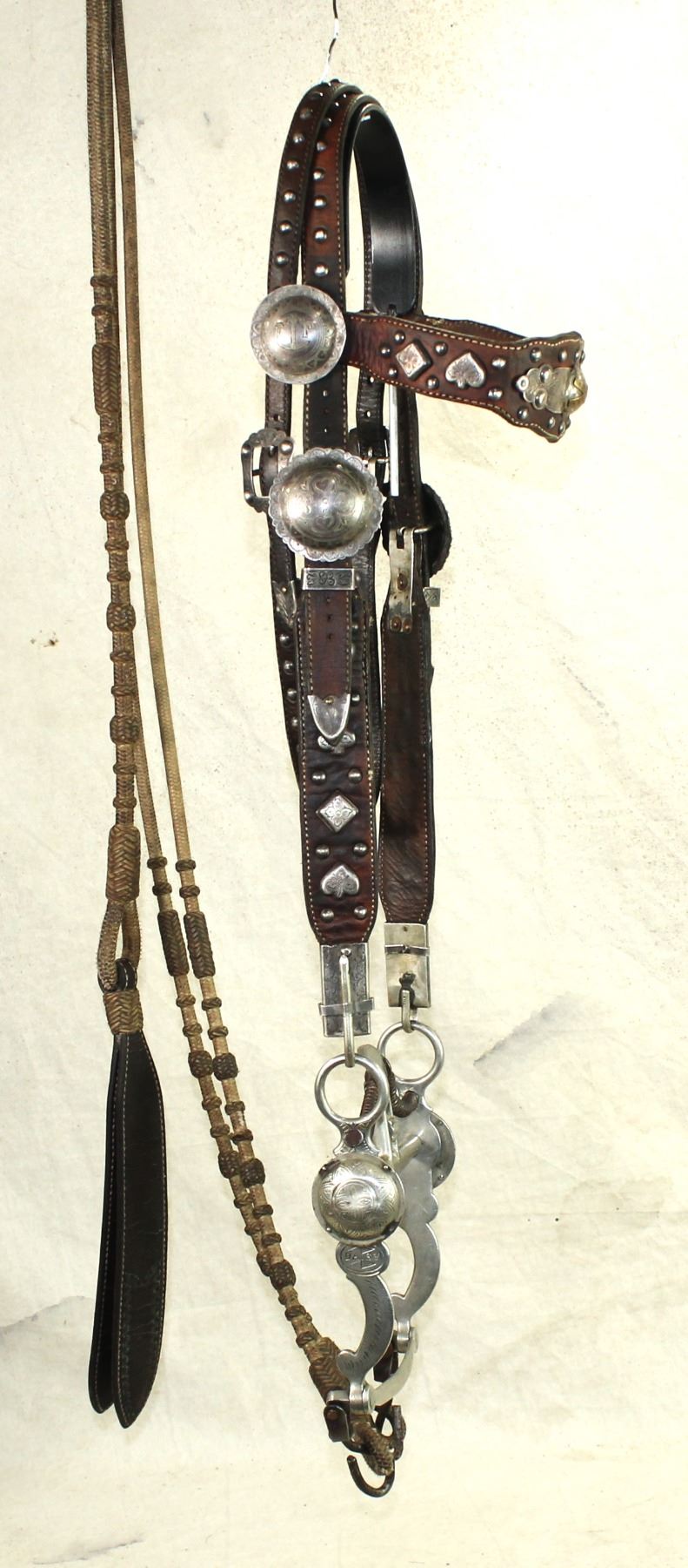 A show stopping silver mounted bridle , made by Linda Doyle years ago, patterned after a classic G.S. Garcia card suit headstall, with a Buerman "Daisy" spade bit and a nice set of braided rawhide romel reins.