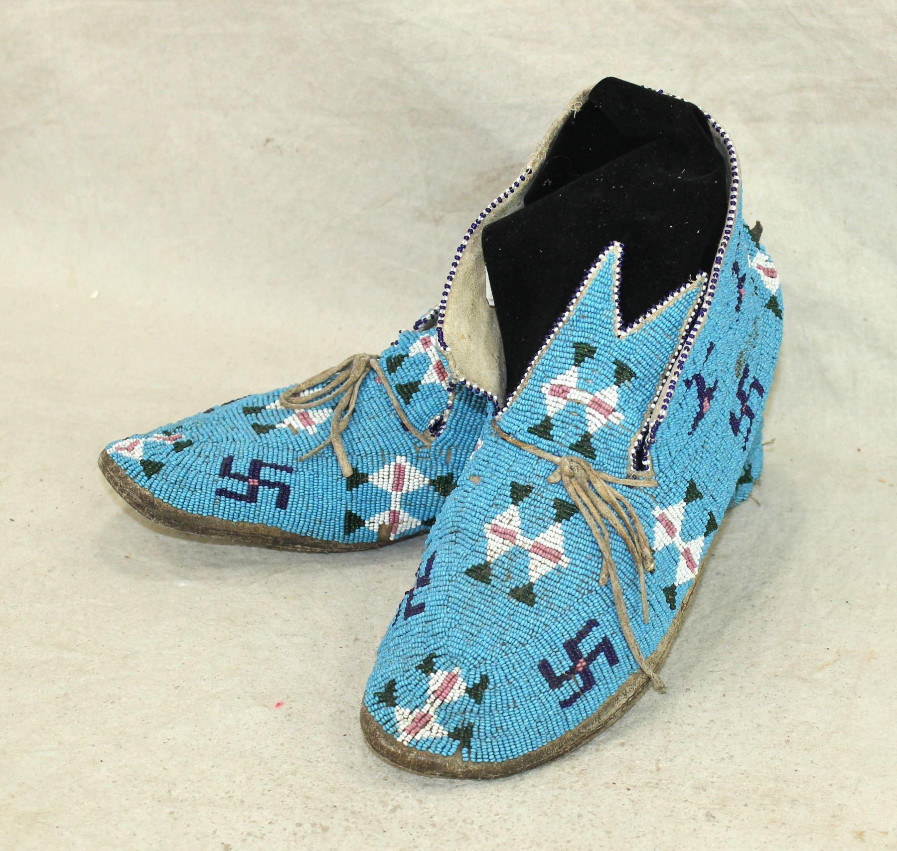 A great looking pair of pre-1900 Northern Plains moccasins, with an uncommon pattern of rolling logs on a light blue background. In very nice condition.