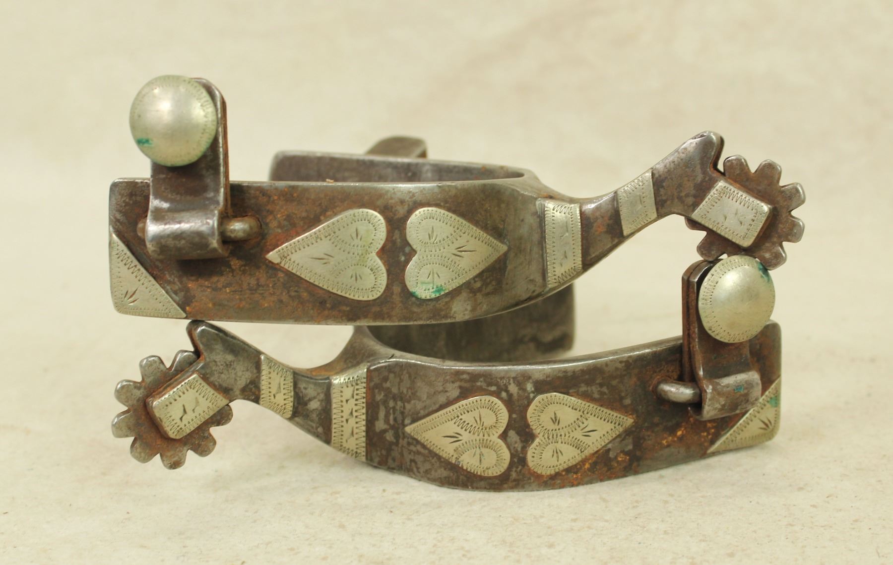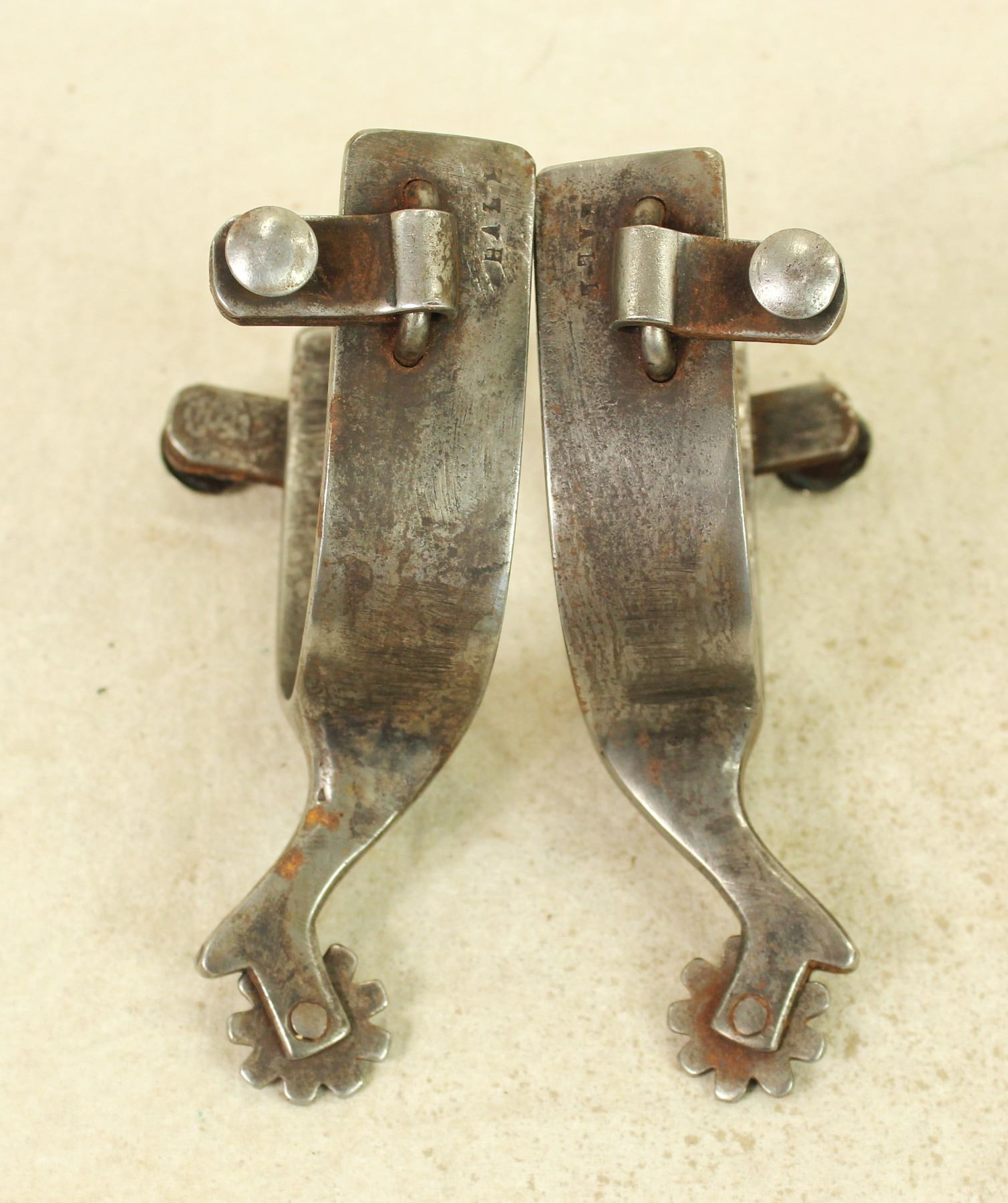 A massive pair of single mounted spurs with extra wide heelbands, with interesting cutting horse style shanks and rowels, in very good condition. Marked under the button.
