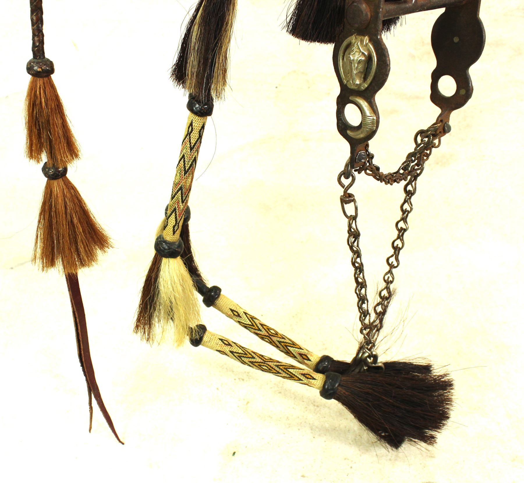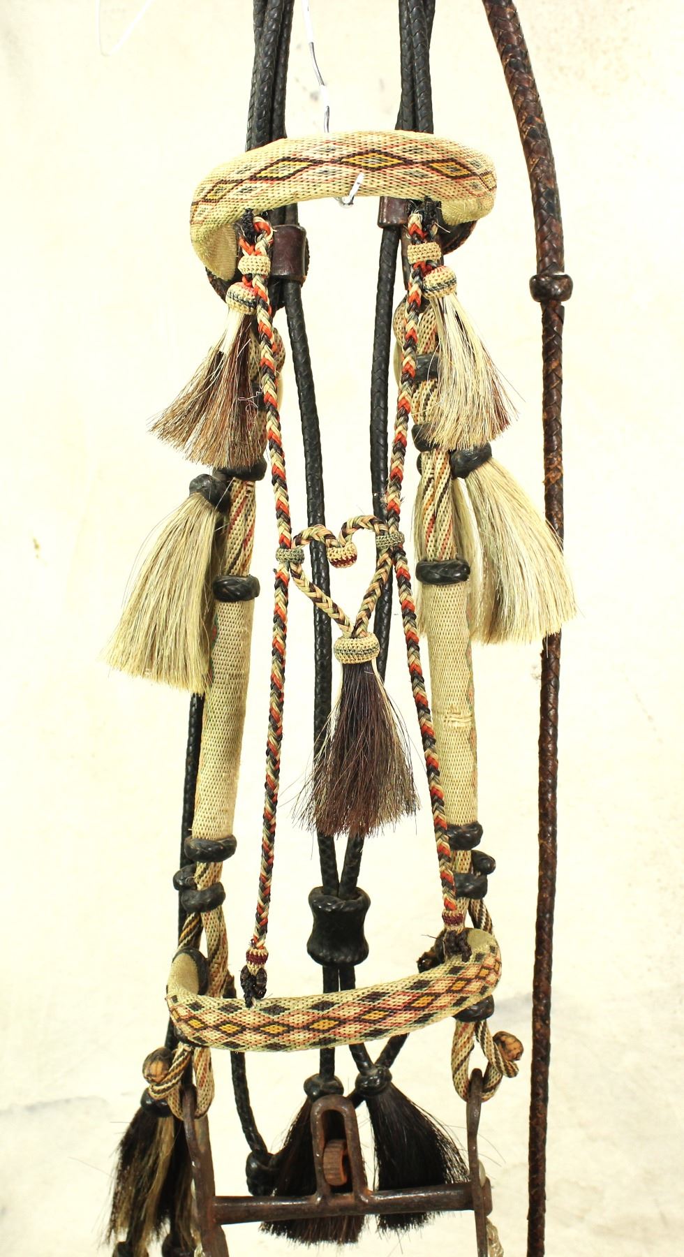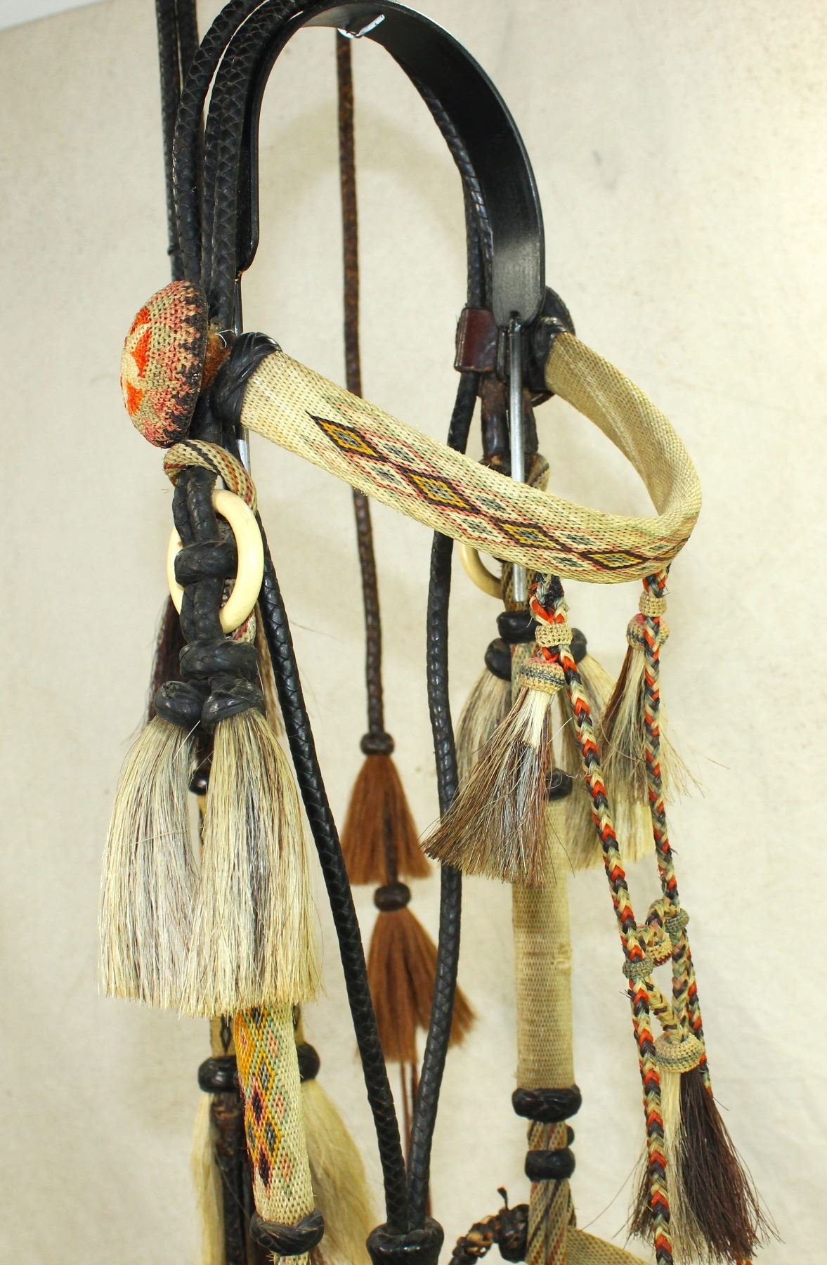 A stunning seven color hitched horse hair bridle with a beautiful combination of colorful geometric patterns, eight tassles, fantastic large domed rosettes, and all focused around a great heart shaped face chain. Accented by wonderful tassled reins and a Buerman horsehead bit.
