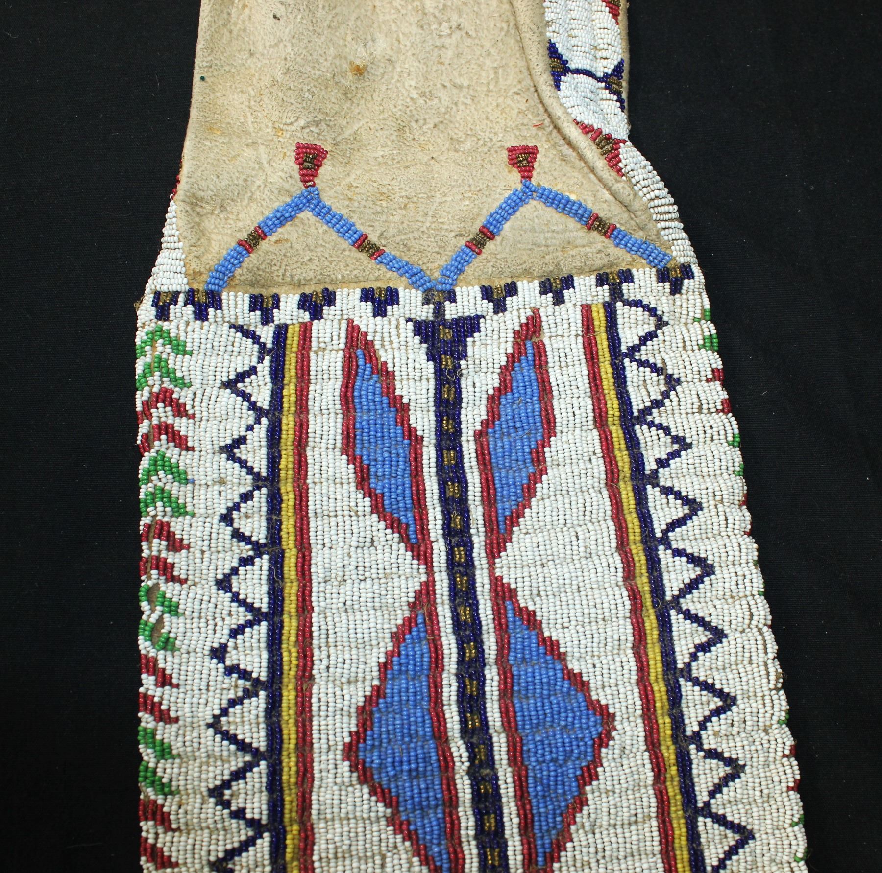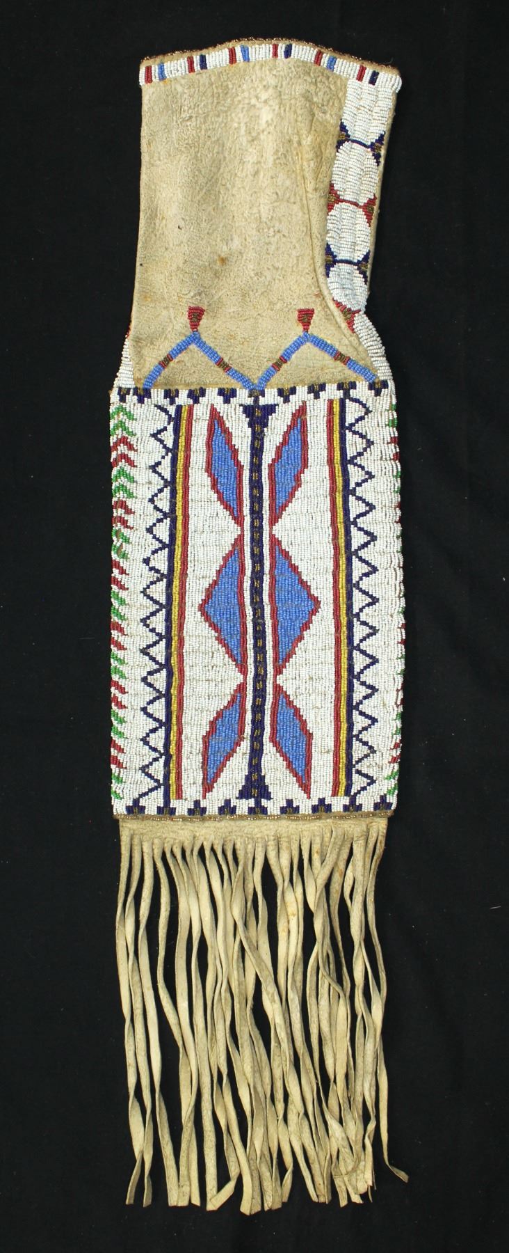 A massive Native American pipe bag, made of heavy hide, double-sided with large beaded panels of early cobalt blues, white heart geometrics on a white background, finished with long hide fringe, measuring 7"x 30".