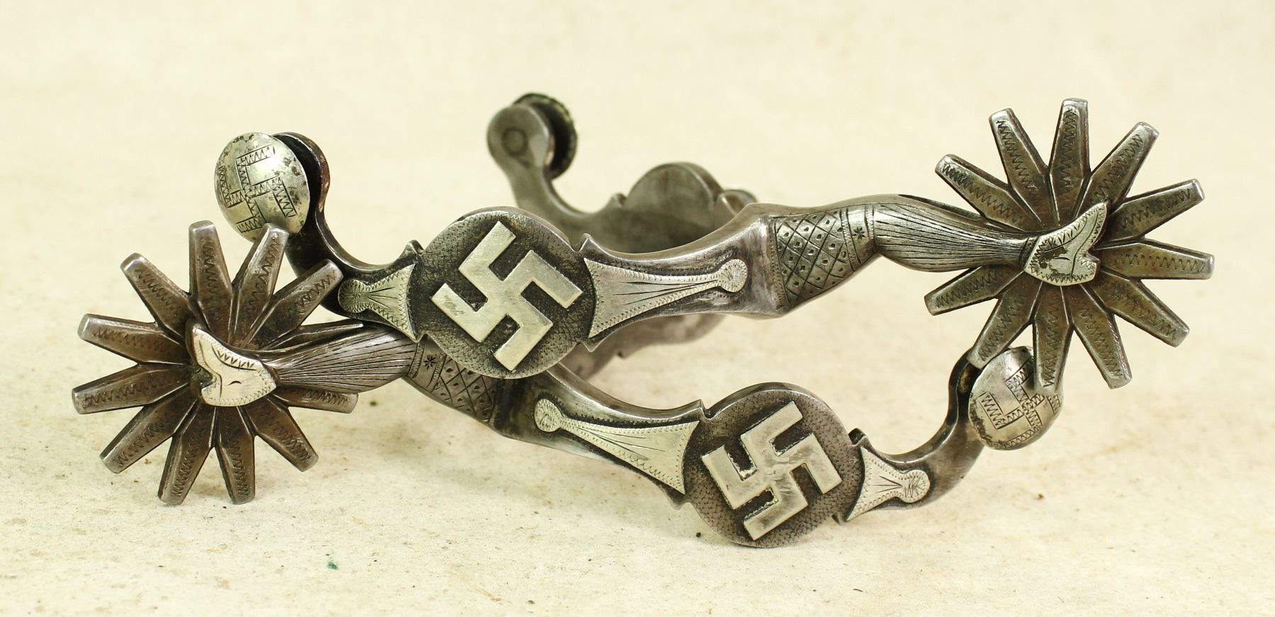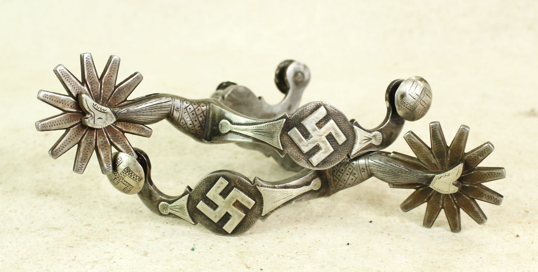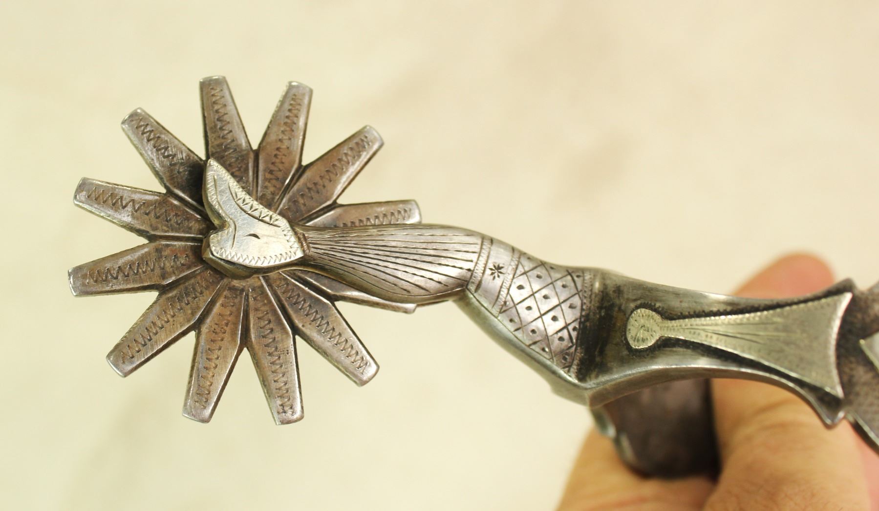 An extremely nice pair of finely detailed spurs in a McChesney flavor, with three dimensional lady leg shanks, and double mounted heelbands with a scalloped good luck rolling log pattern, and engraved extra large rowels. Marked inside heelbands.