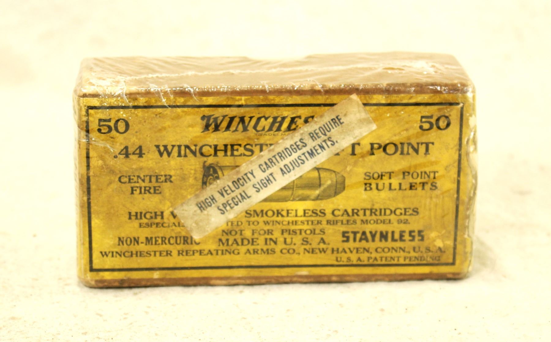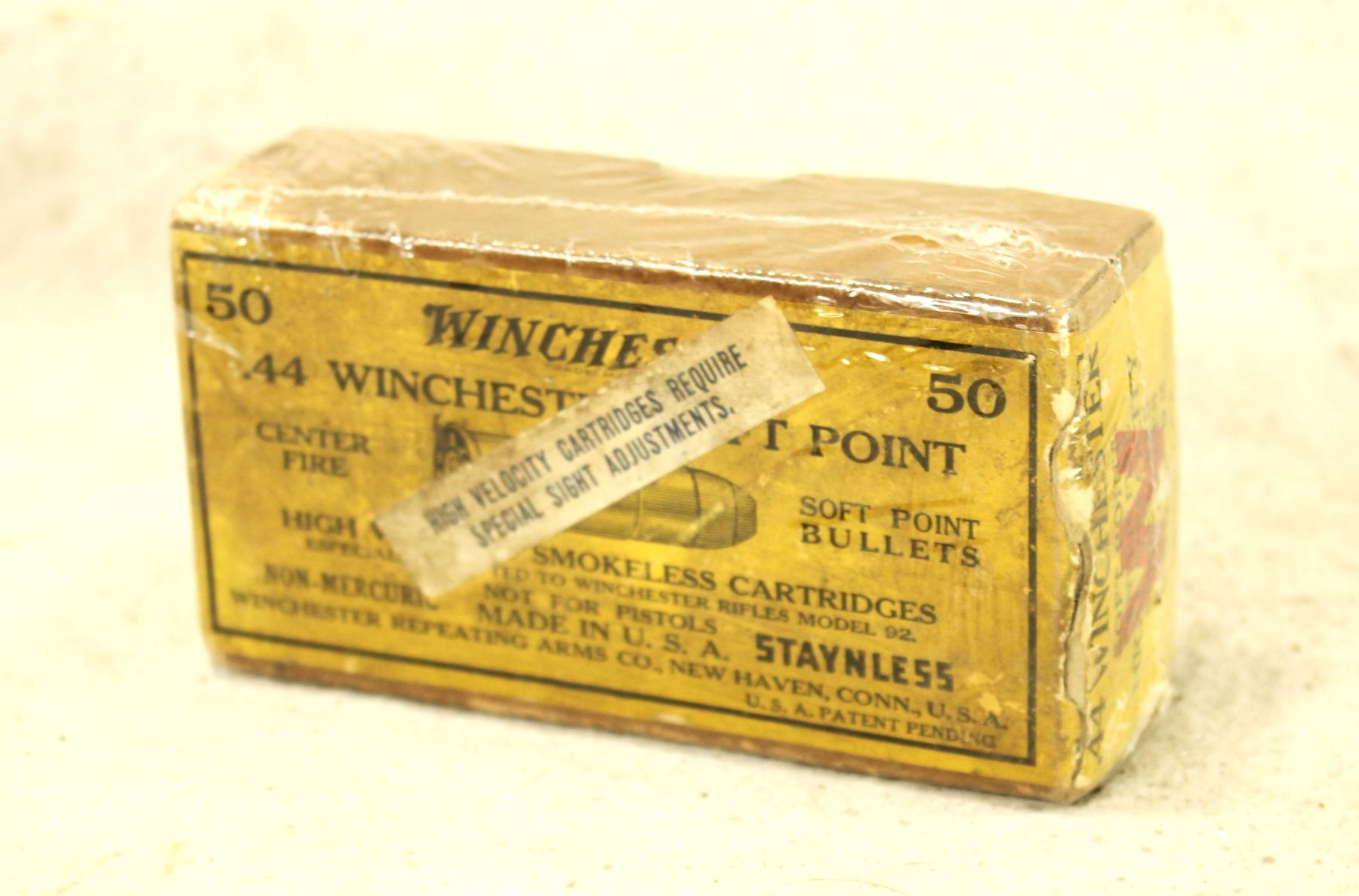 A collectable box of antique Winchester ammunition in 44 centerfire, with a nice original box with bright color and graphics.