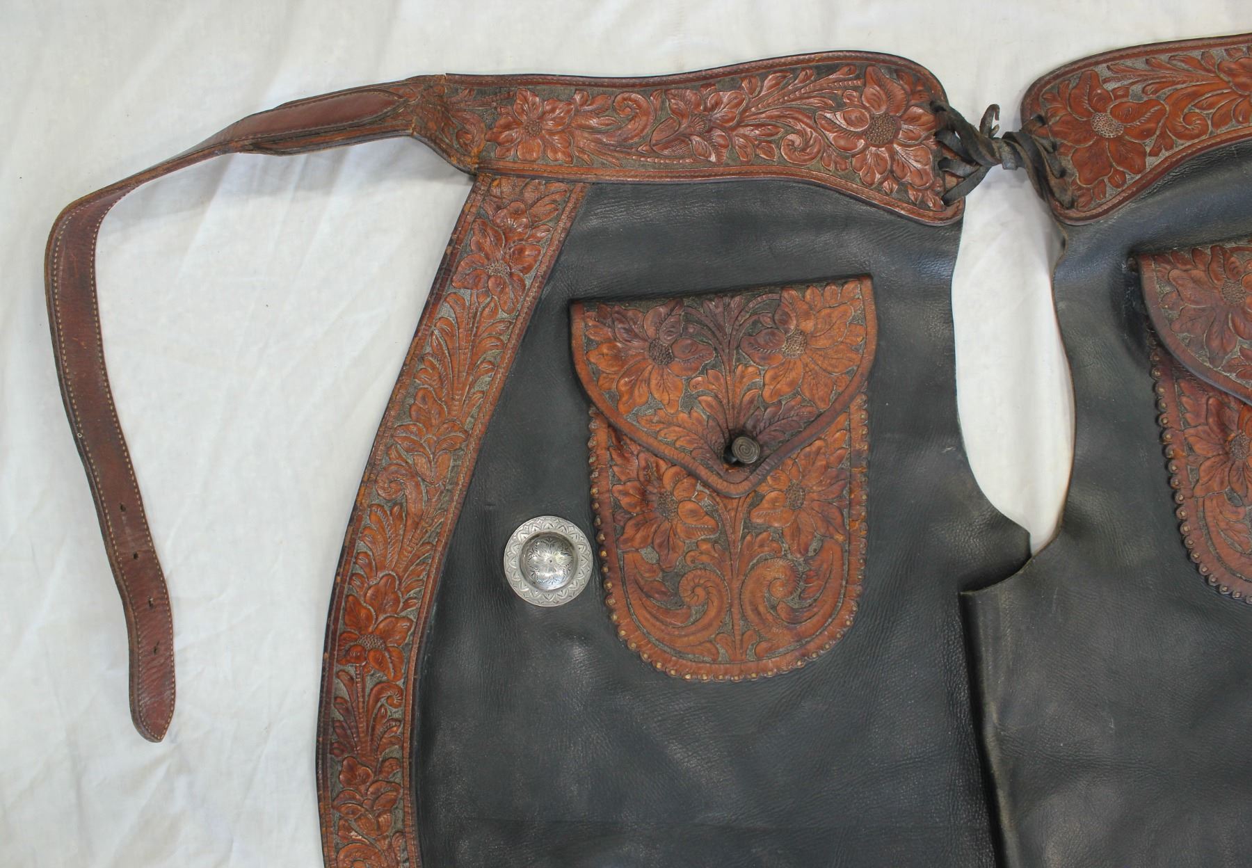 An oustanding pair of large batwing chaps with a bold presence of two-tone style mixed with pockets and bordered perimeter of artistically tooled russet leather, accented by beautifully engraved silver conchos.