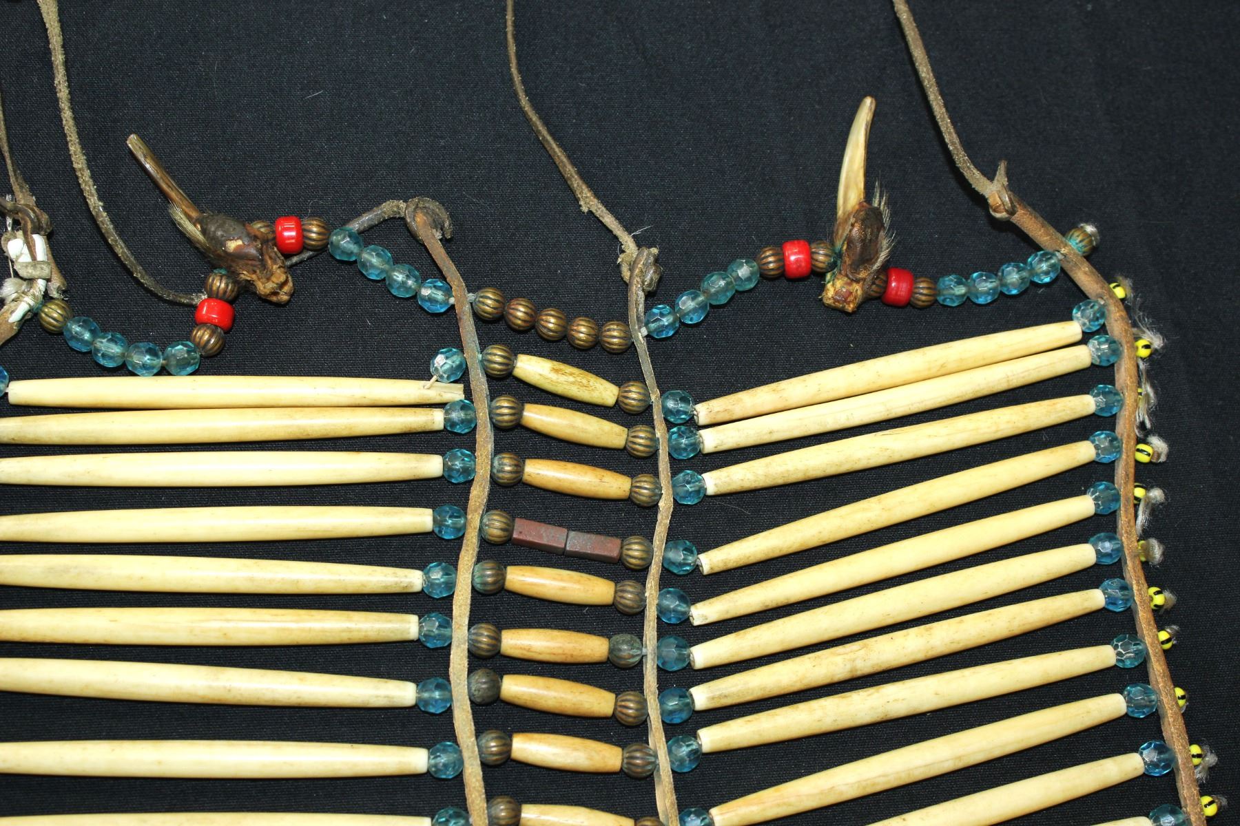 A super nice large heir-pipe loomed breast plate with an appealing center section, showing nice patina and decorative beads throughout.