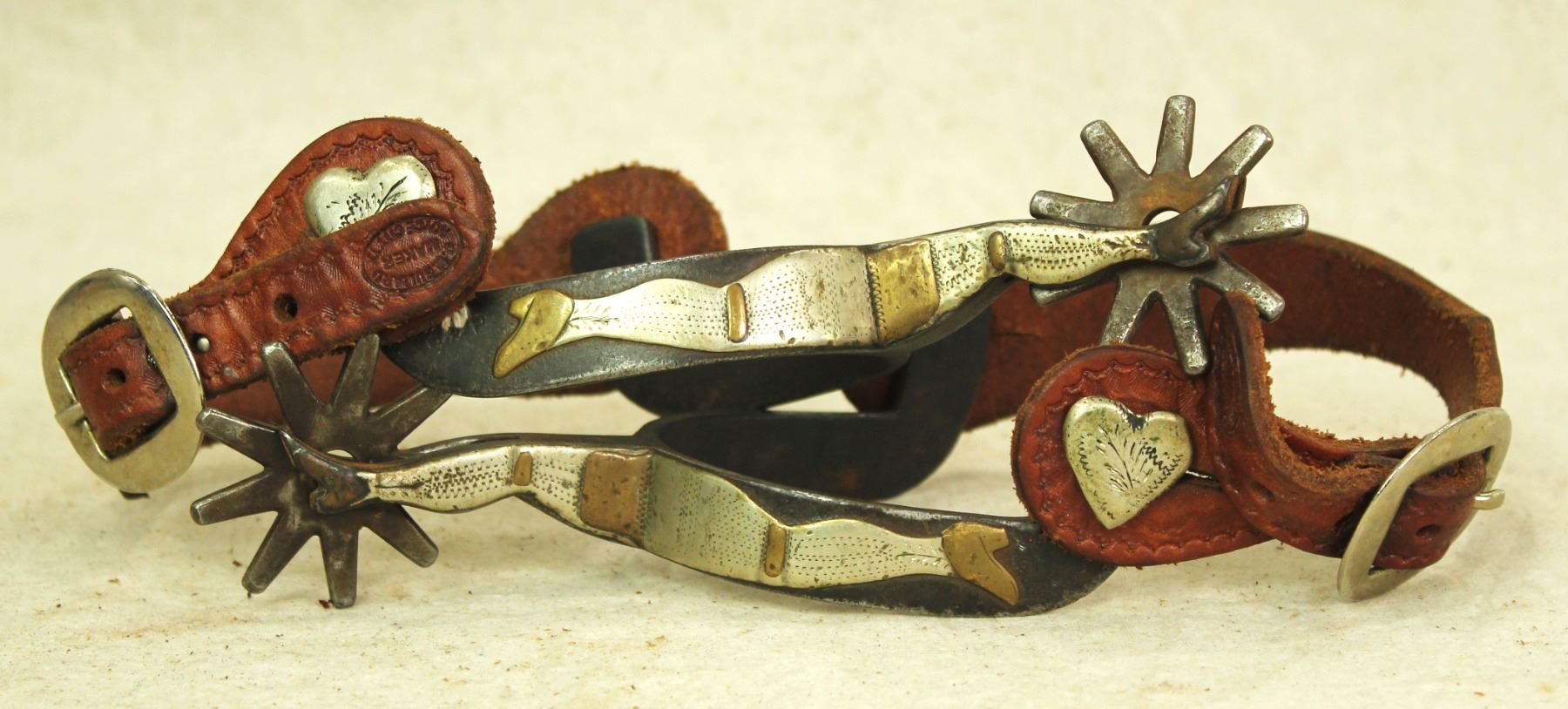 A very collectable pair of double mounted #34 double gal leg spurs with large 9 point rowels.