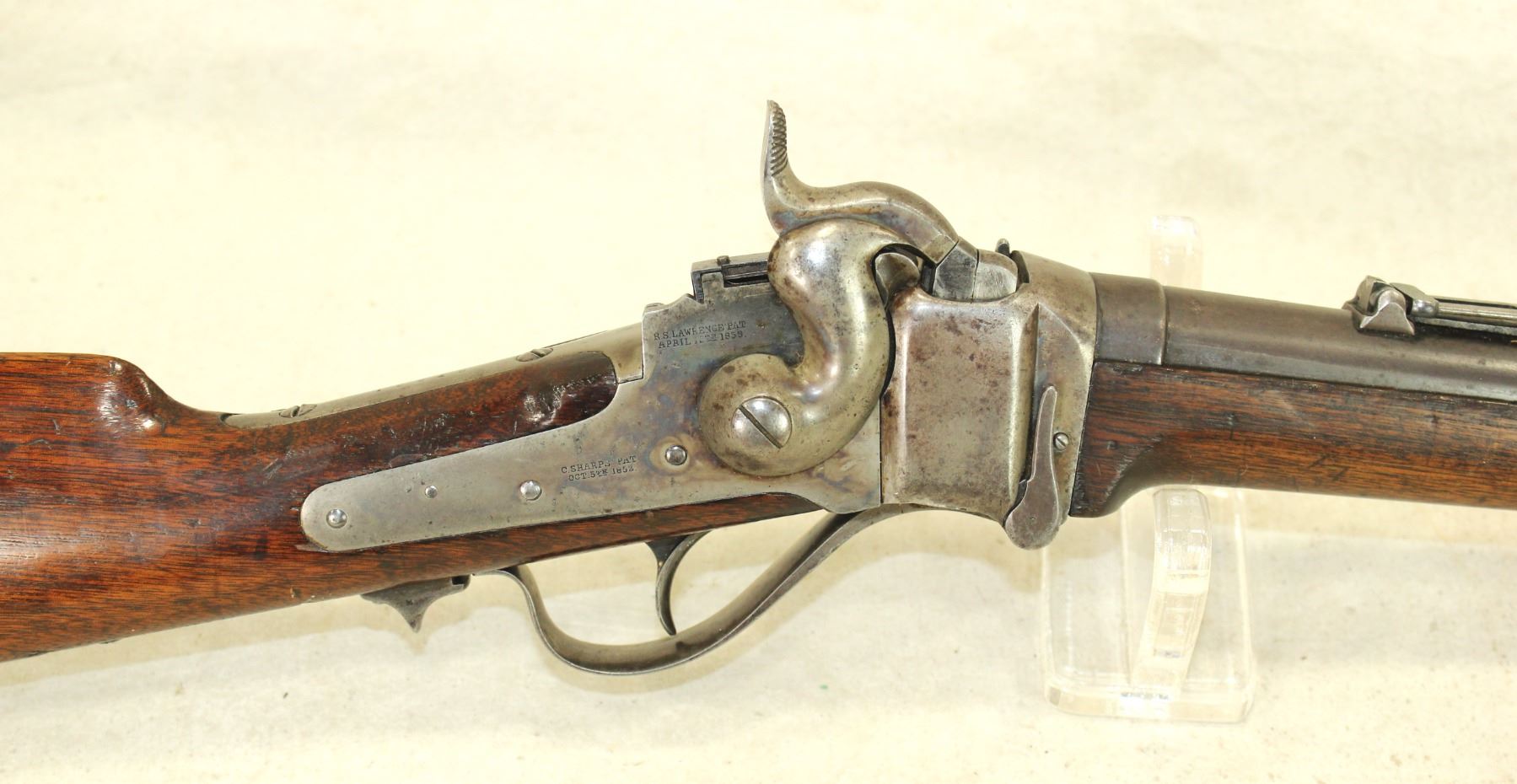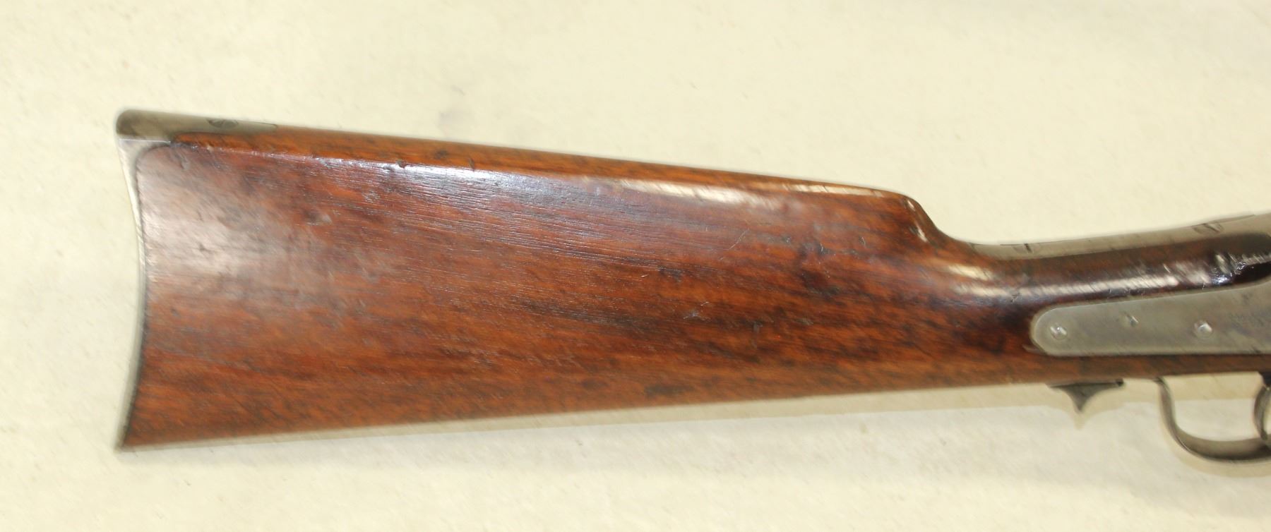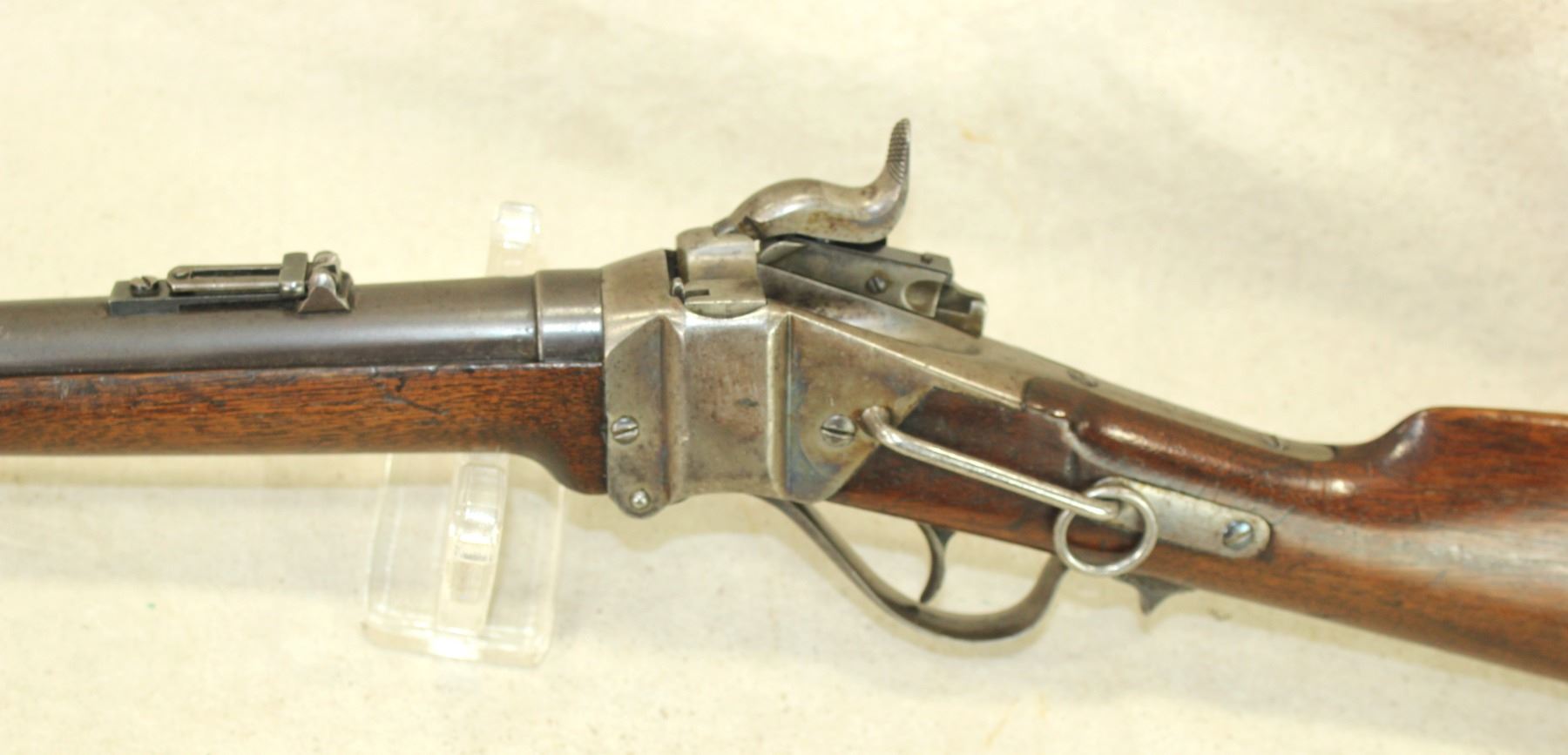 Serial #87531, A beautiful Antique, C. Sharps Model 1868 Cartridge Conversion carbine. Caliber 50-70 Gov’t with folding ladder adjustable rear sight and post mounted blade front sight Case colored receiver with oil finished walnut stocks. These are one of the primary US Trooper issued long arms of the Indian war period and later used extensively by frontiersman and cowboy ranchers alike. A total of 10,001 sharps were converted in both rifle and carbine with many finding their way west.