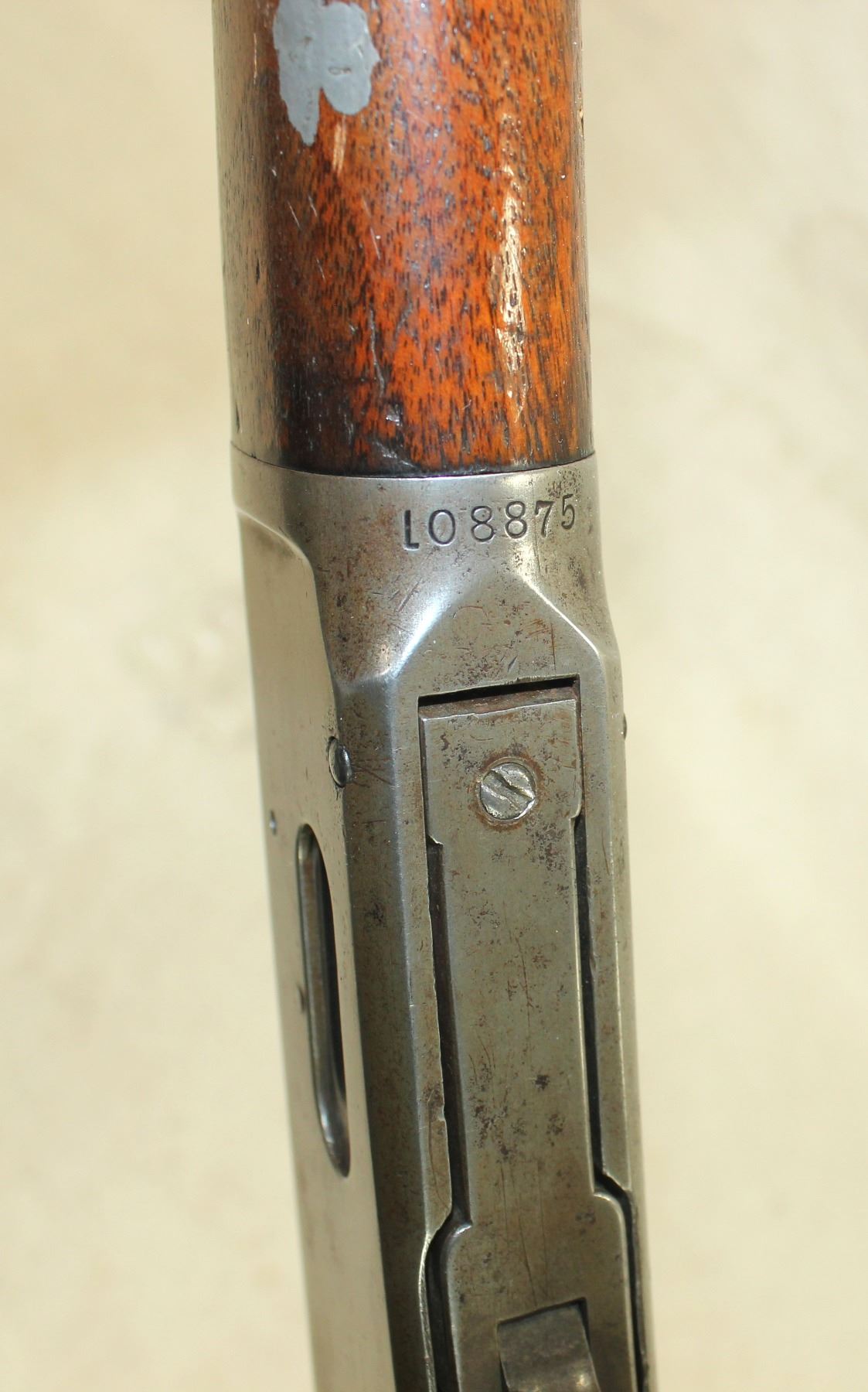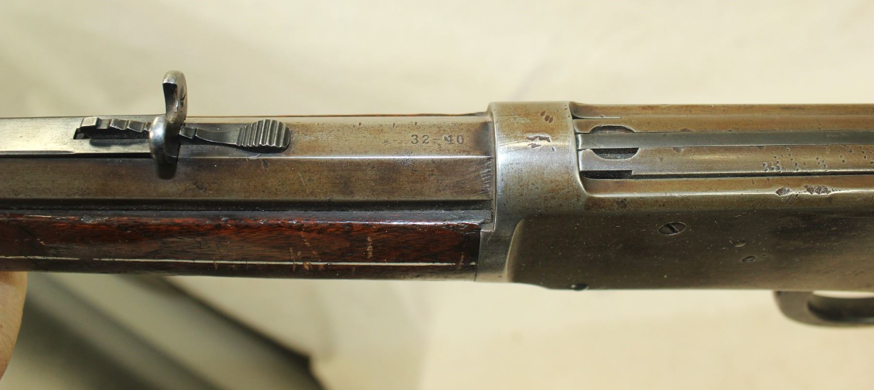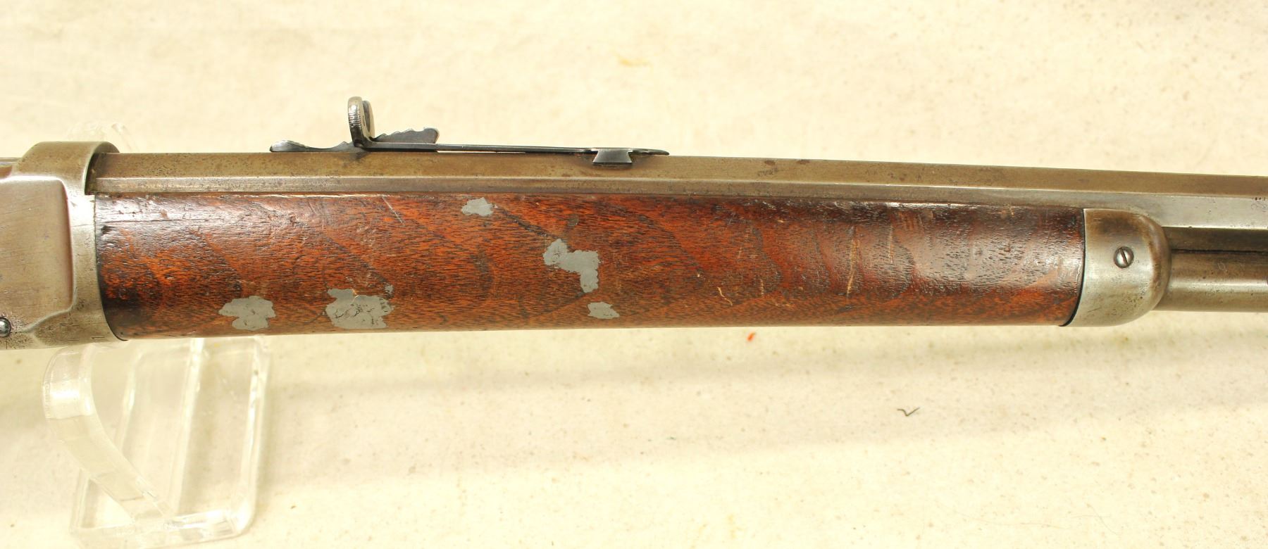 Serial #108875, in desirable 32-40 caliber, an interesting Antique 1894 octagon barreled rifle with a cresent buttstock. I good overall condition with interesting inlays in the forend wood.