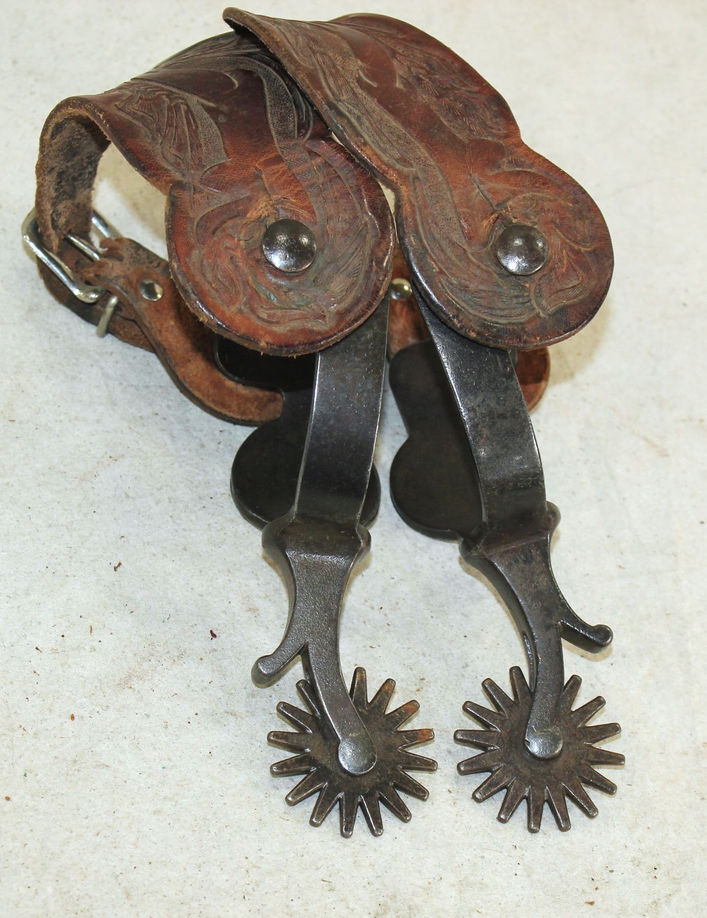 A super rare pair of single mounted pattern #202 Hollywood Special spurs, large with stylish domed discs on the heelbands, oversized domed buttons, and sexy 2" rowels. Nicely marked under the buttons and with original straps.
