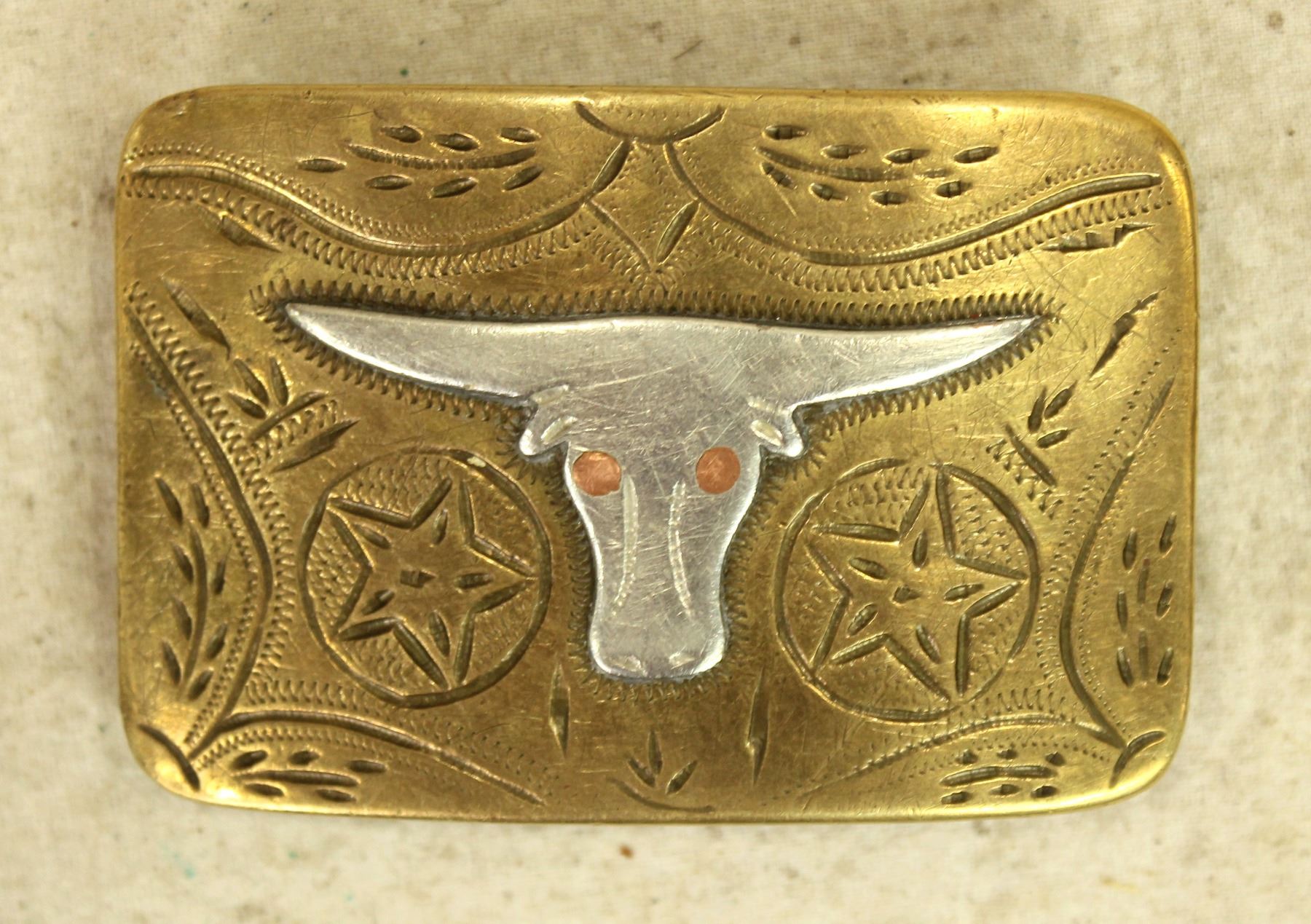 A wonderful brass belt buckle with a stylish engraving pattern of Vallejo stars and a great two-tone silver and copper mounted steerhead. Measures 3"x 2".