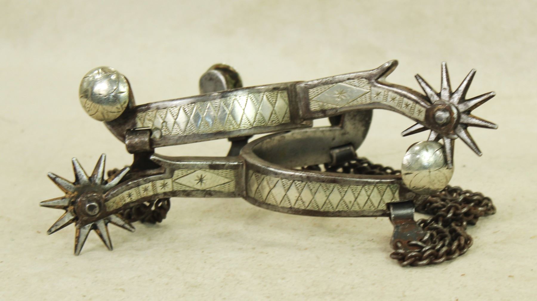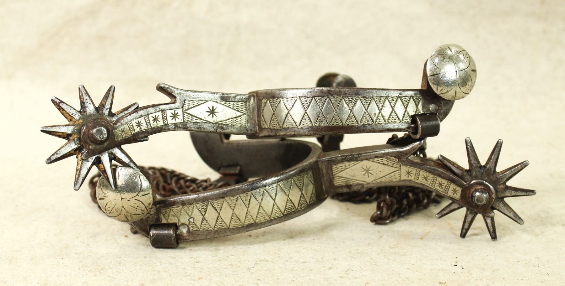A striking pair of doubled mounted Colorado Prison made spurs with extensive diamond pattern, inlaid shanks and beveled rowels.