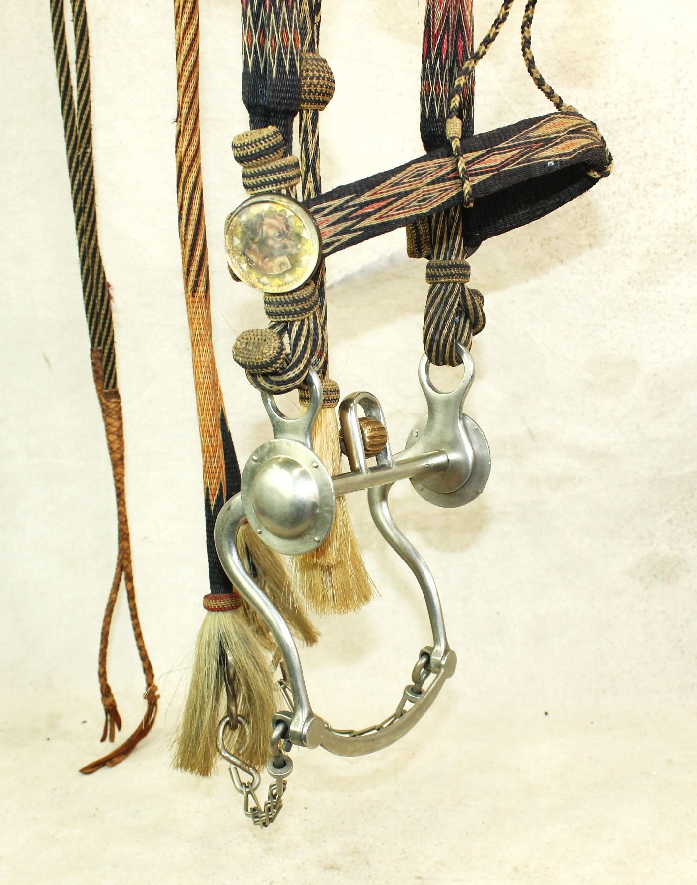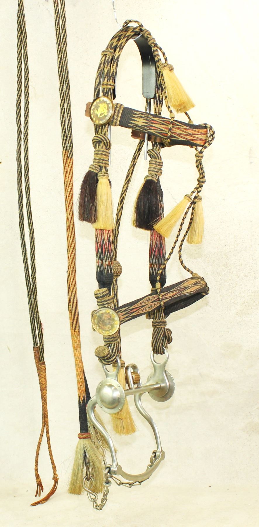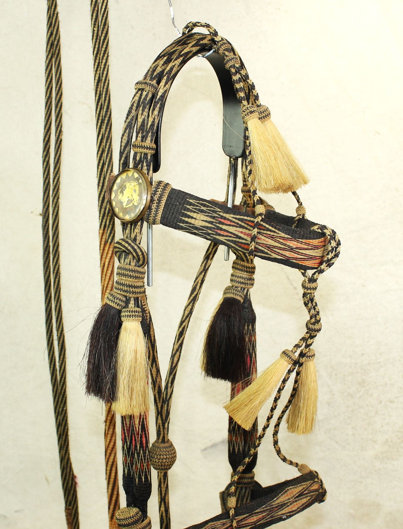 A fabulous antique horsehair bridle, with uncommon black background, with wonderful gladd rosettes, a finely hitched bridle with 5 colors of dazzling geometric designs, finished by a great pair of reins with finely braided and fringed ends.