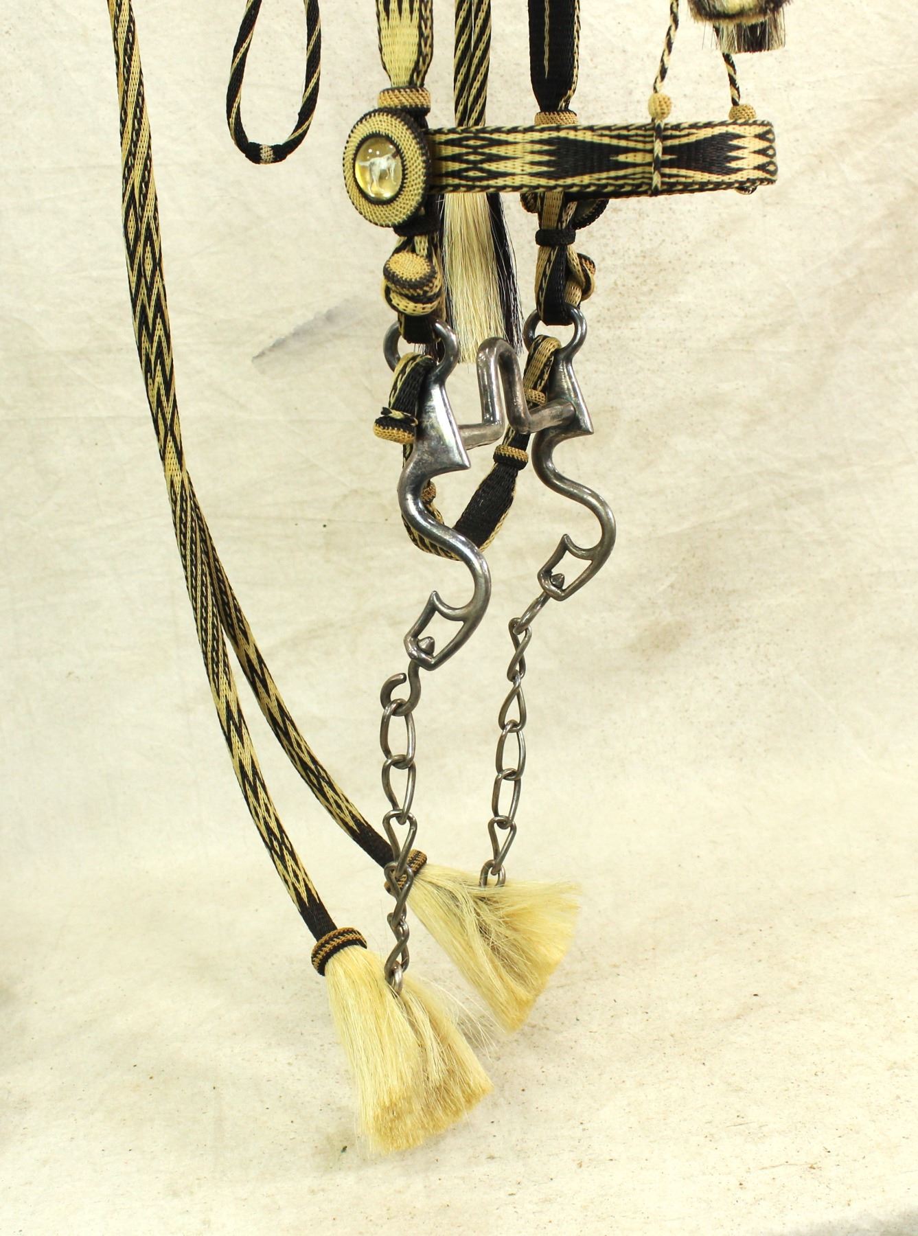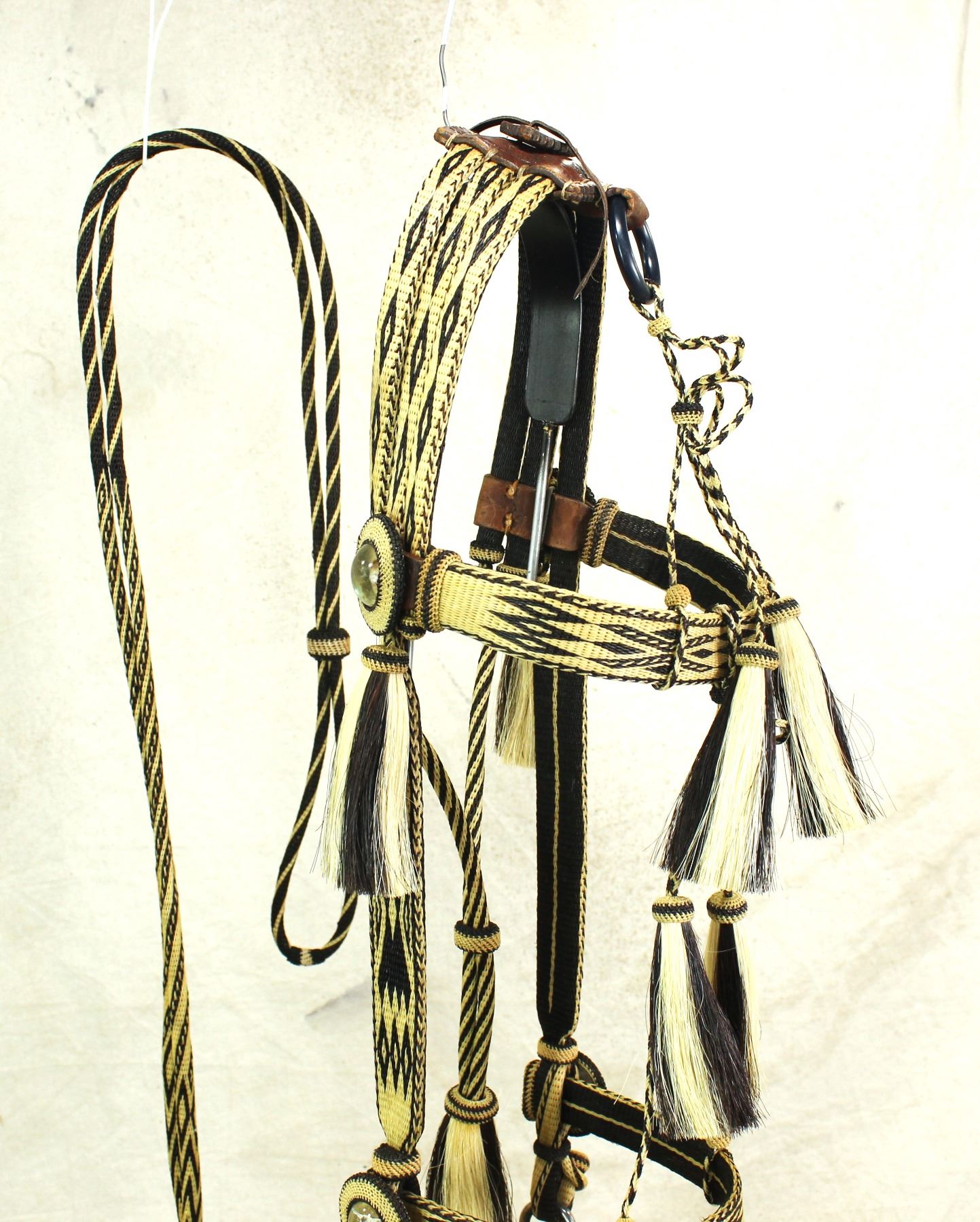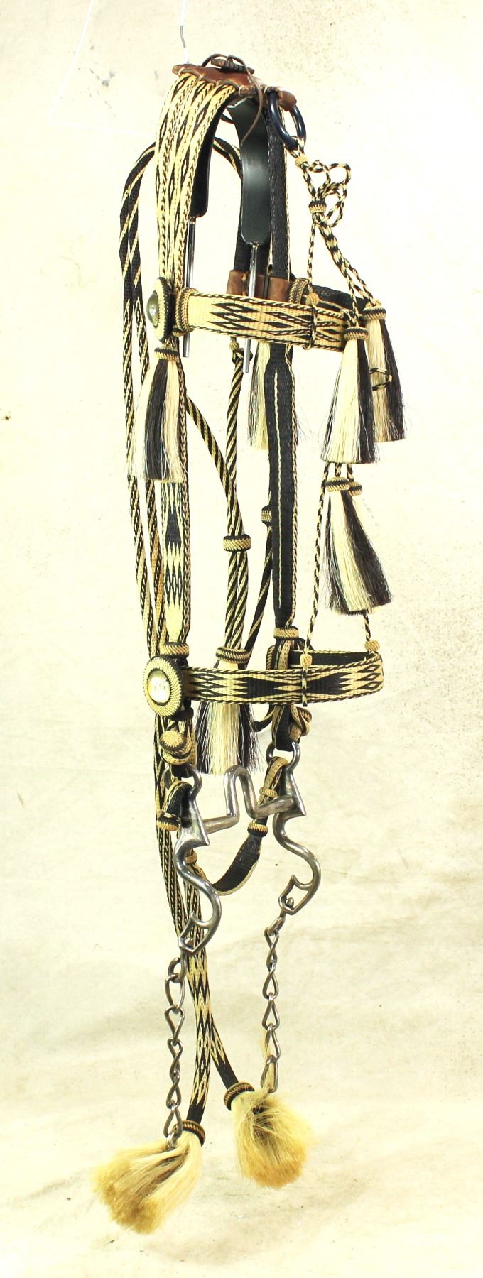 An outstanding Montana State Prison made bridle with beautifully hitched black and white horsehair, having hitched rosettes, incredible tassles, original iron bit, and romel reins. Displaying vibrant black and white color, and mint unused condition.