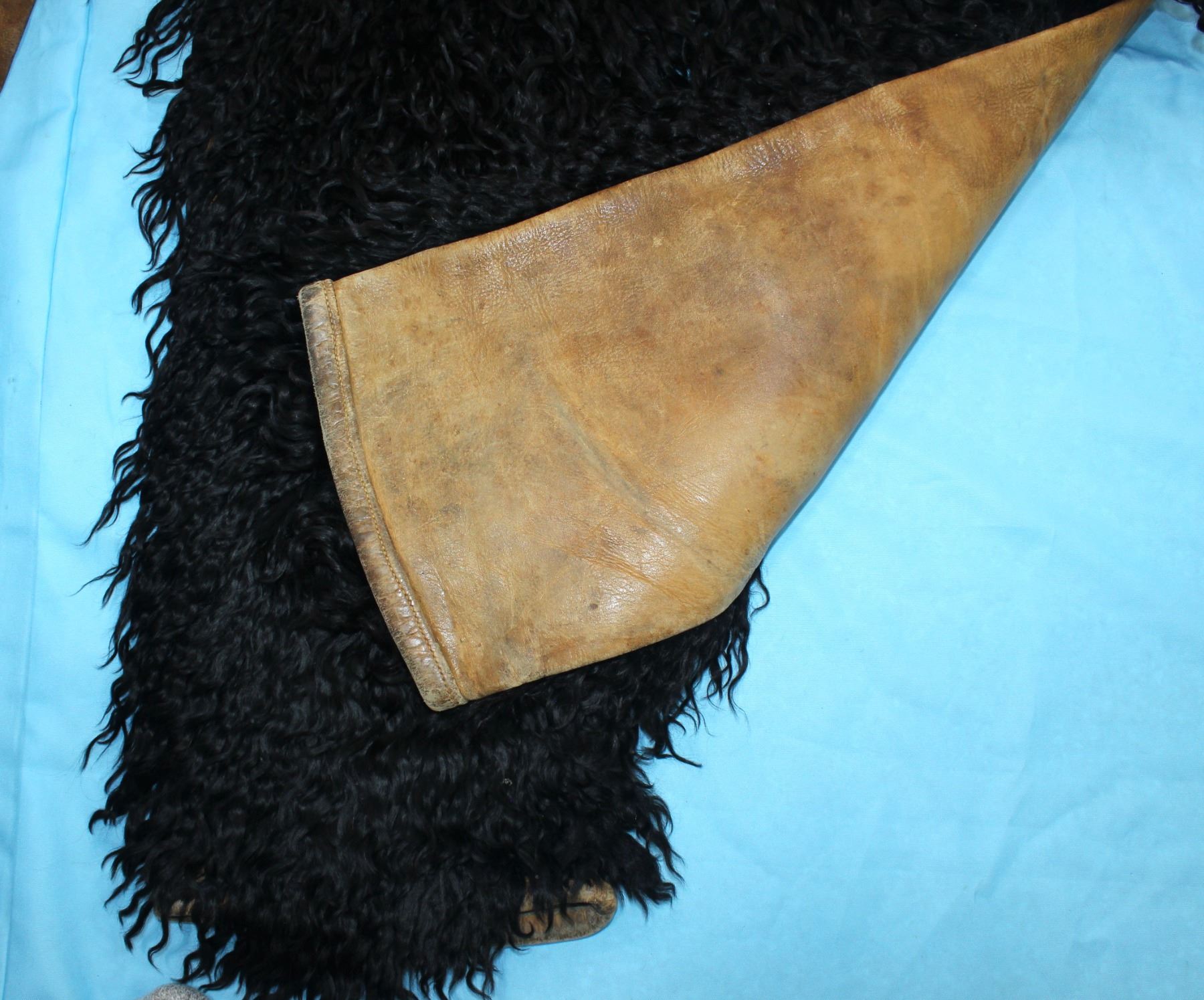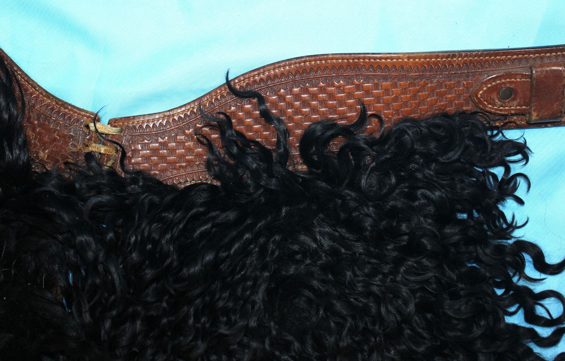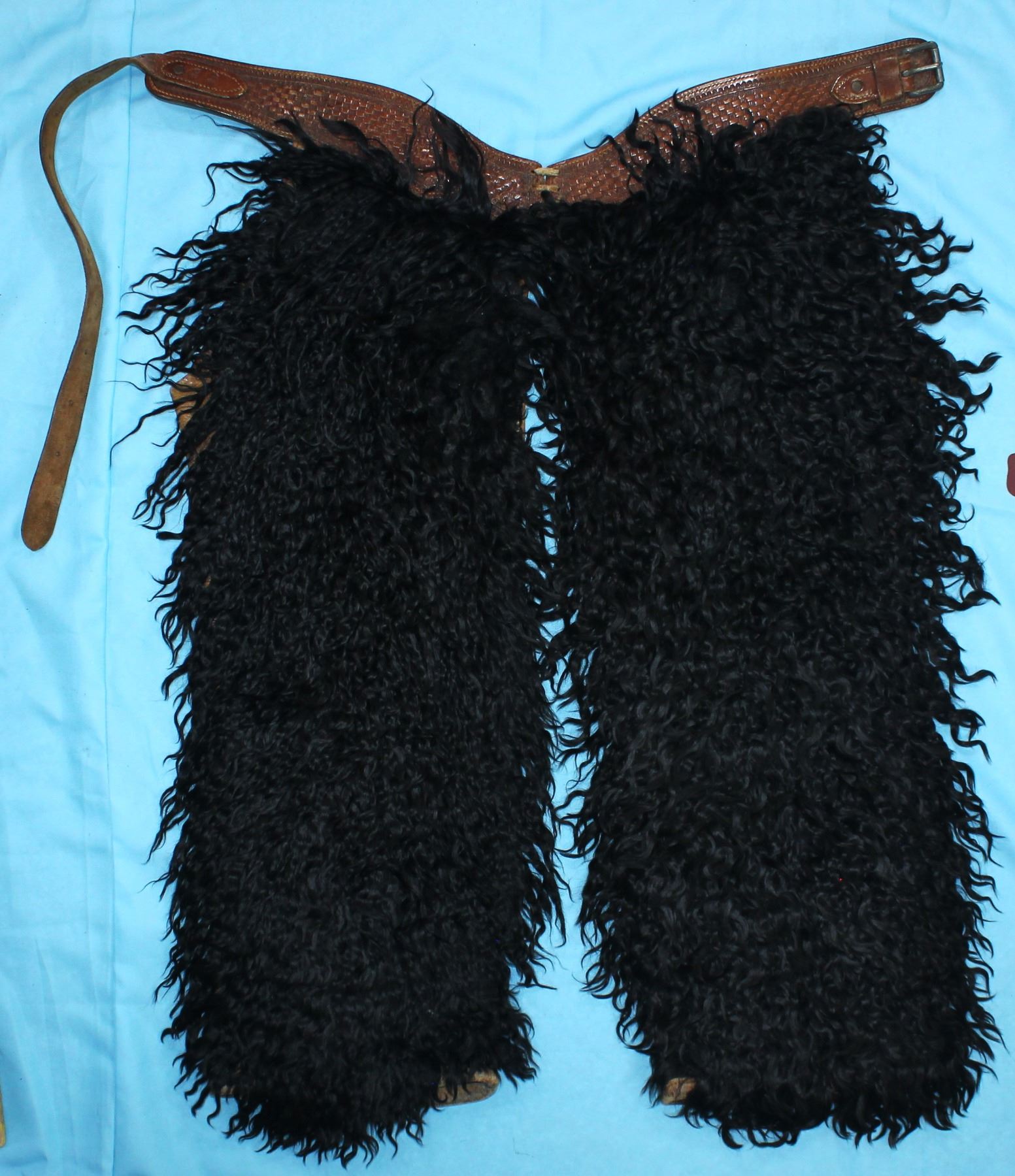 Increasingly hard to find, near mint condition, large pair of angora chaps with fantastic long twisted black hair, and beautifully flower tooled belt.