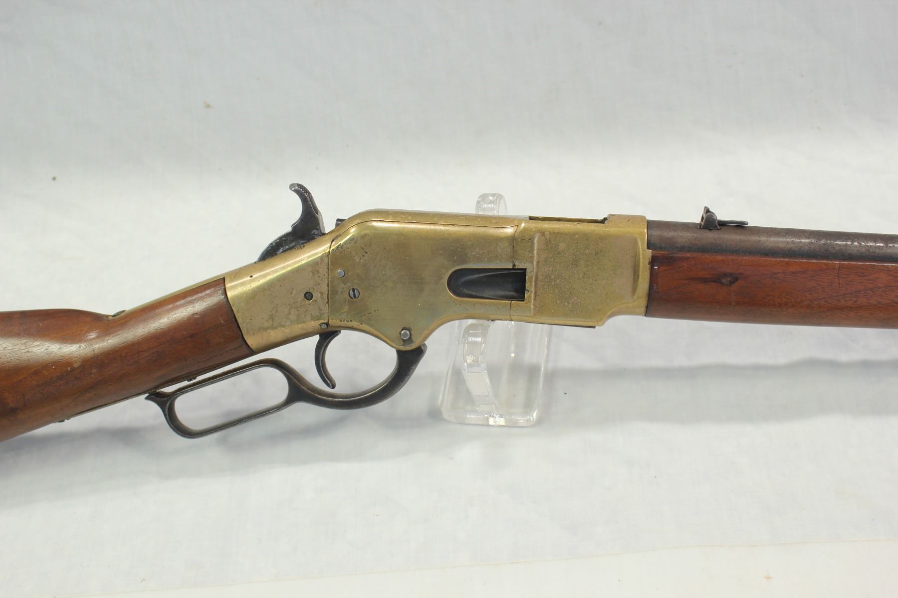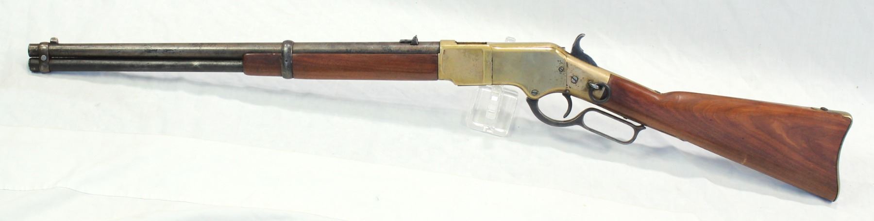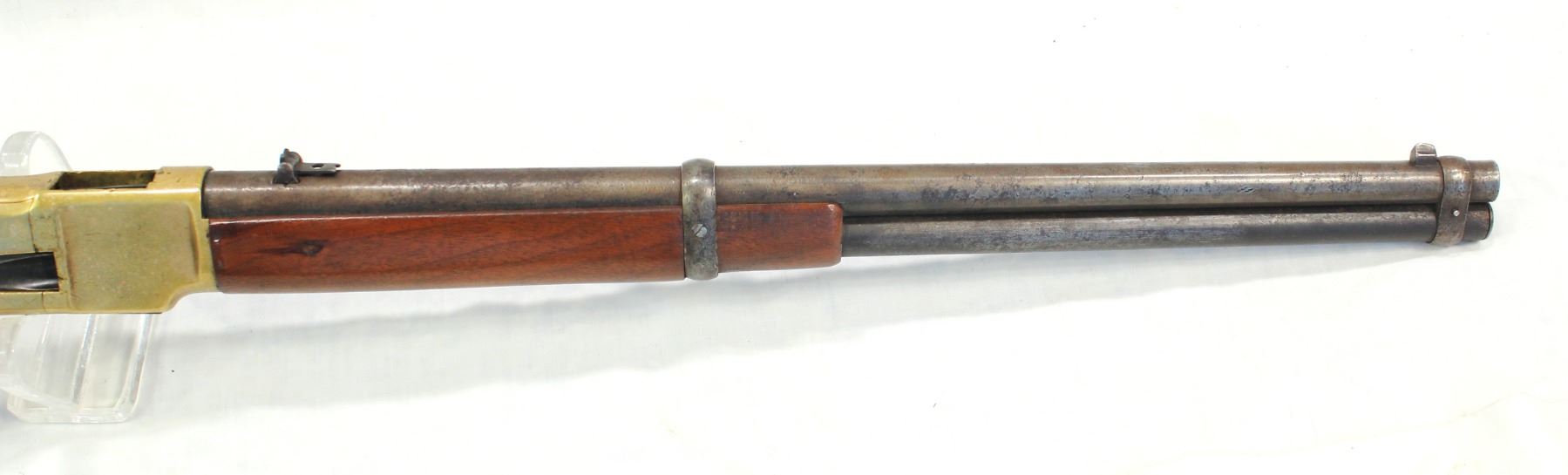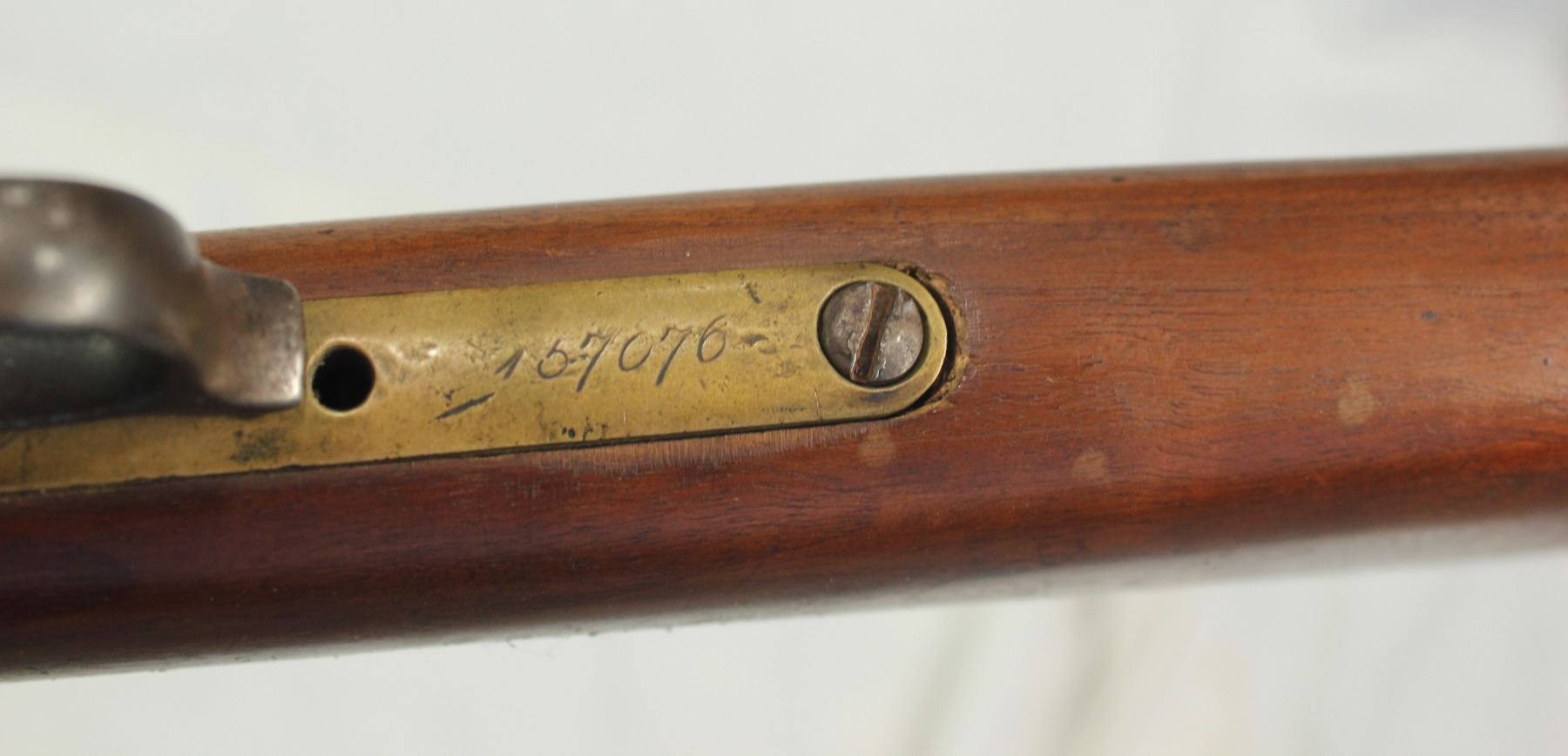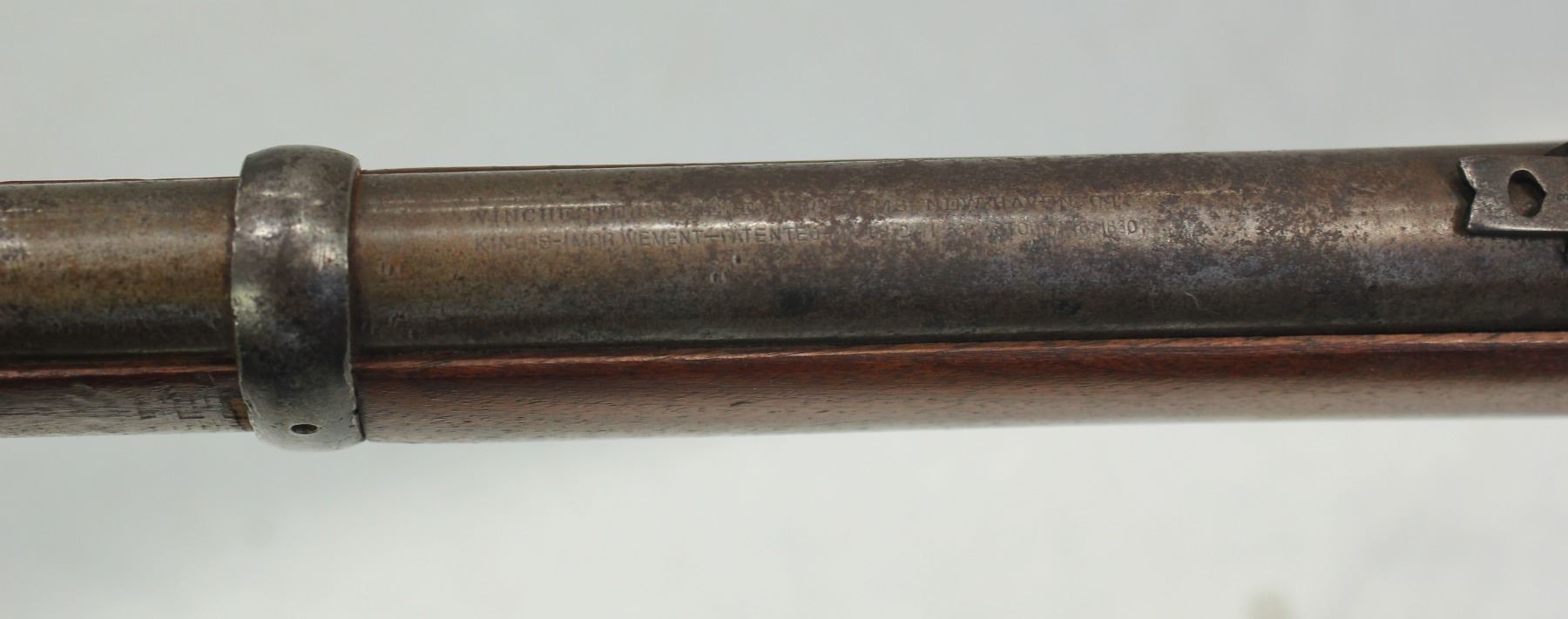 Serial #157076, 44-40 caliber, this Winchester carbine is in nice solid condition overall, with nicely visable markings, attractively patinaed barrel, and well fitting wood. The action functions well, and has a decent bore.