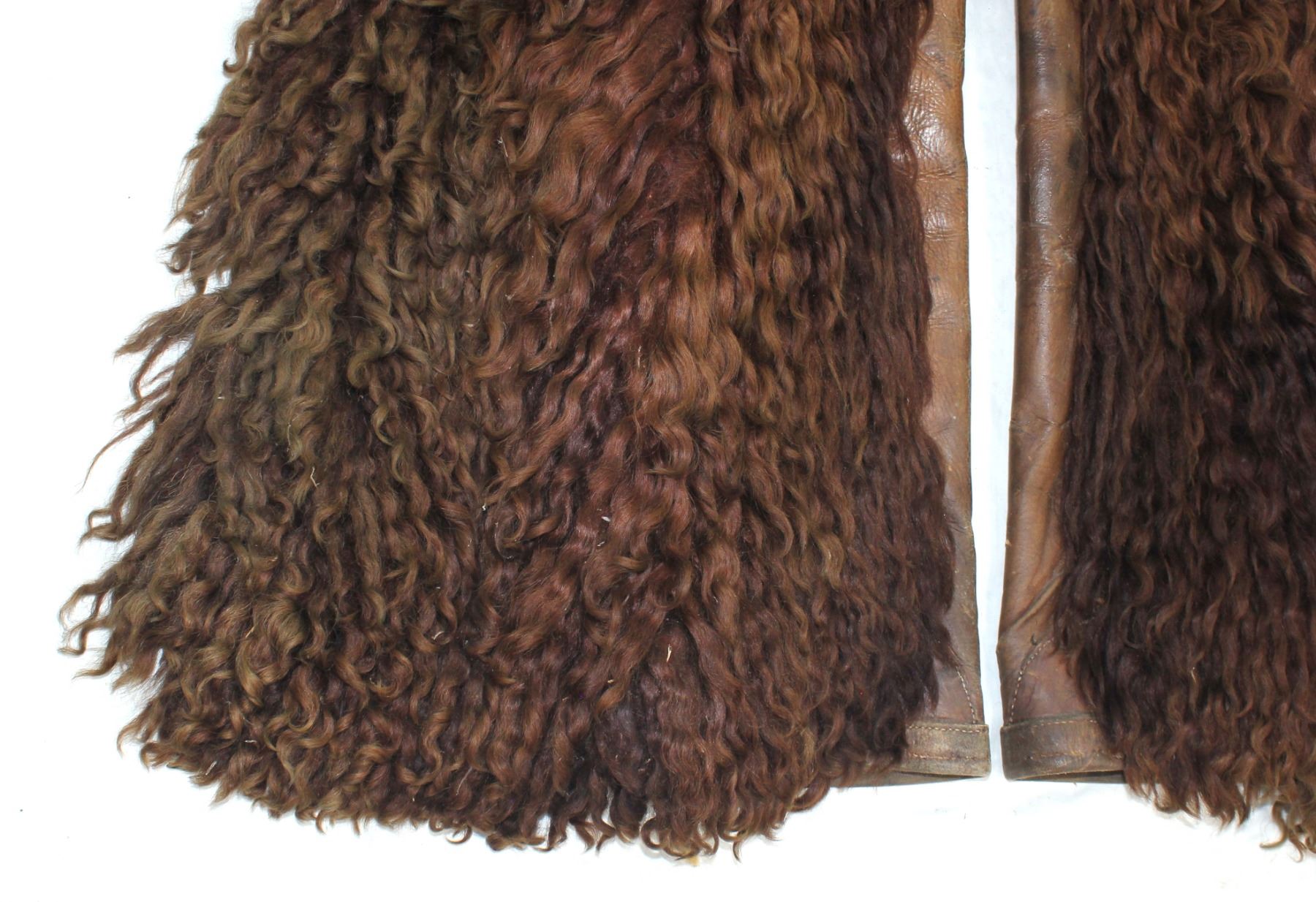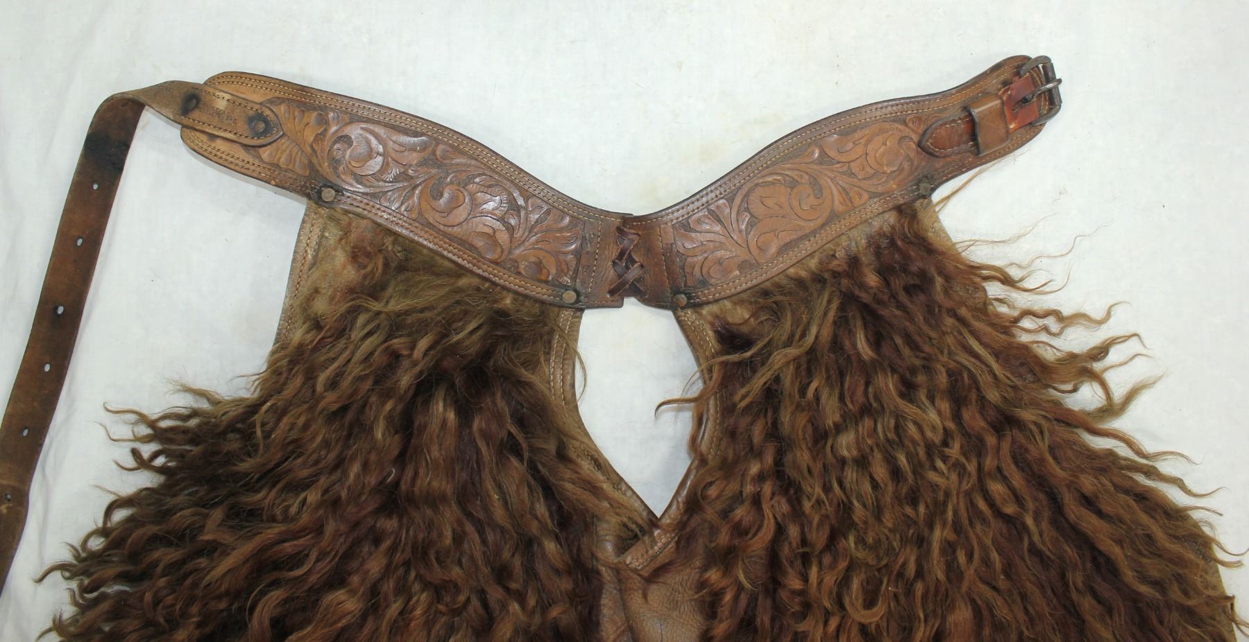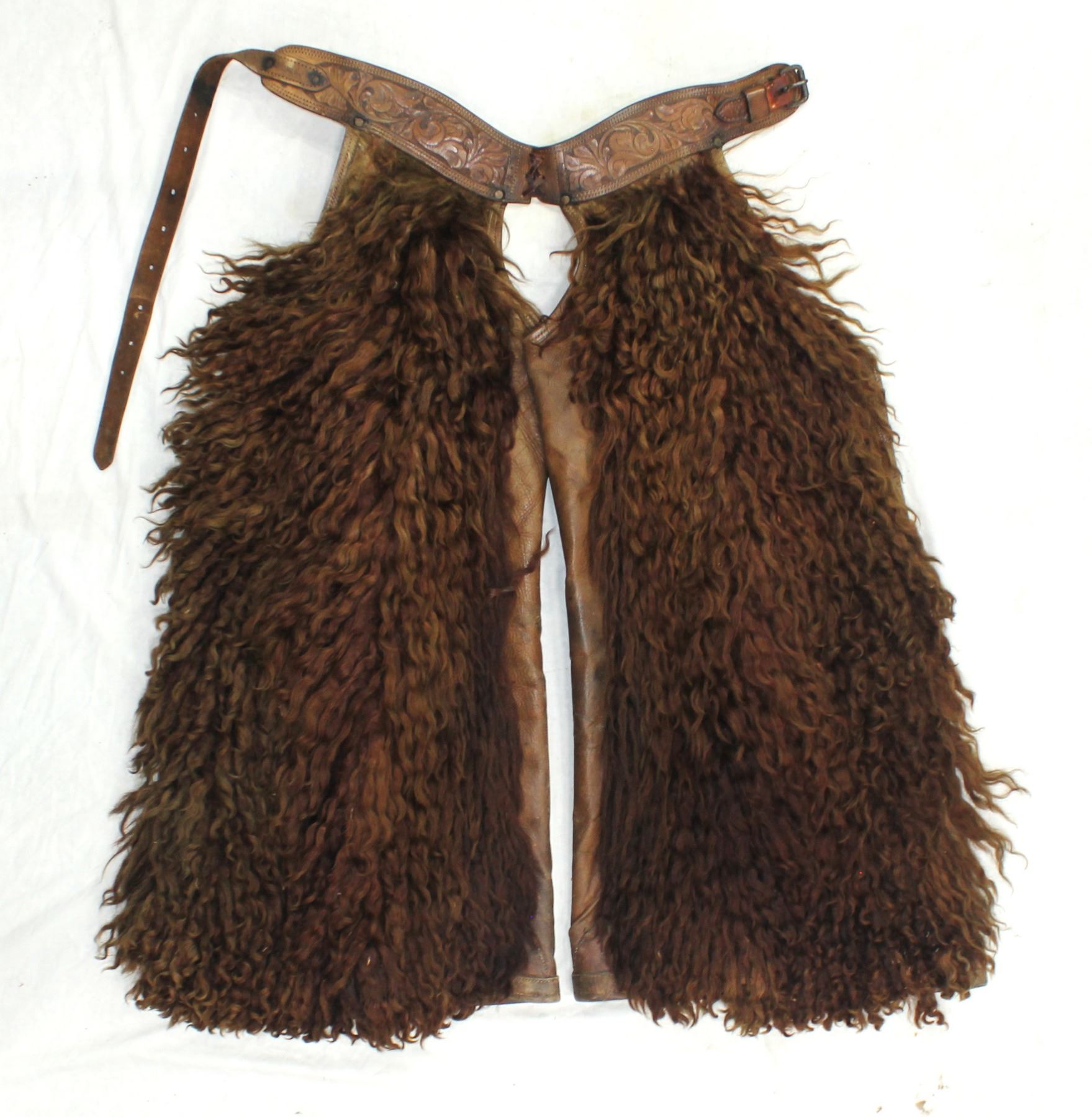 A stunning pair of very very large angora batwing chaps with an exceptionally rare light honey brown long flowing hair, and eye dazzling wide flower tooled belt.