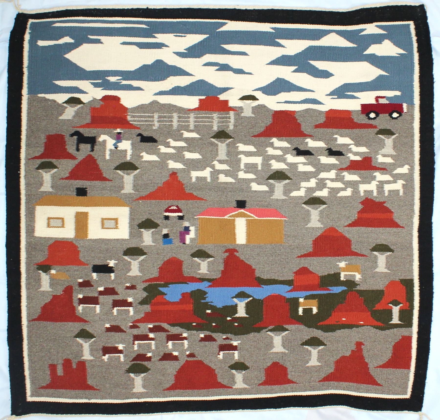 A very attractive Native American weaving with a pictorial ranching scene. In fine condition and measures 43"x 41".