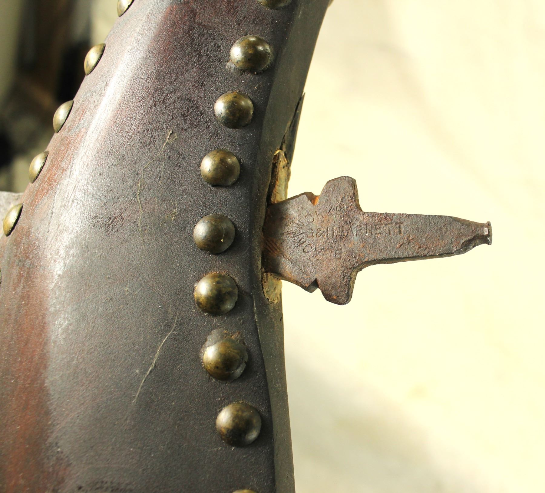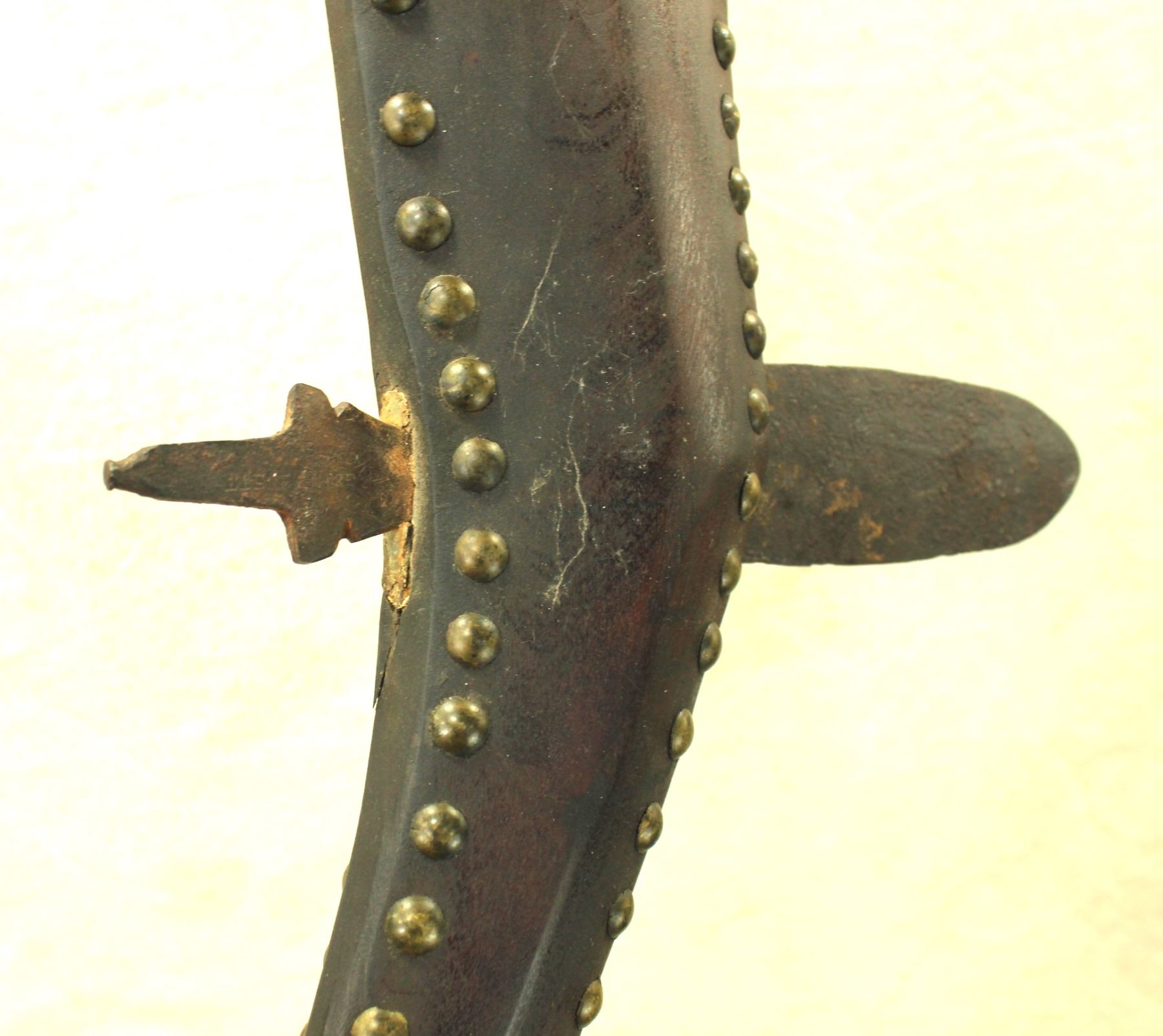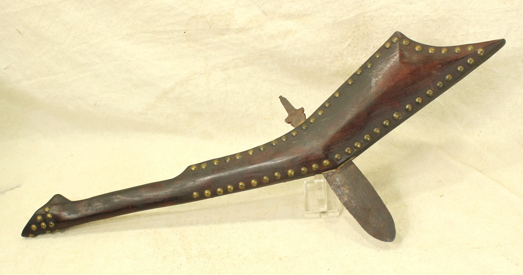 A stylish Plains Indian rifle stock style war club, shaped and contoured with a brass tack perimeter, and finished by a terrific 5" maker marked blade.