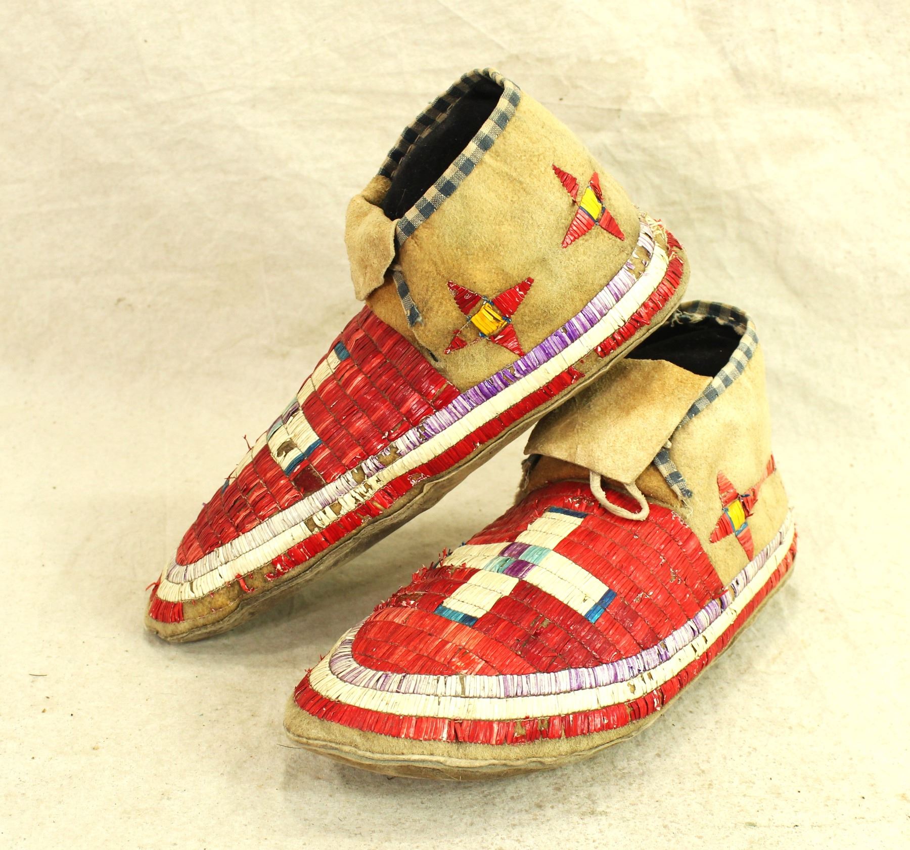 A desirable pair of man's fully quilled moccasins, with bright red colored quilwork, with white and blue crosses detailed on the toes.