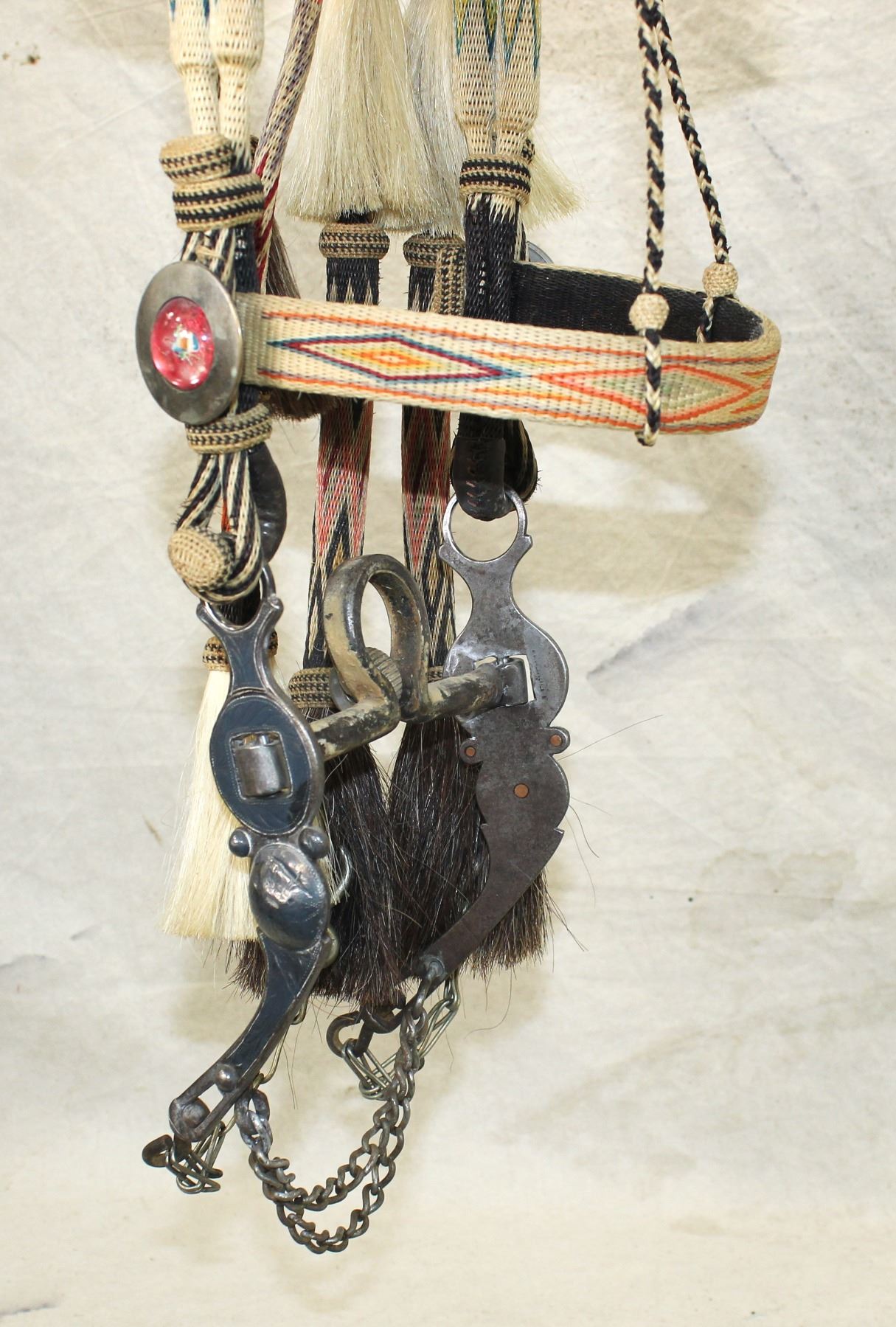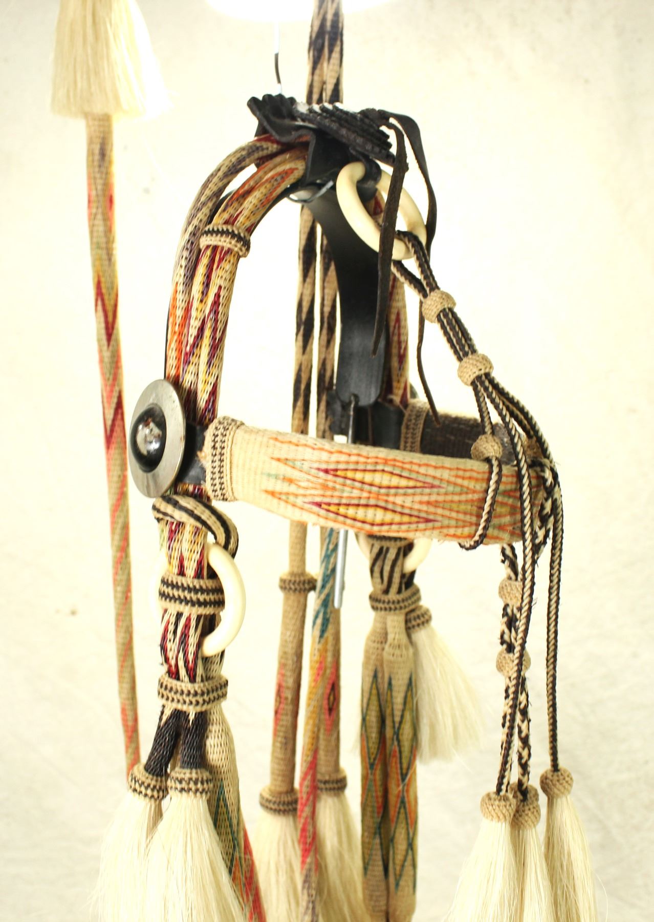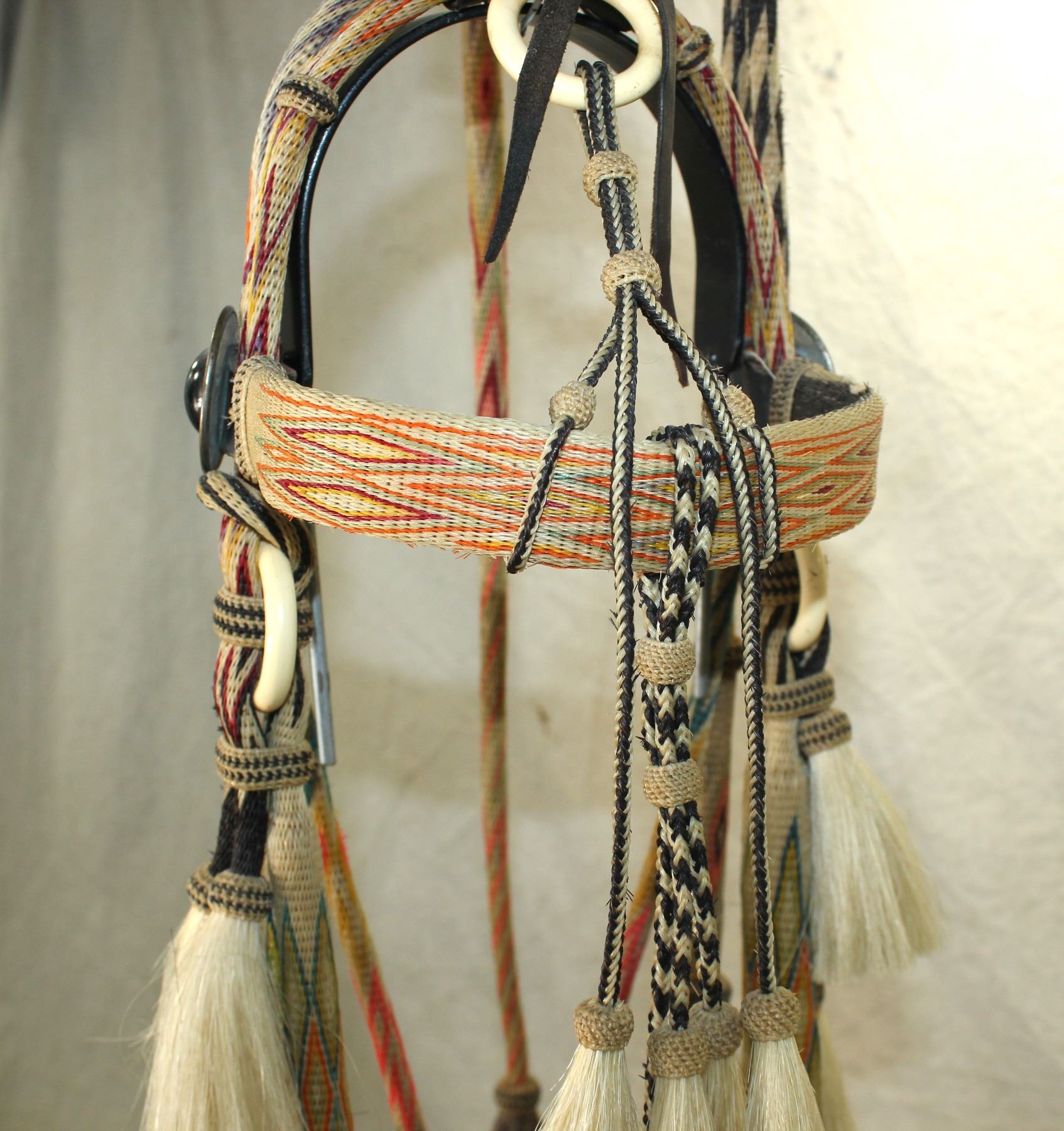A nice Montana Penitentiary made seven color hitched horsehair bridle with unique colors and geometric patterns on a white background, adorned by glass rosettes, wonderful romel reins and silver mounted bit.