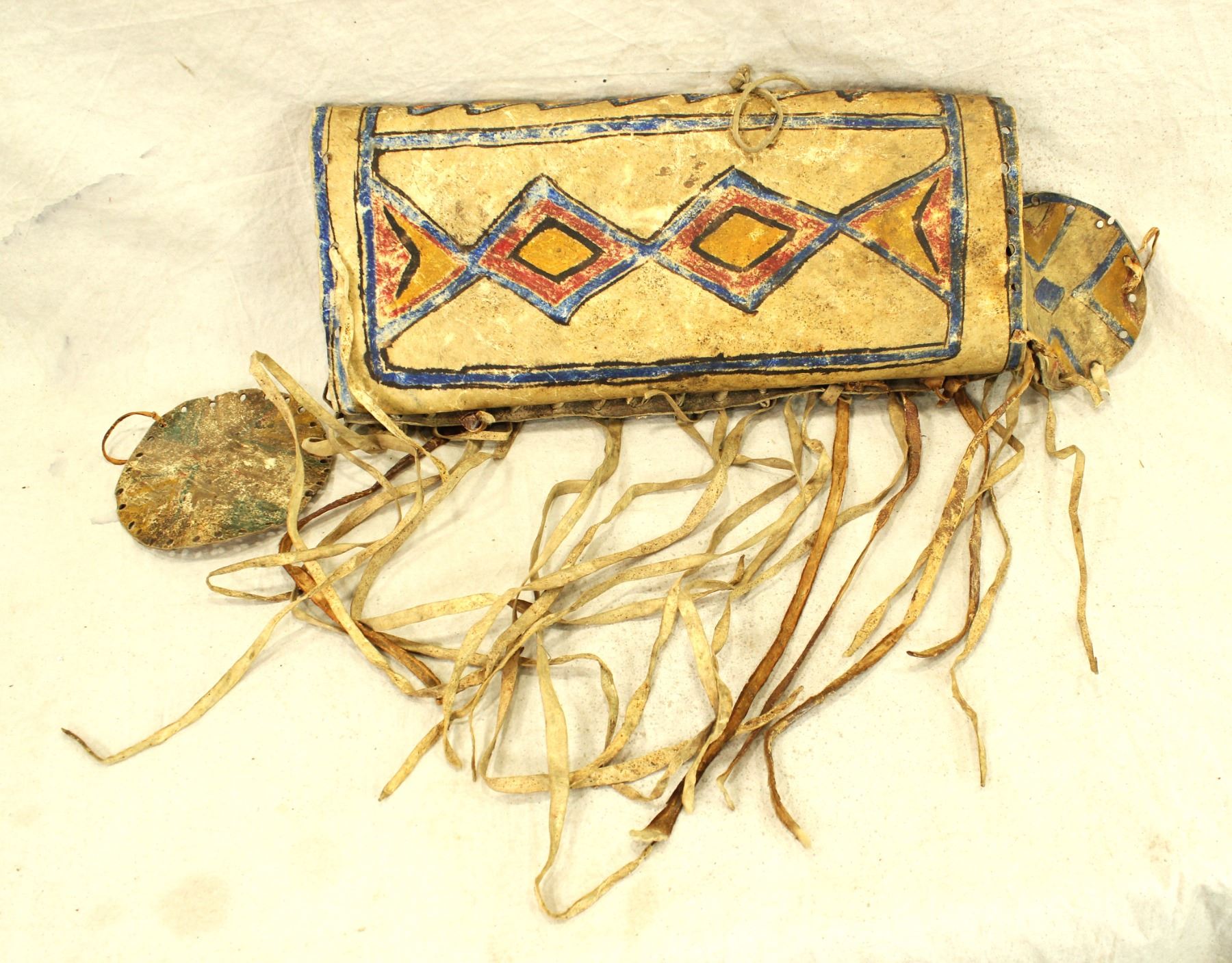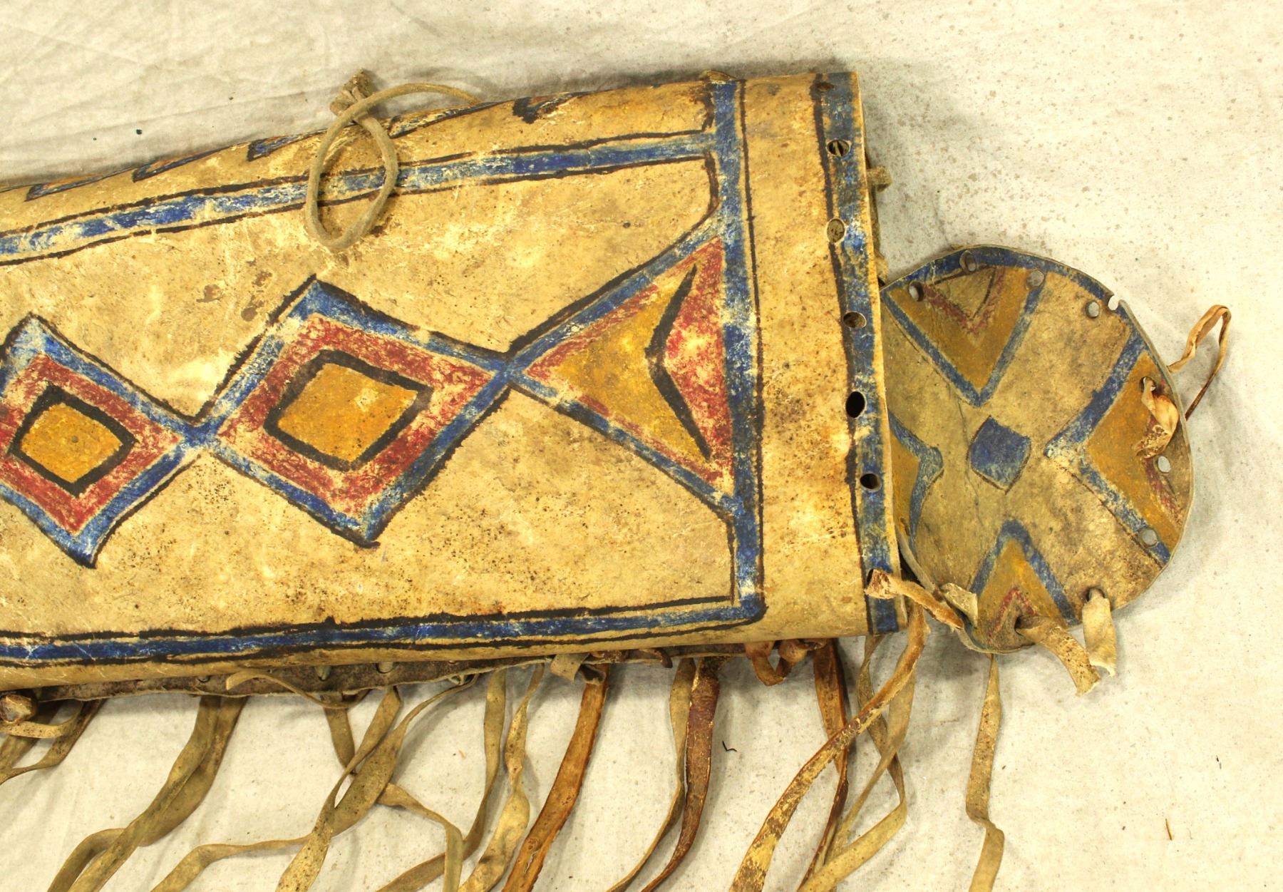 A stunning 19th Century parfleche cylinder shaped bonnet case, measusing 6"x 19", with strikingly bold colored geometric design, decorative fringe, and round capped ends.