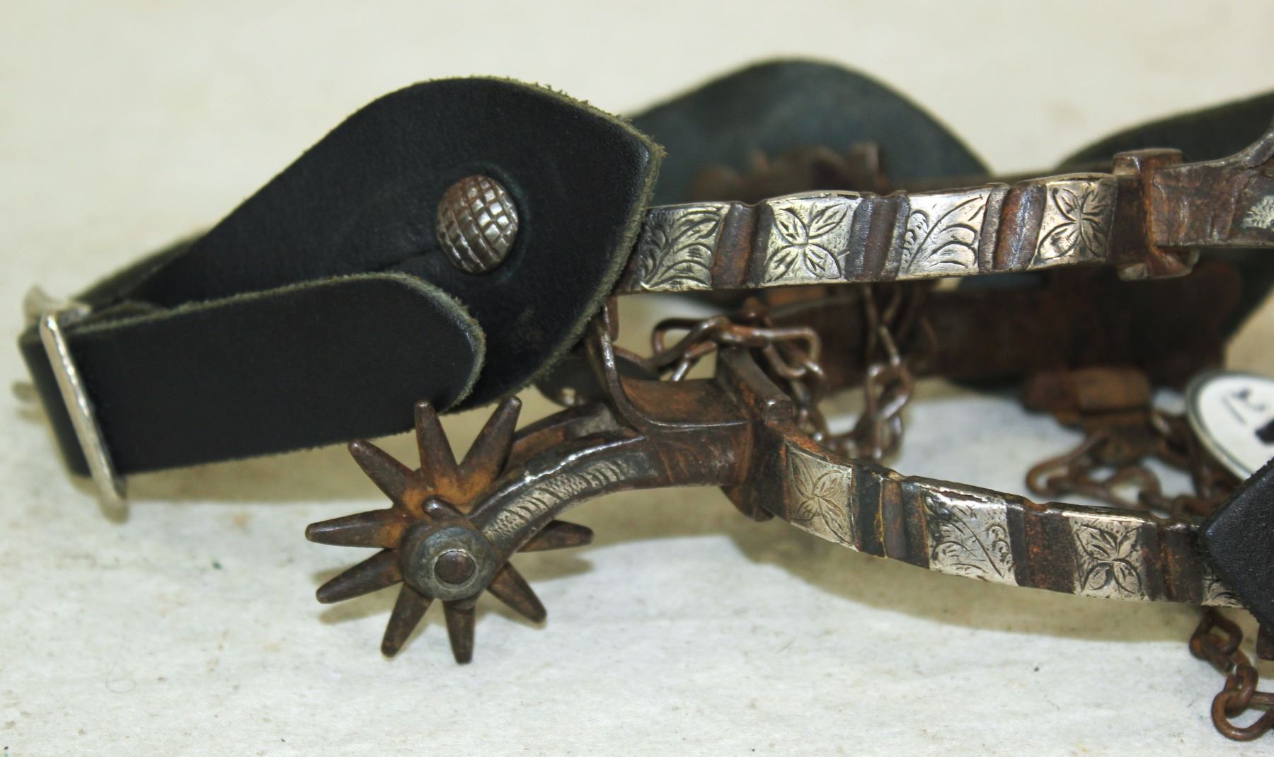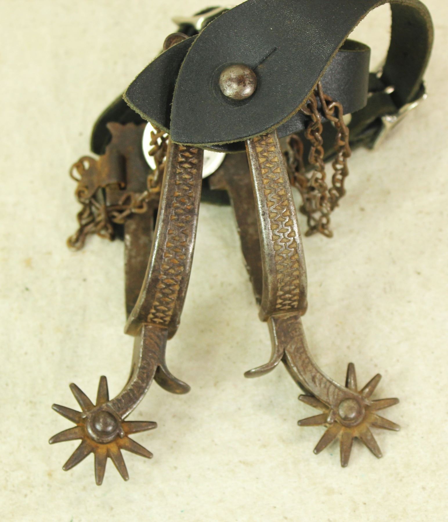 An extra early pair of single inlaid spurs with engraved silver bars, and deeply chased iron off sides. With nice condition and patina.