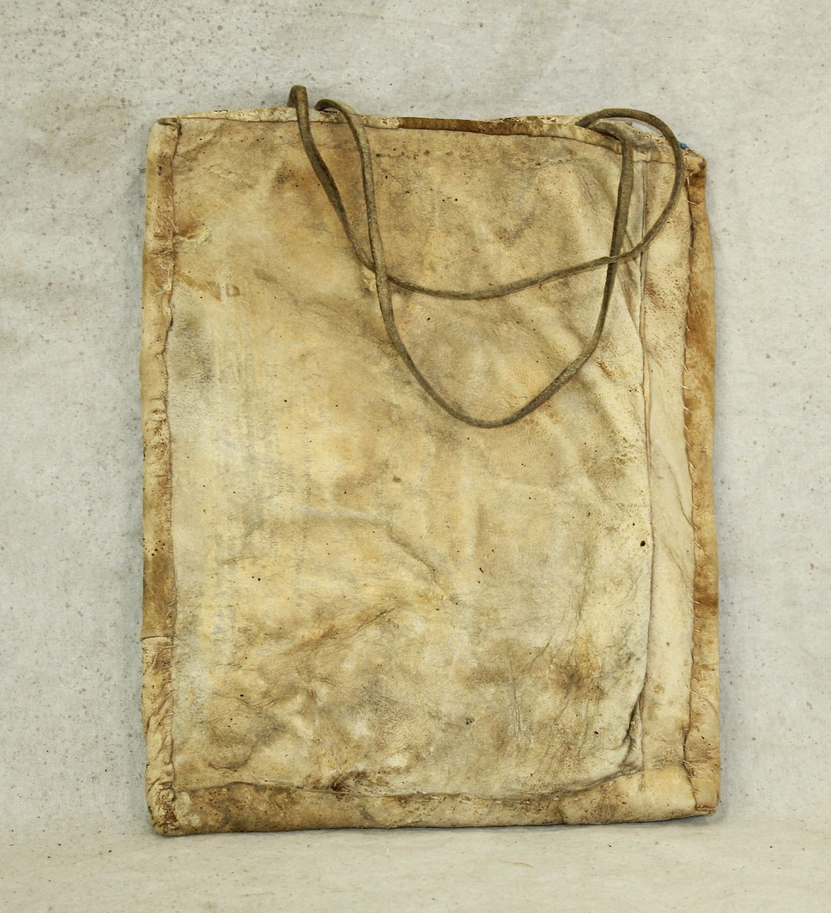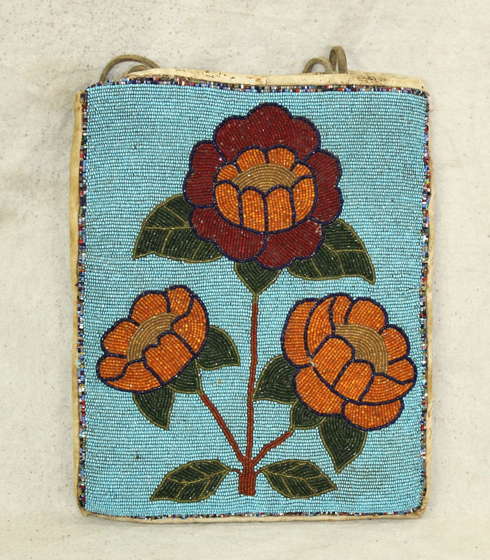 A boldly colored hide bag with wonderful full coverage cut glass beaded floral pattern. With dimensions of 9"x 11".