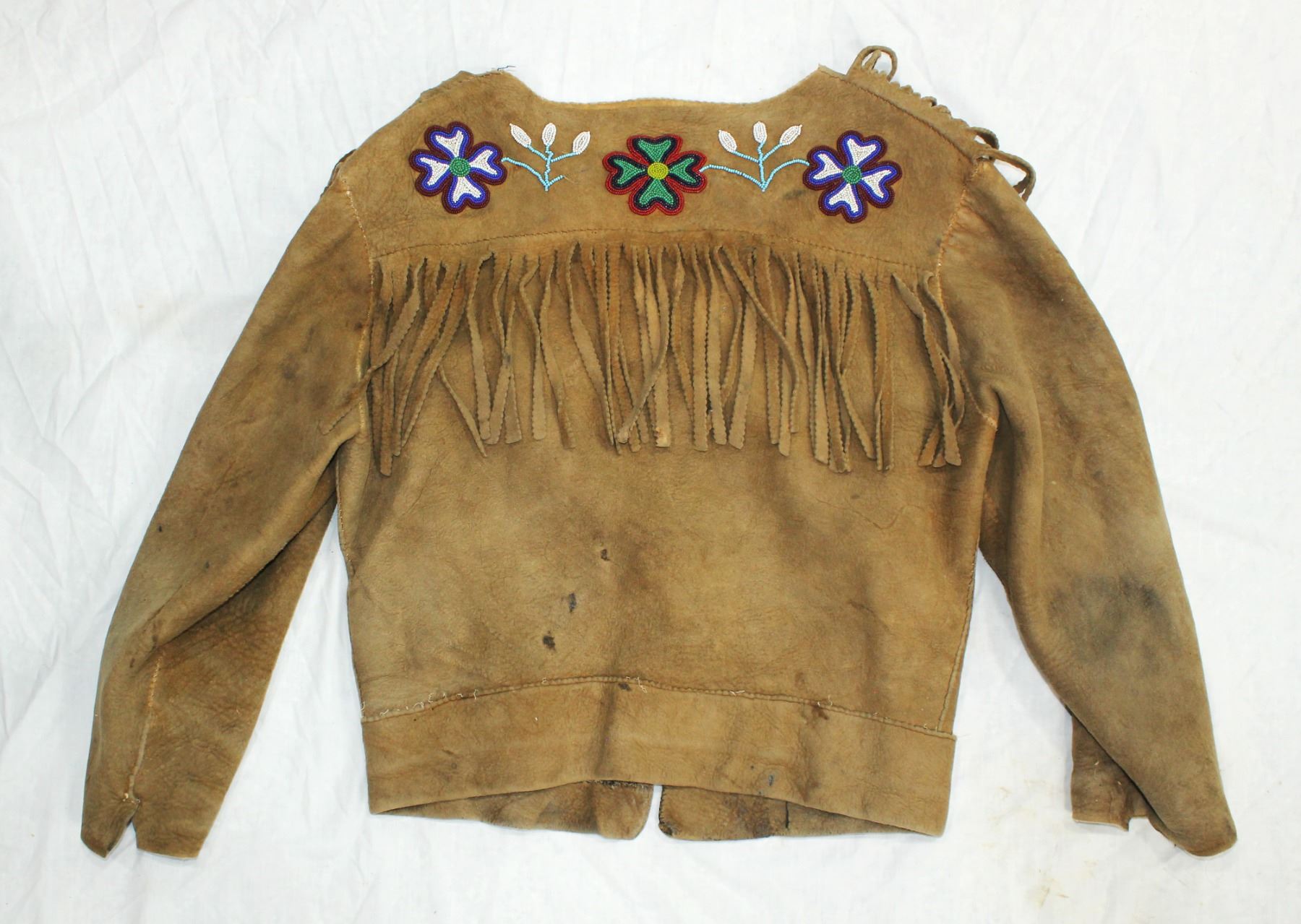 A Native American decoratively beaded moose hide shirt with a nice look and eye appeal.