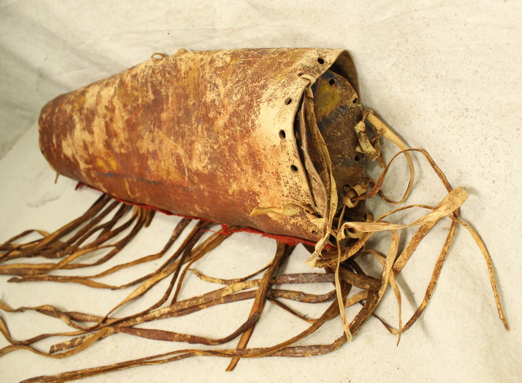 A scarce parfleche cylinder shaped bonnet case measuring 6"x 20", decoratively made with 19" fringe, geometric painted and designs and colorful ochre.